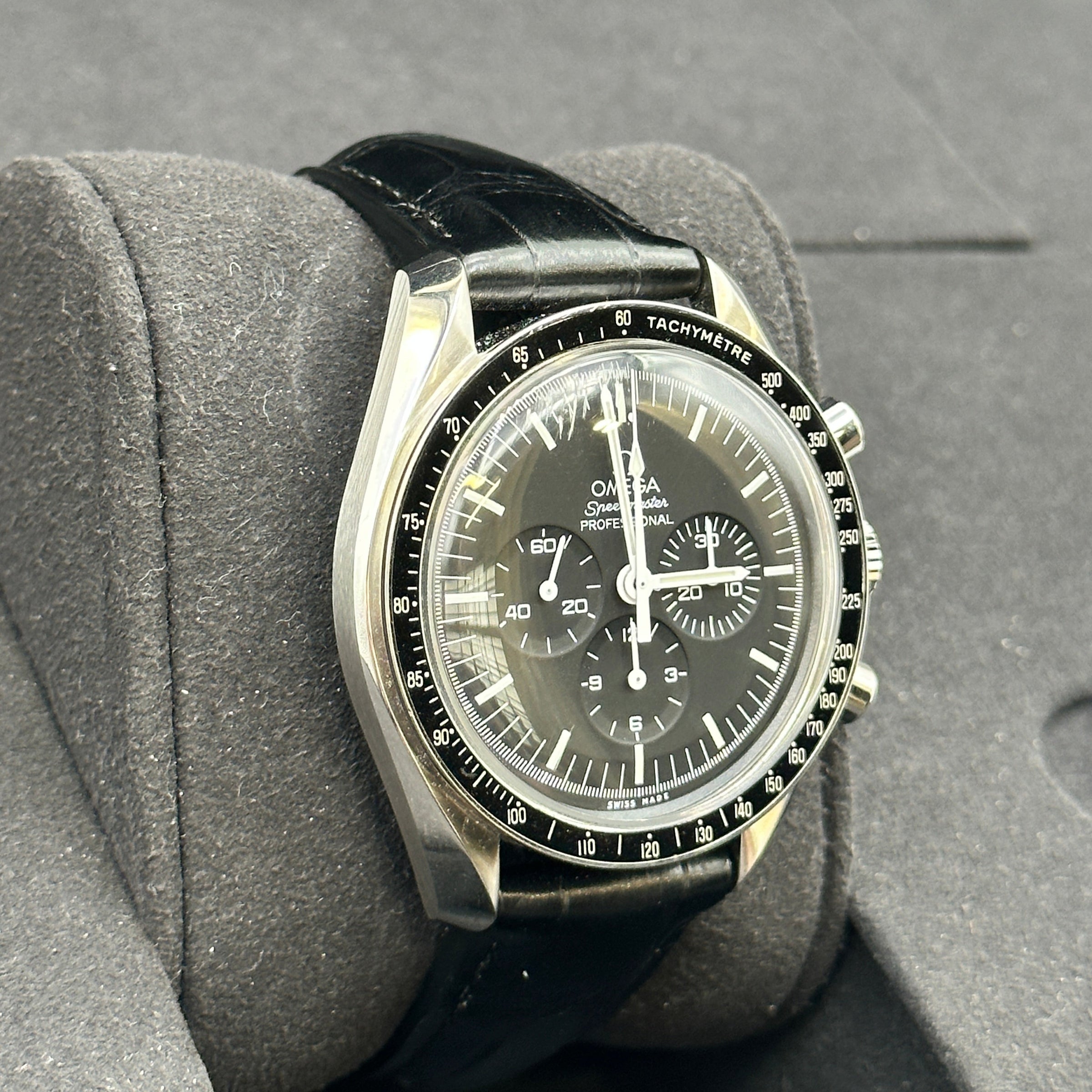 • Materials & Design: The Omega Speedmaster Professional "Moonwatch" 311.33.42.30.01.001 boasts a 42 mm stainless steel case complemented by a black alligator leather strap. Its black dial features a hesalite crystal, maintaining the classic aesthetic of the original Moonwatch.