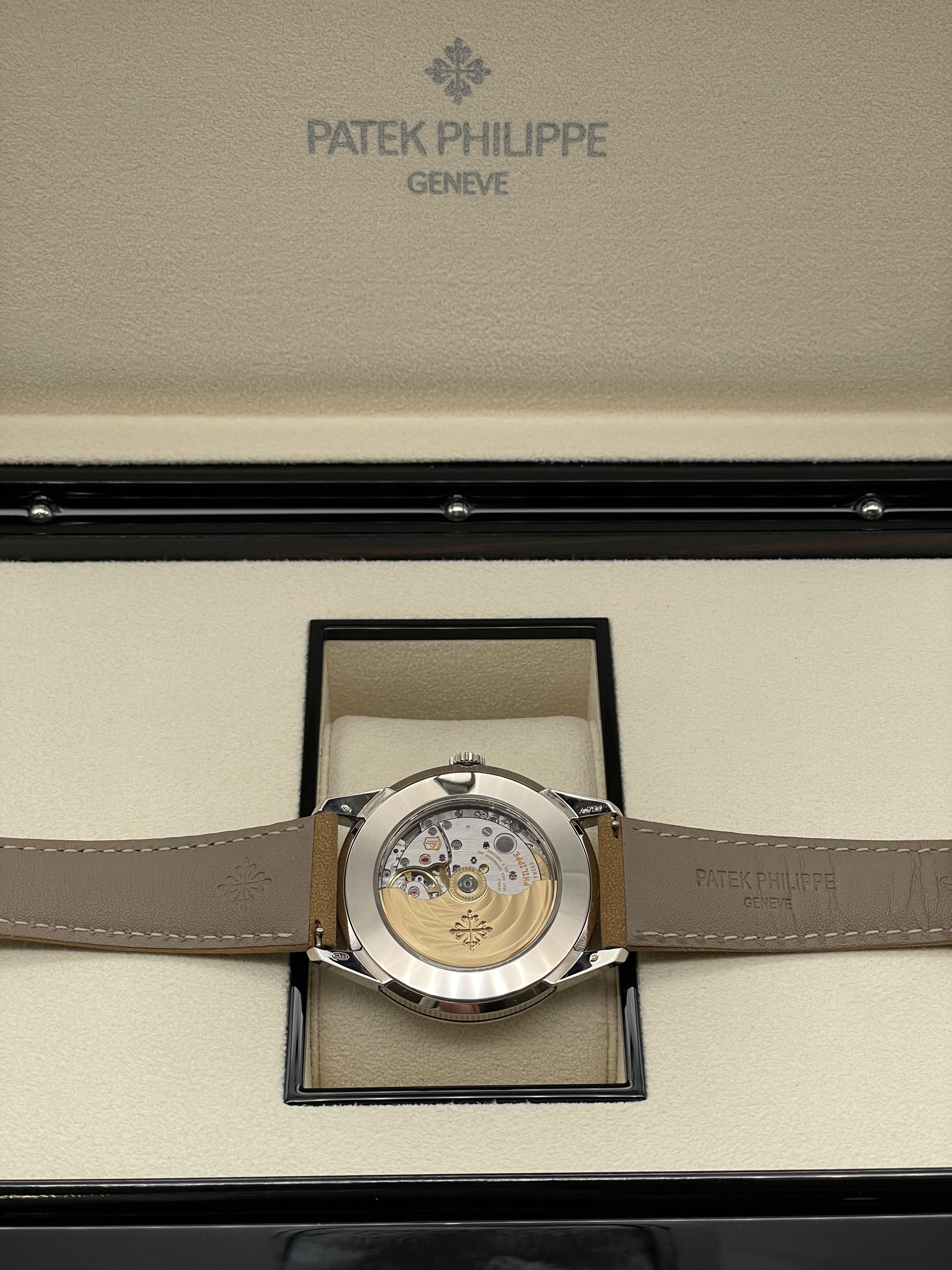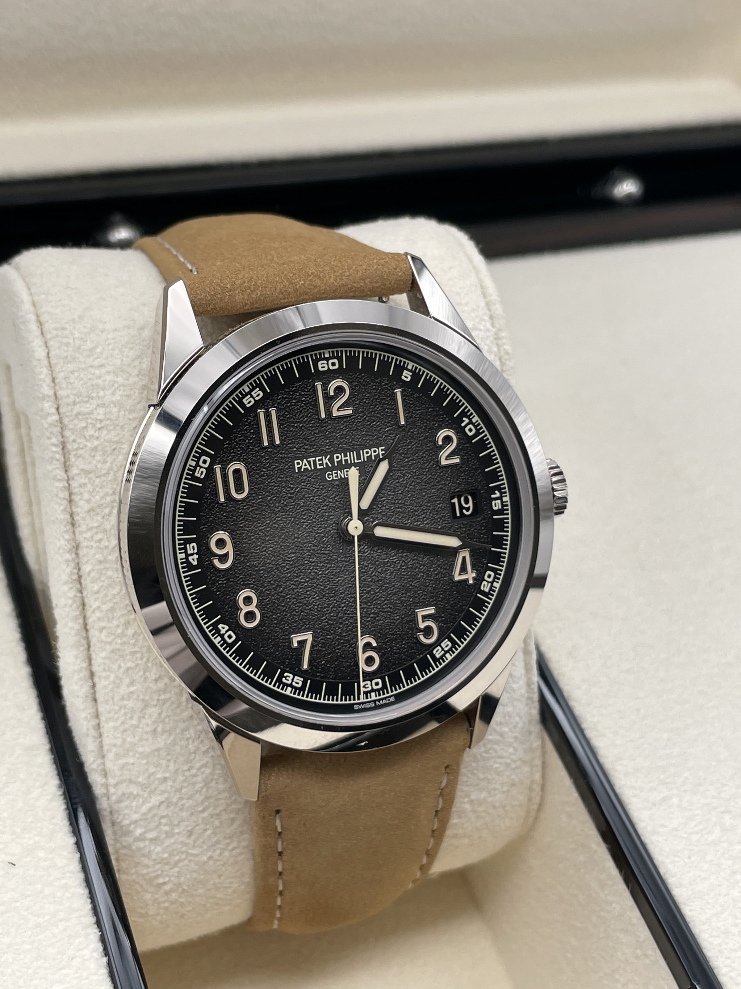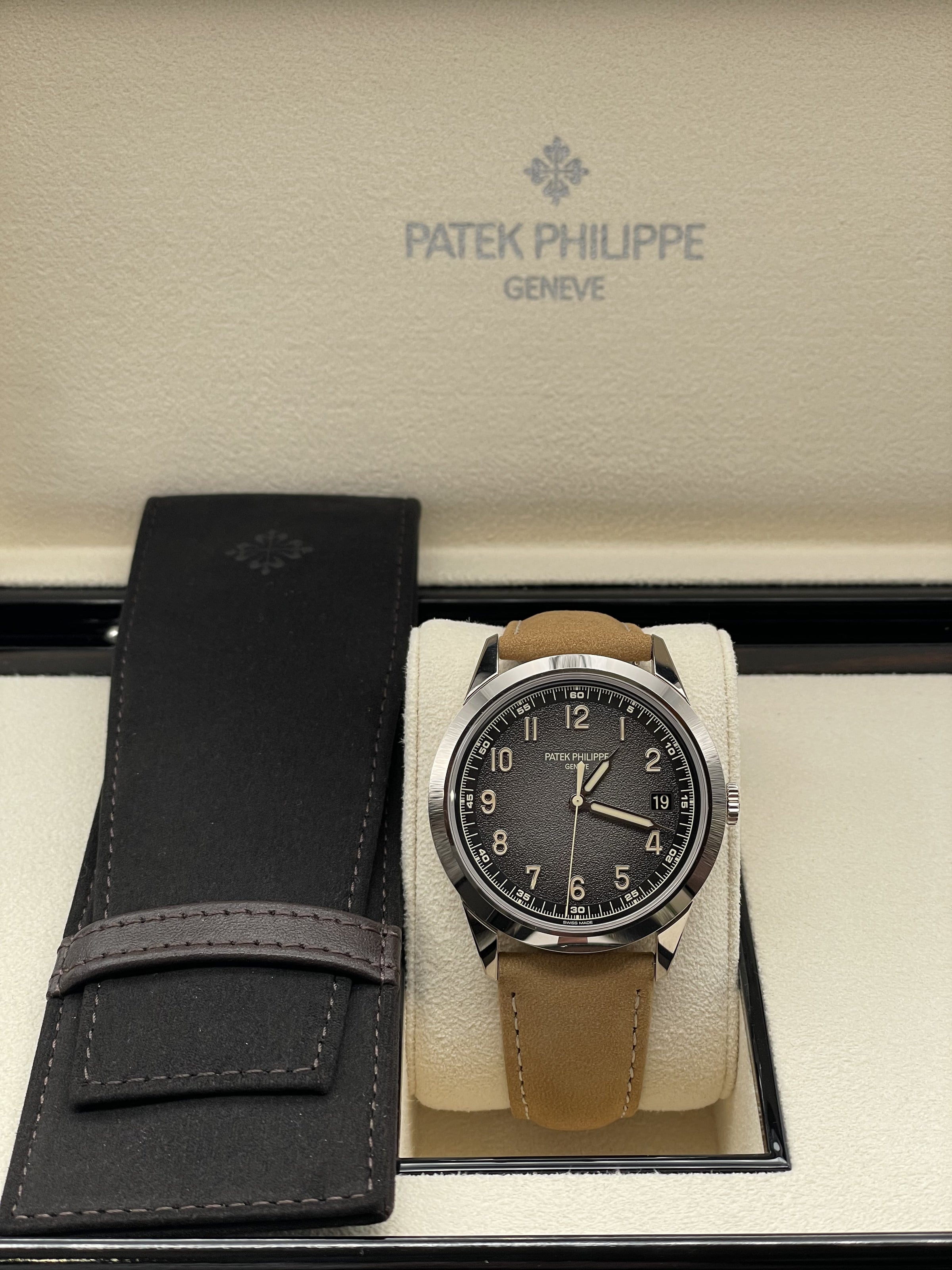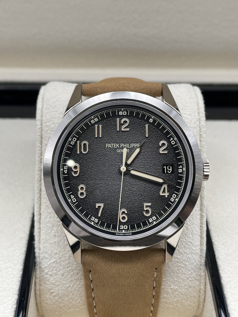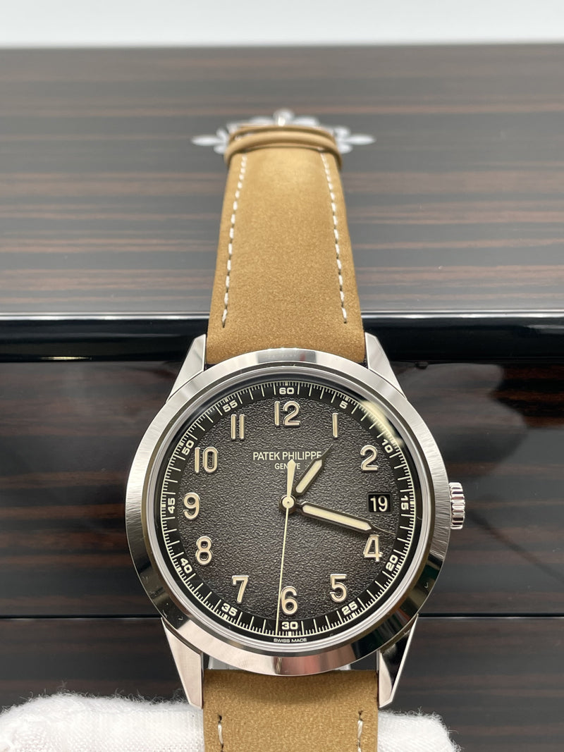 This stunning Patek Philippe features the iconic round case for which Calatrava models have been renowned since 1932 in white gold, a sapphire crystal and a hand stitched beige calfskin strap. This watch comes with a Patek Philippe box, outer box, travel case, all documentation and a spare hand stitched black calf skin strap. This new model is driven by self-winding Calibre 26-330 S C powering the hours, minutes, central seconds, aperture-type date and stop-seconds mechanism.