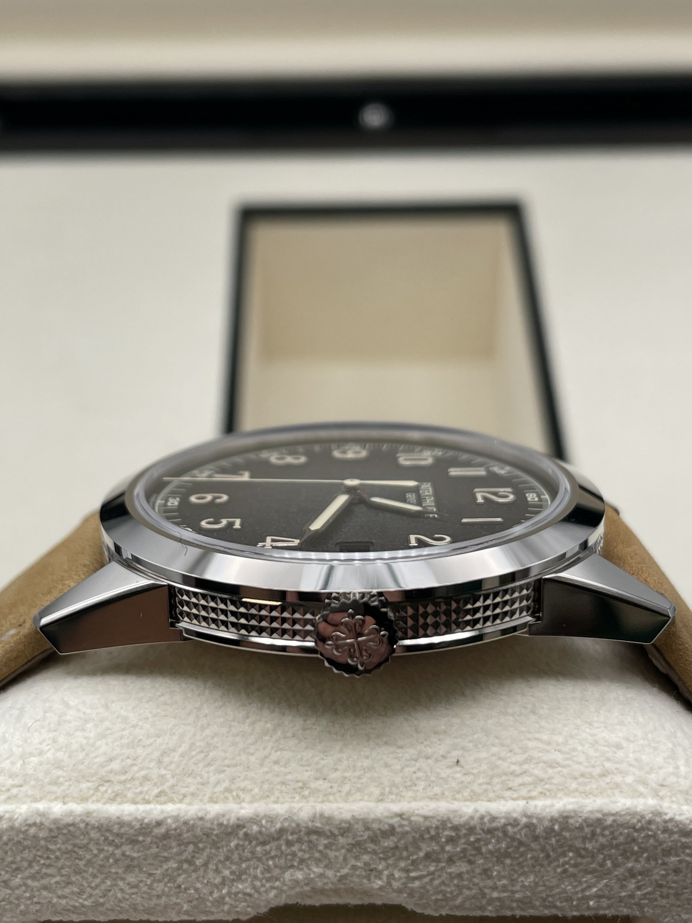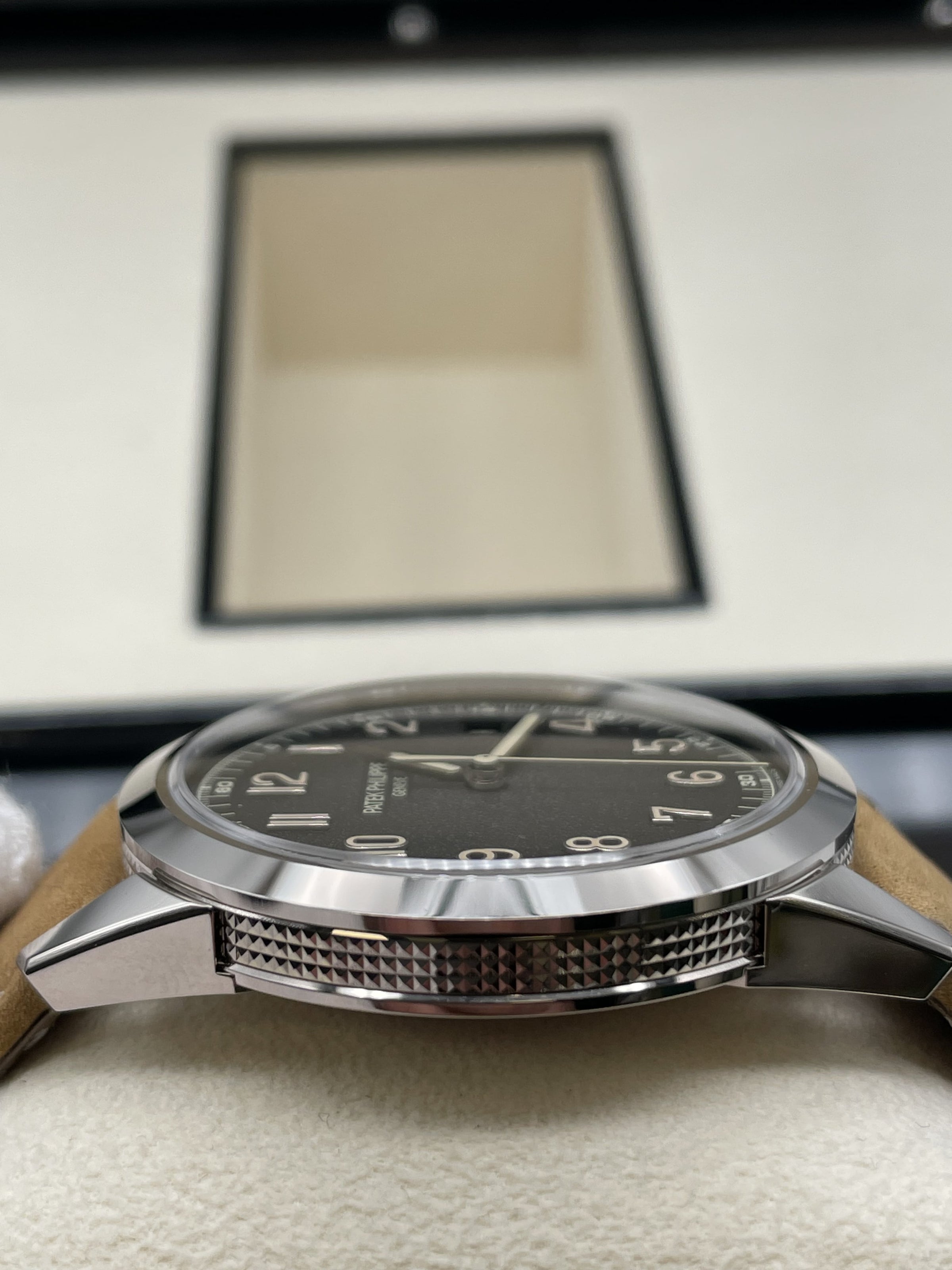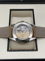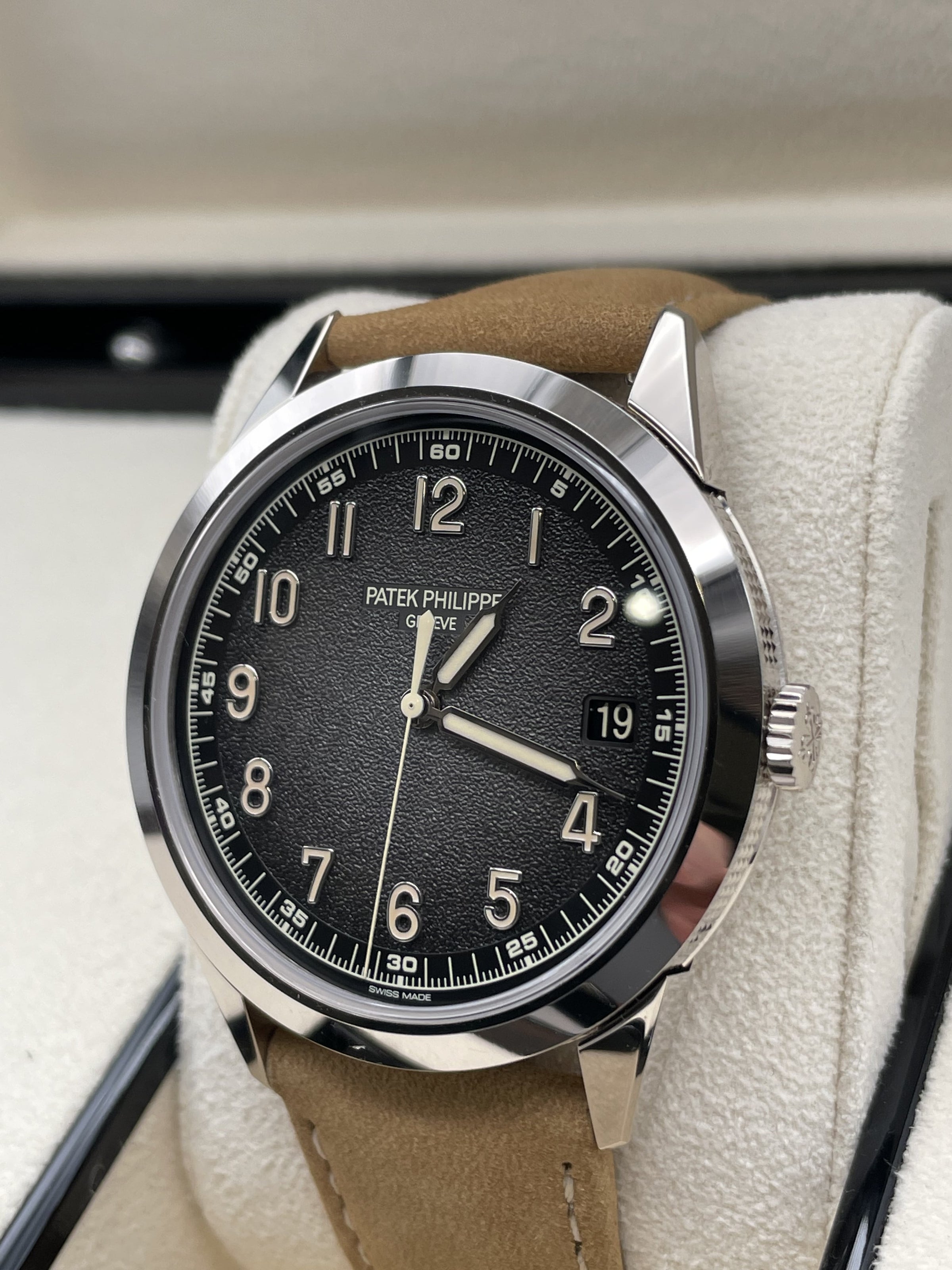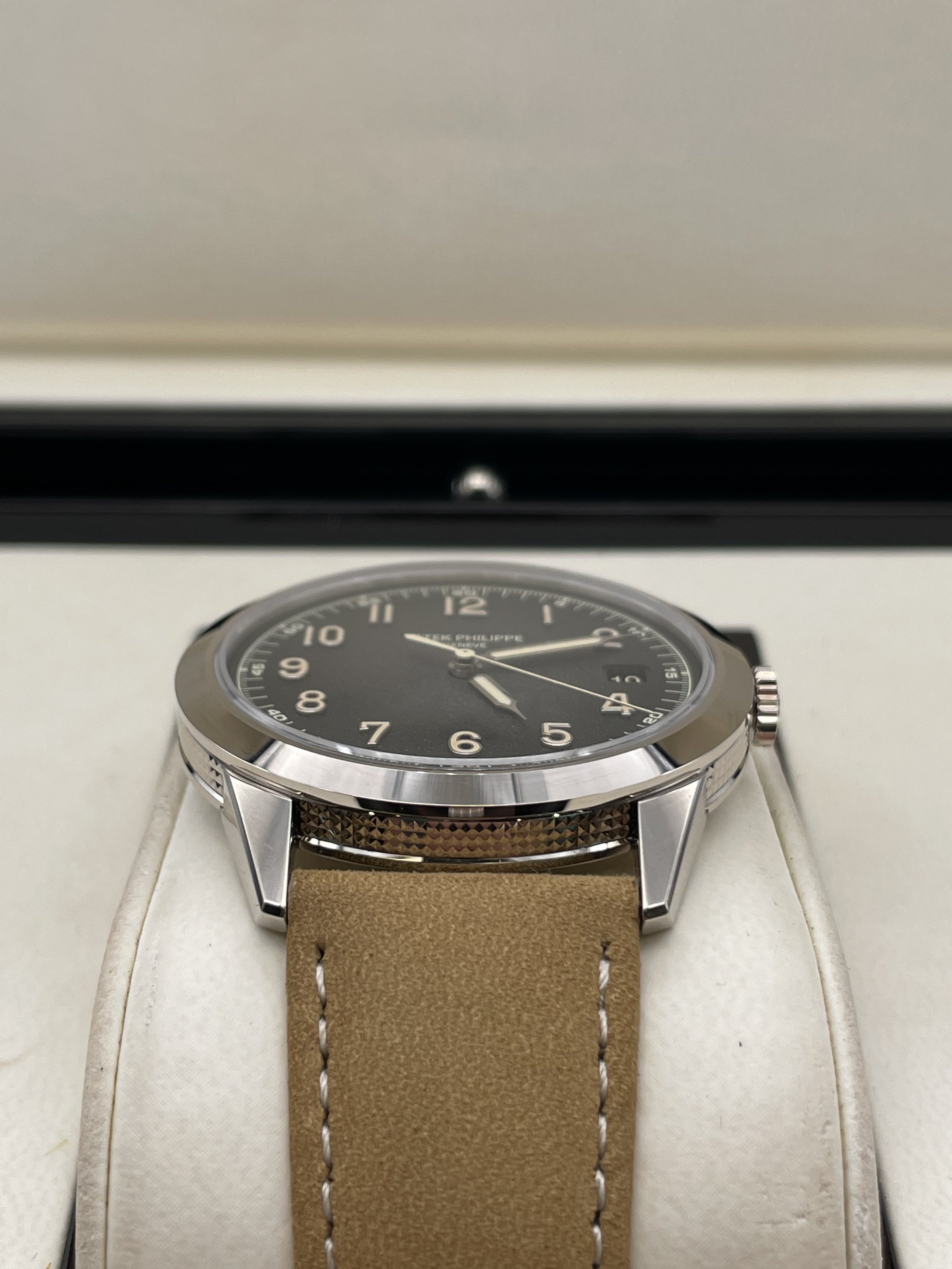 This stunning Patek Philippe features the iconic round case for which Calatrava models have been renowned since 1932 in white gold, a sapphire crystal and a hand stitched beige calfskin strap. This watch comes with a Patek Philippe box, outer box, travel case, all documentation and a spare hand stitched black calf skin strap. This new model is driven by self-winding Calibre 26-330 S C powering the hours, minutes, central seconds, aperture-type date and stop-seconds mechanism.