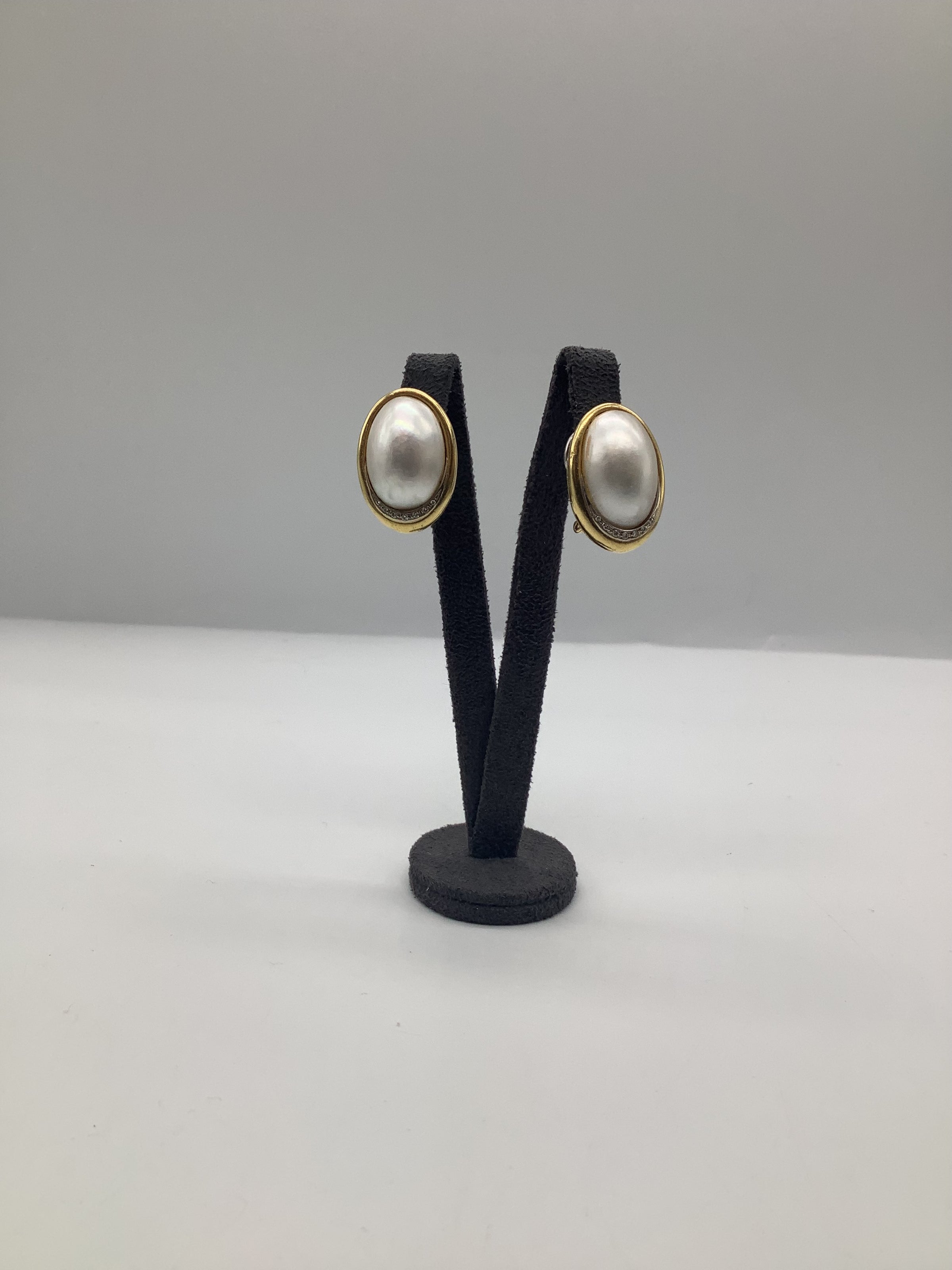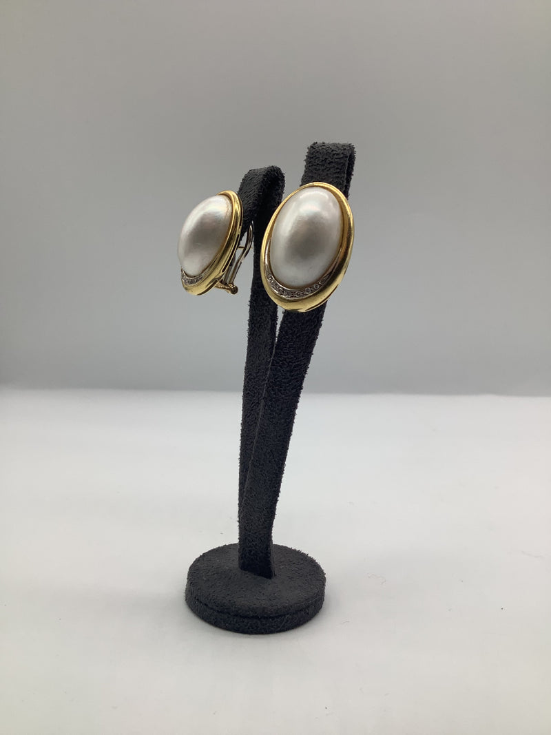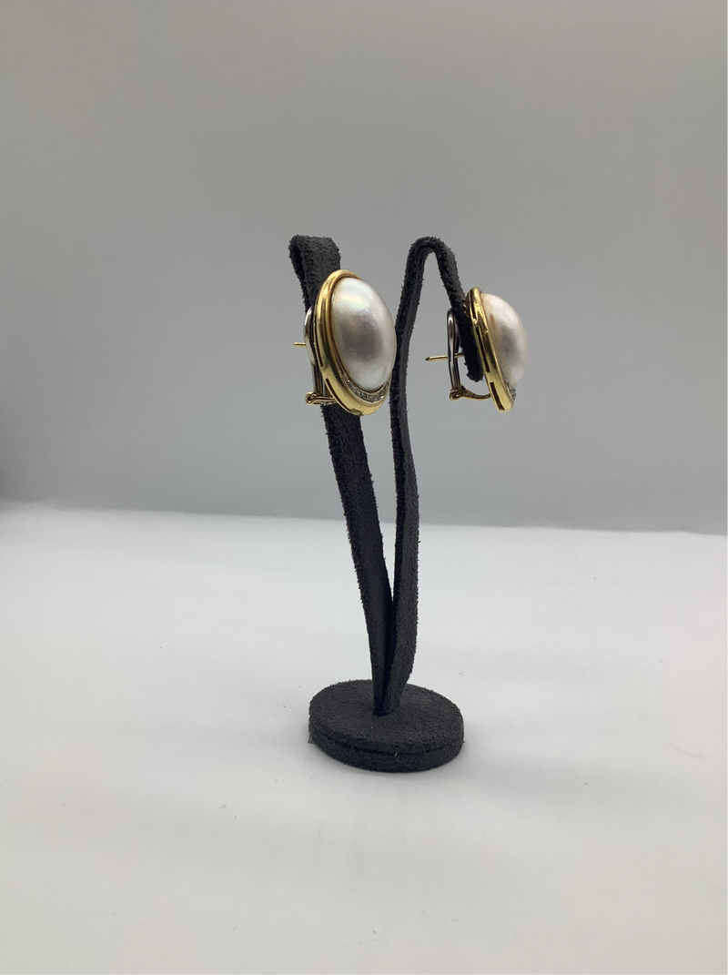 Exquisite Mabe Pearl and Diamond Earrings, meticulously crafted in 18ct yellow gold oversized studs. Each earring showcases a lustrous Mabe pearl, celebrated for its radiant nacre and substantial presence. Encircling the pearls are brilliant-cut diamonds, enhancing their natural allure. The 18ct yellow gold setting provides a warm, opulent backdrop, ensuring both durability and timeless elegance. These oversized studs make a bold yet sophisticated statement, perfect for discerning individuals who appreciate luxury and distinctive design.