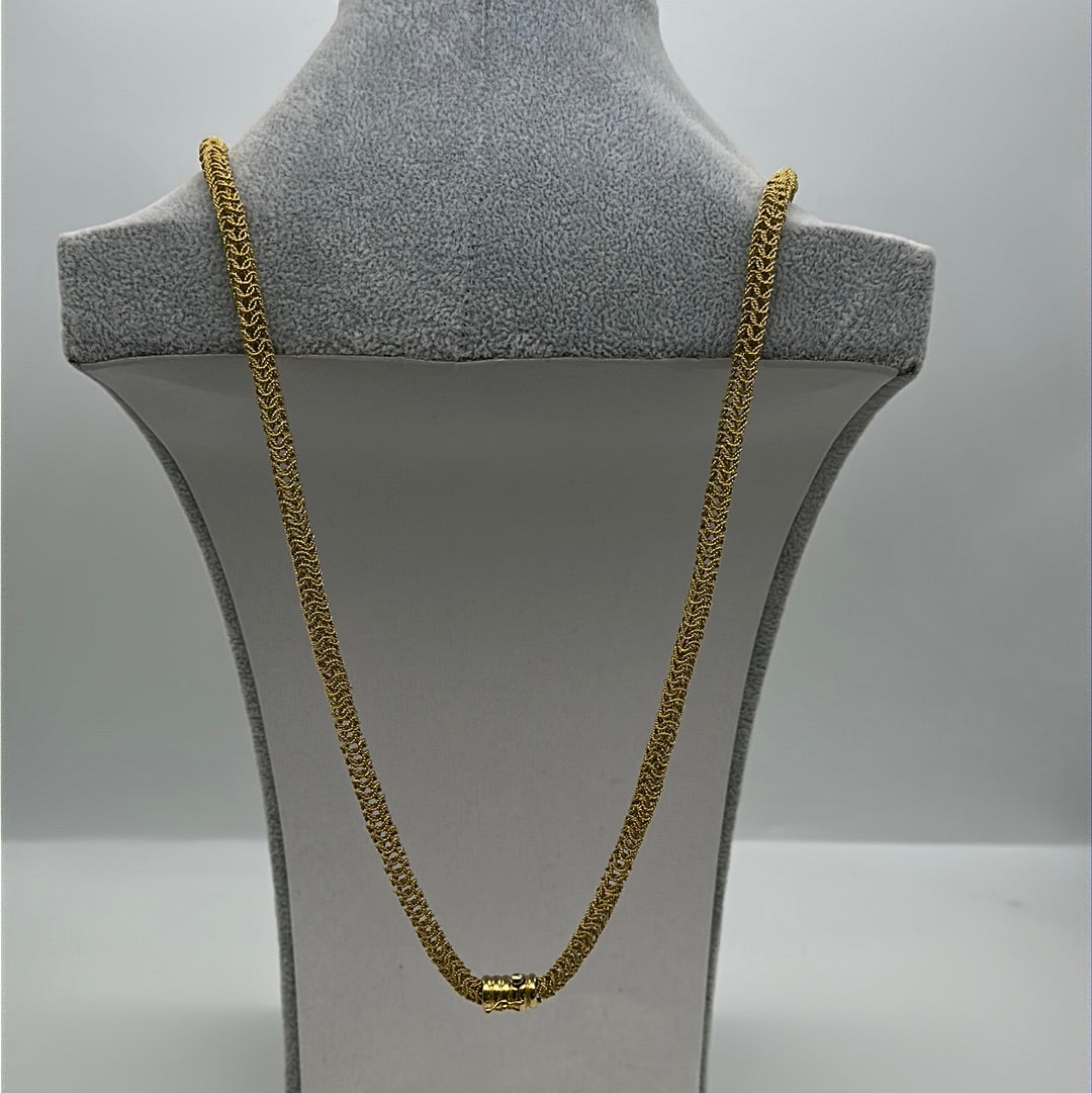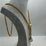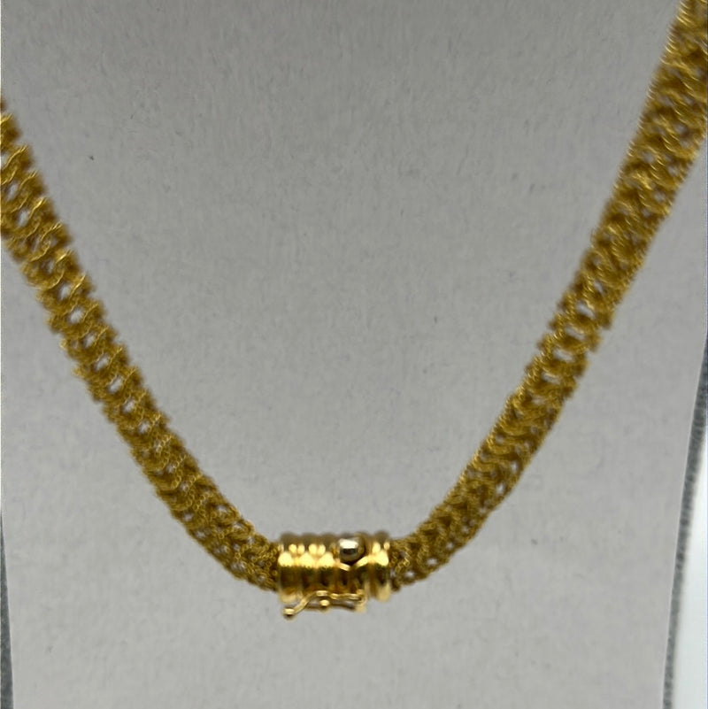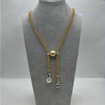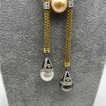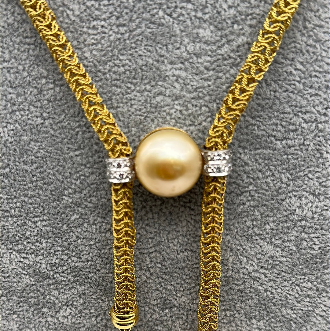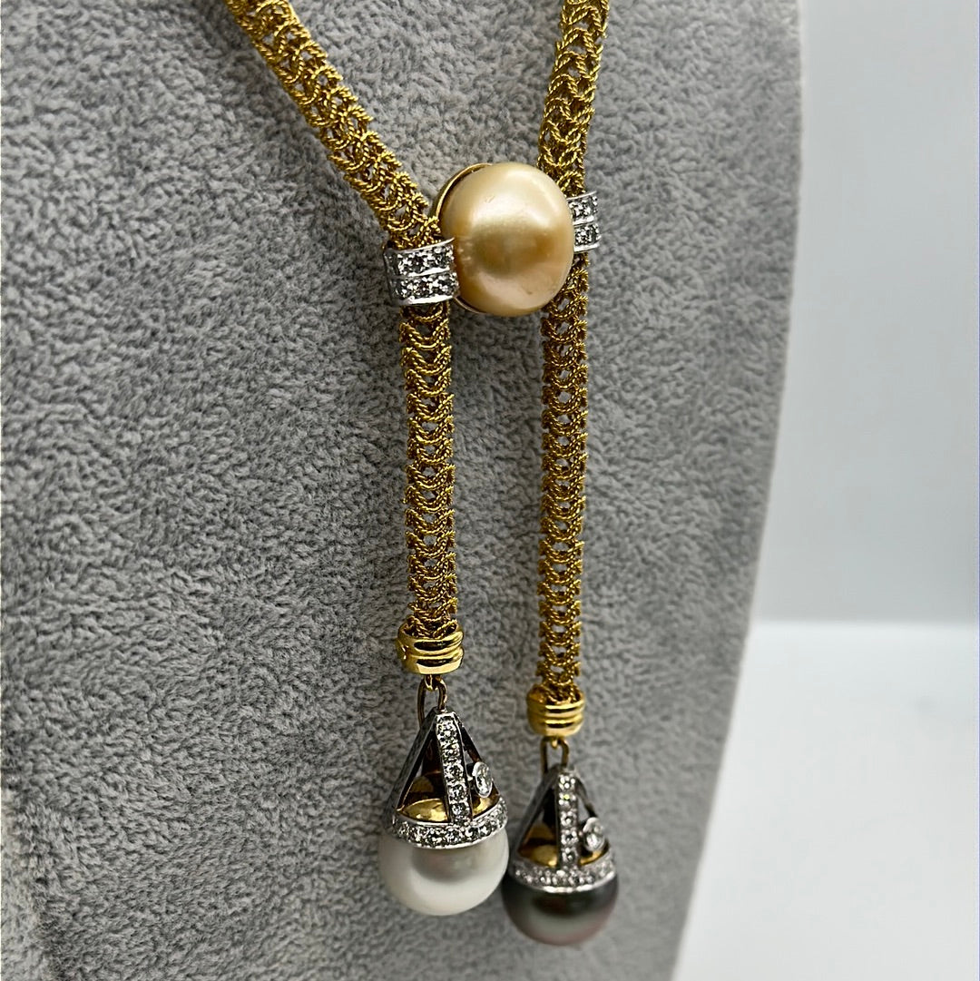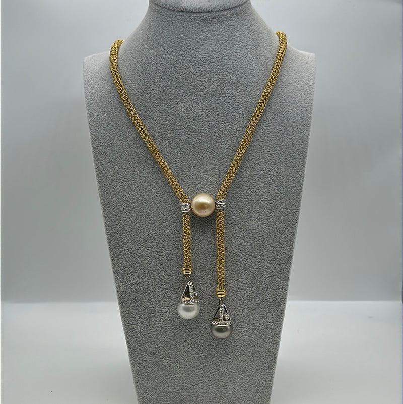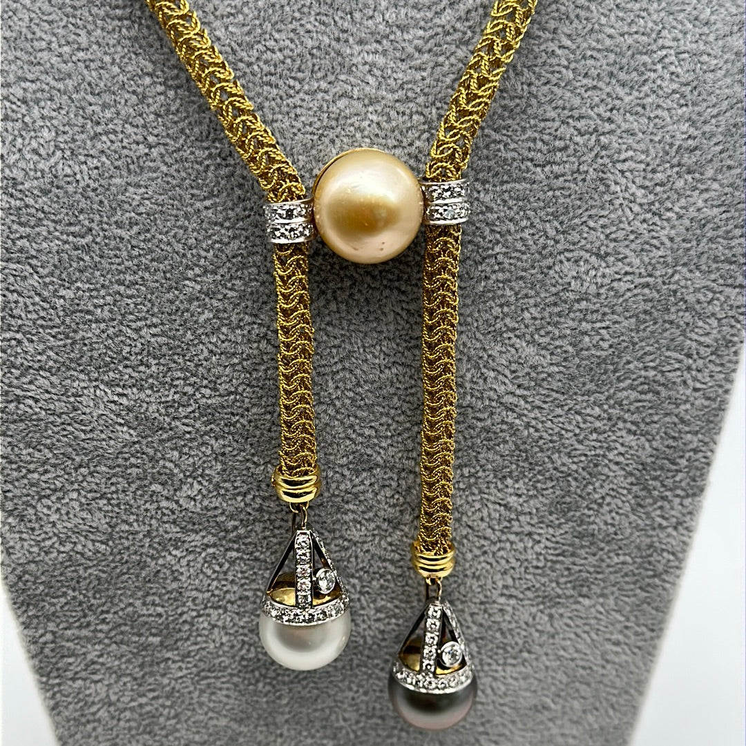 Hand Made 18ct Yellow Gold Woven Chain Set With Three Large Cultured Pearls In Cream, White And Grey, Cream Pearl Attached To The Necklace By Four Rings Of Brilliant Cut Diamonds. The Grey And White Pearls Are Caped With A Cone Shaped Diamond Bail Set With One Large Brilliant Cut Diamond In Each And Small Brilliant Cut Diamonds Pave Set In 18ct White Gold.