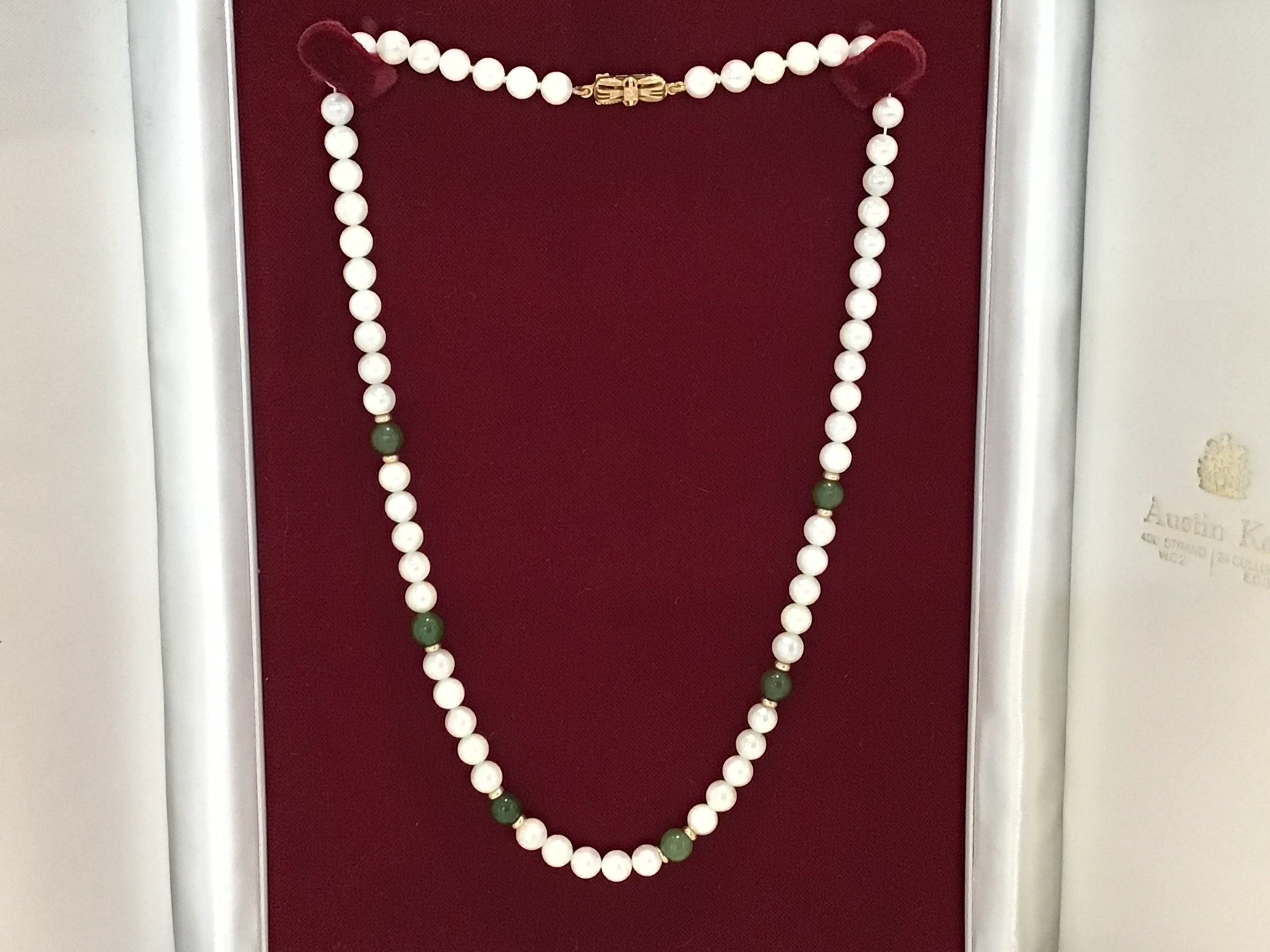 Beautiful Cultured Pearl Necklace with 9ct Gold Clasp and Beads, which sit either side of polished Jade Beads, interspersed with the pearls