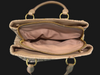 Features: The bag includes two top handles for hand carry. The interior is soft pink lined and features pockets to organize essentials efficiently. There are three main compartments to this bag. The middle central compartment has a zipper fastener and the inside is one simple open area. Either side are open compartments, one with two mini side storage areas and on the opposite compartment a side zipper compartment and another open side compartment. There are strap hooks for a shoulder strap (not included).