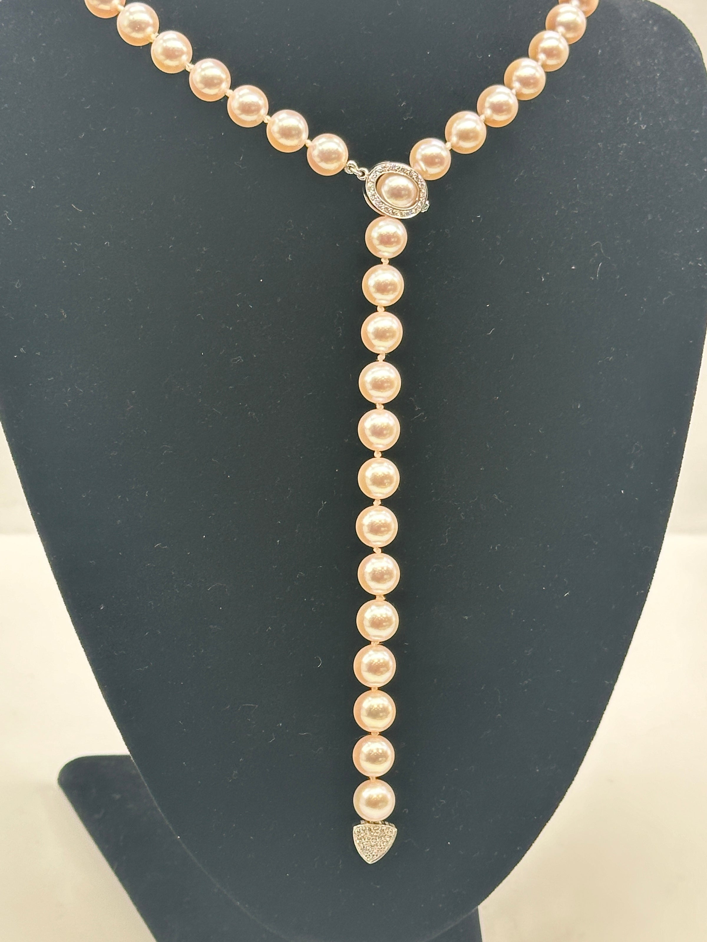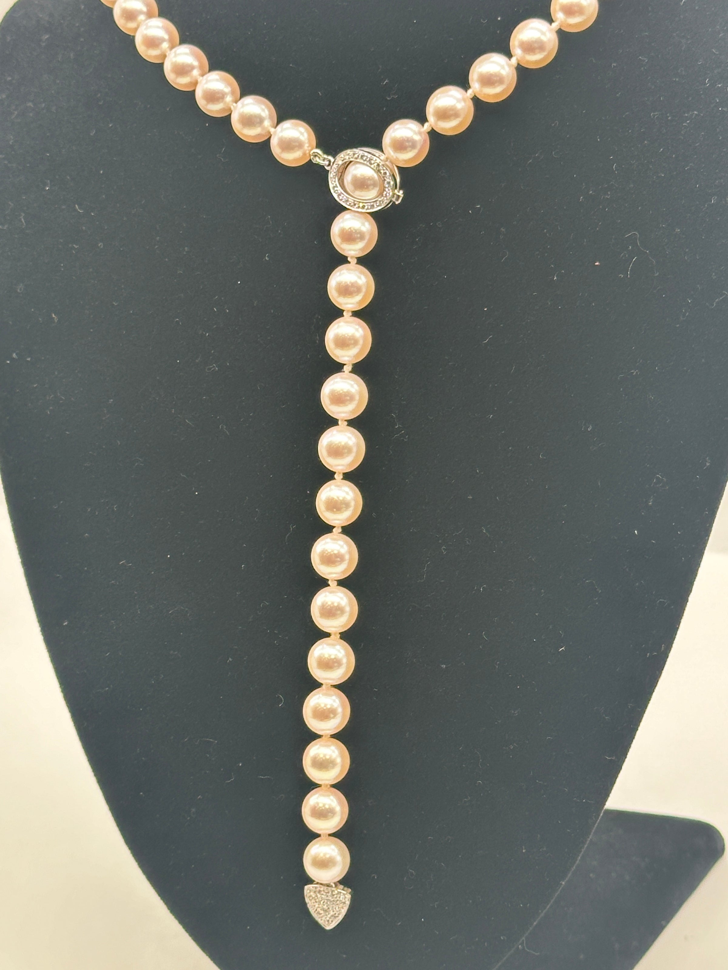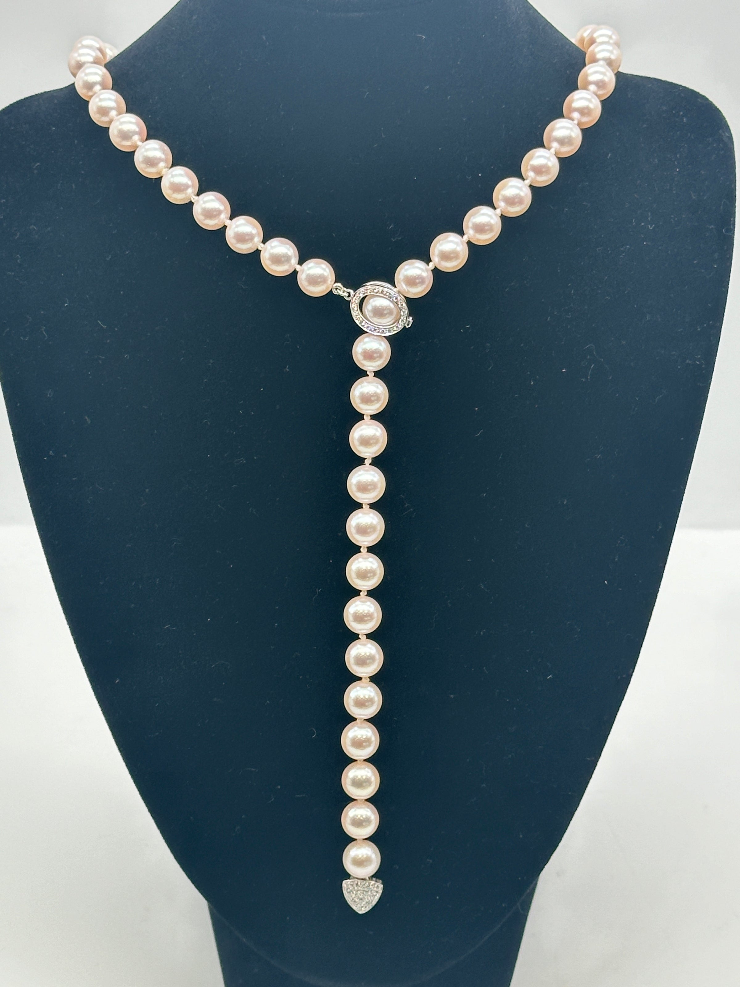 This beautiful necklace is crafted with delicate cultured pink pearls, arranged in an elegant lariat style that offers a modern twist on a classic design. The pearls display a soft, natural lustre with subtle blush tones, creating a graceful and feminine aesthetic. The piece is finished with an 18ct white gold clasp, intricately set with brilliant-cut diamonds, adding a refined touch of sparkle and luxury. -