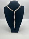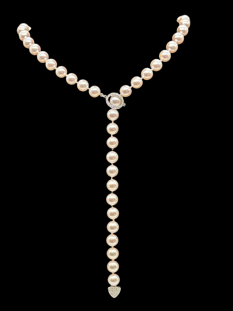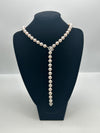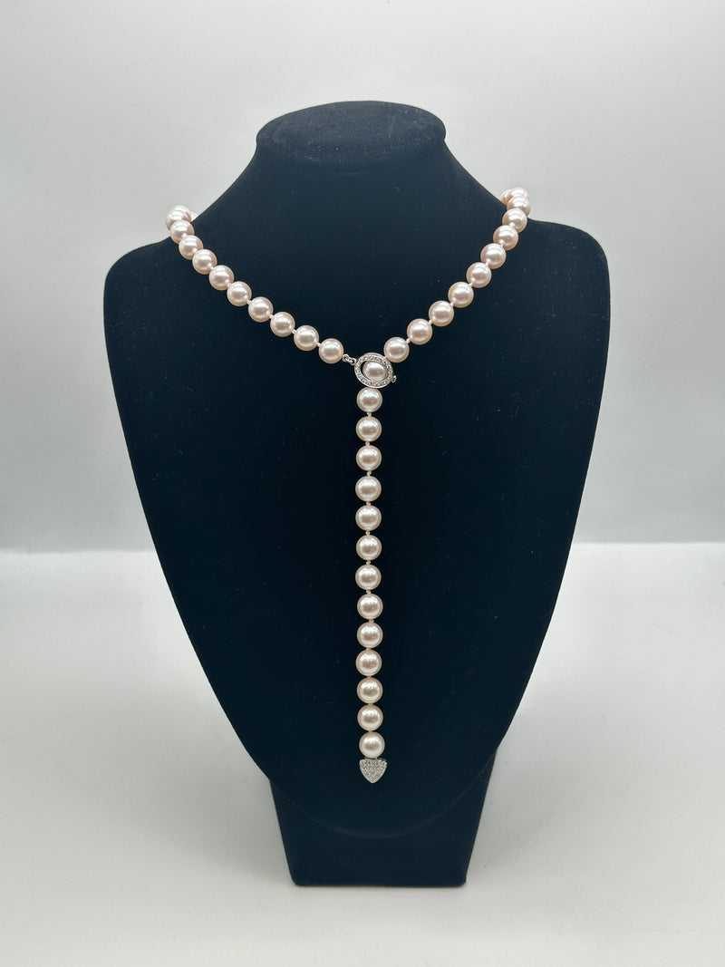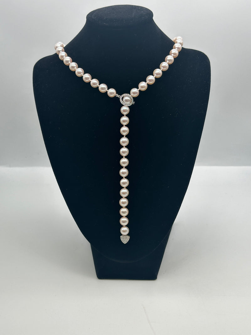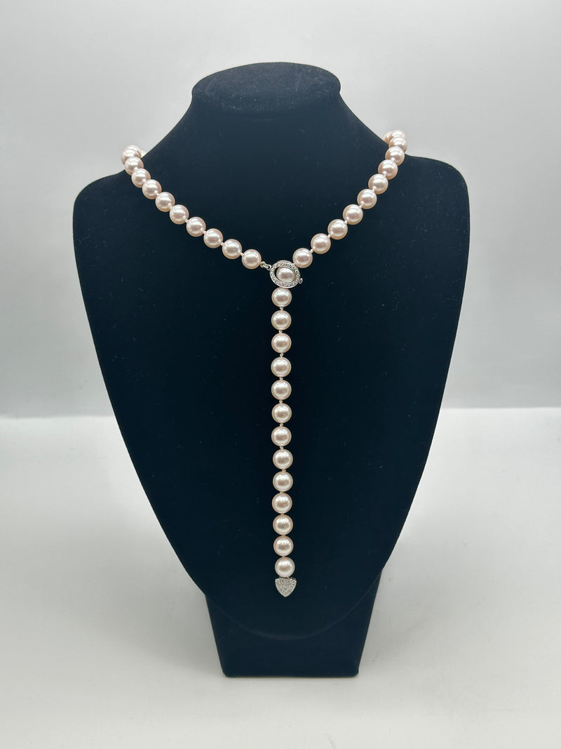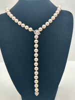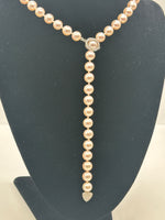 This beautiful necklace is crafted with delicate cultured pink pearls, arranged in an elegant lariat style that offers a modern twist on a classic design. The pearls display a soft, natural lustre with subtle blush tones, creating a graceful and feminine aesthetic. The piece is finished with an 18ct white gold clasp, intricately set with brilliant-cut diamonds, adding a refined touch of sparkle and luxury. -