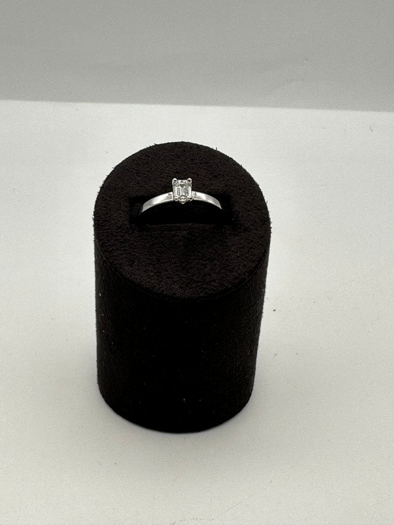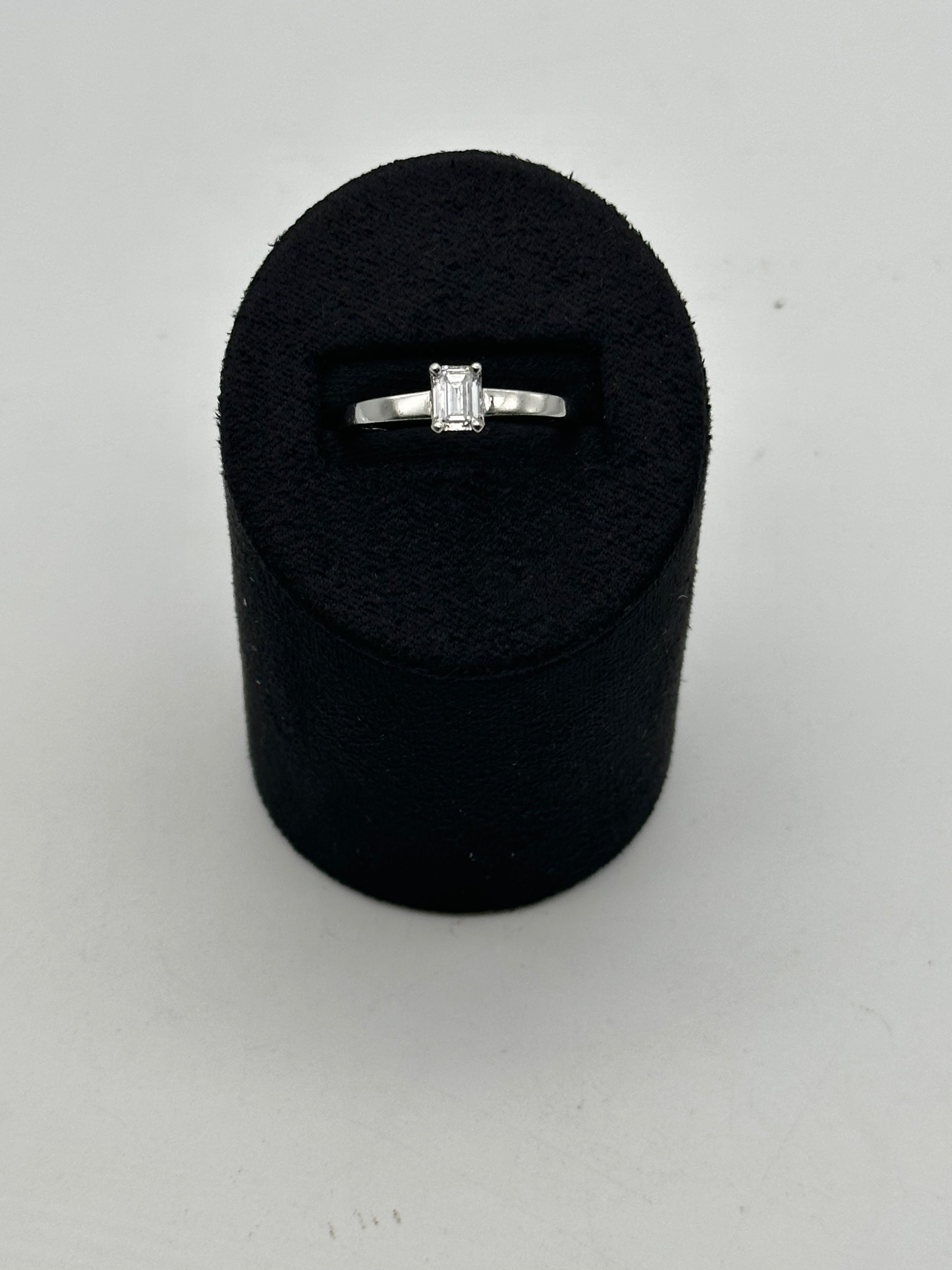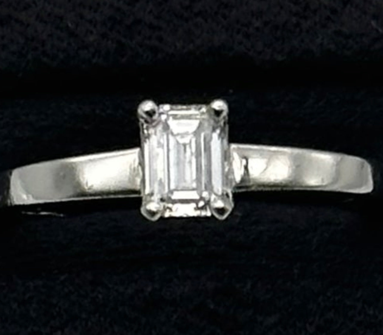 Stunning platinum single solitre diamond ring set in a hand-made claw set mount, four discreet claws hold a emerald cut diamond.