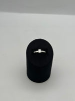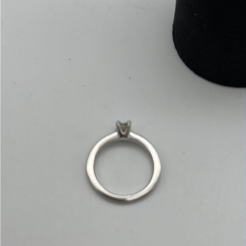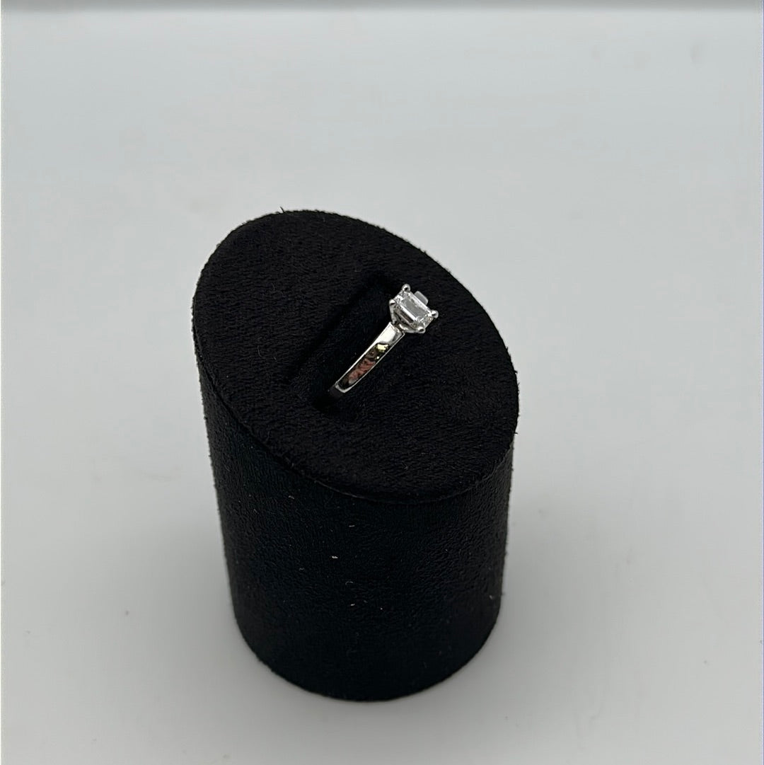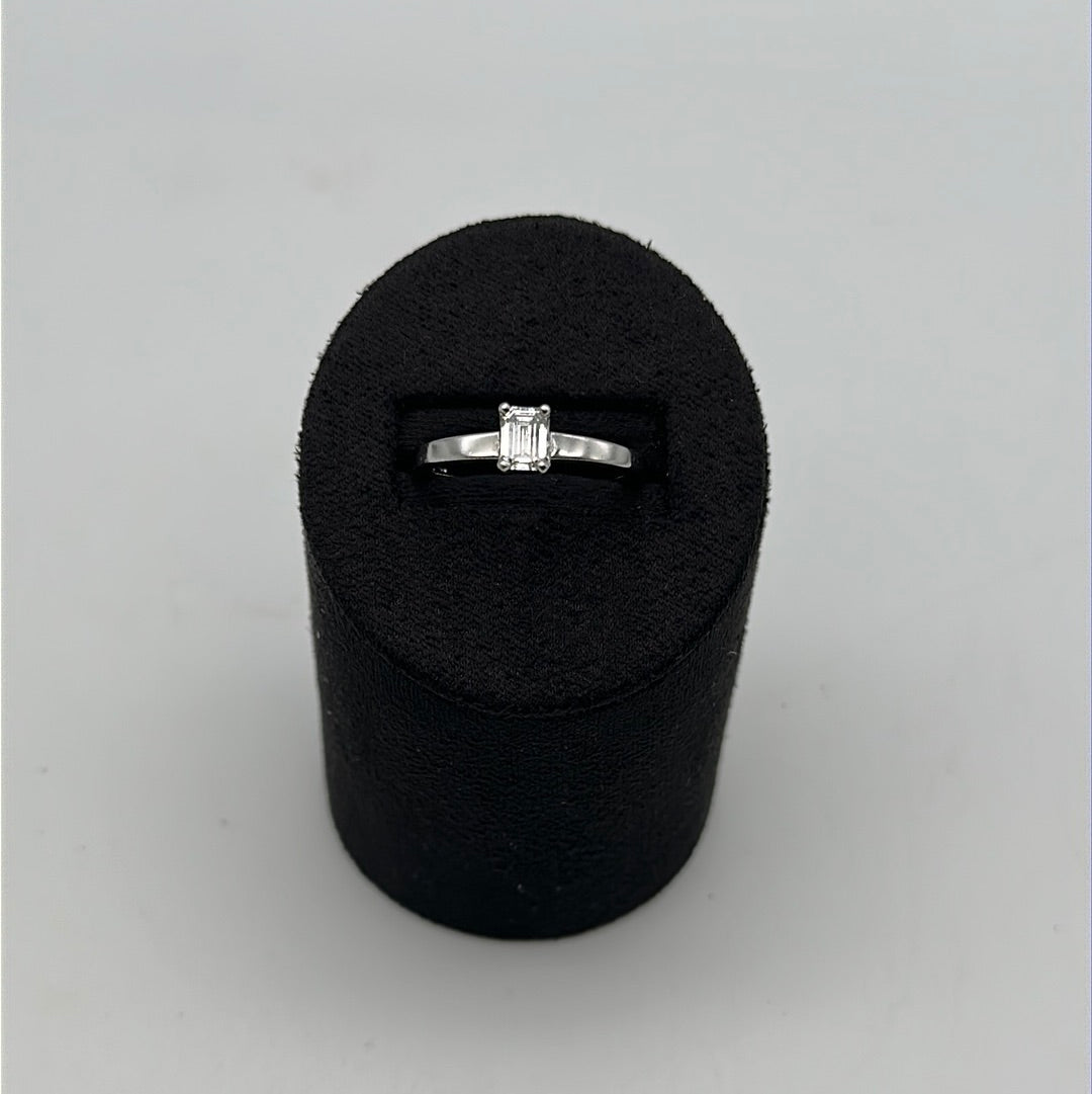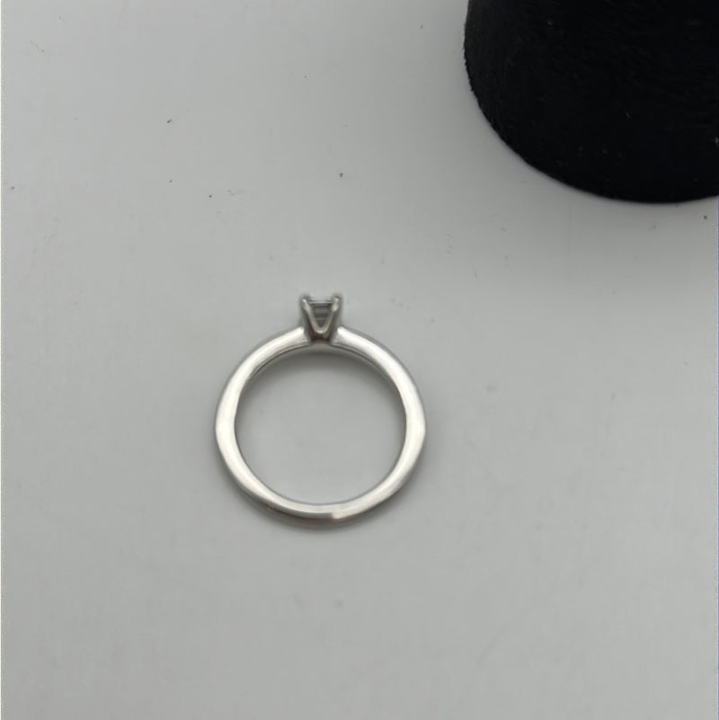 Stunning platinum single solitre diamond ring set in a hand-made claw set mount, four discreet claws hold a emerald cut diamond.