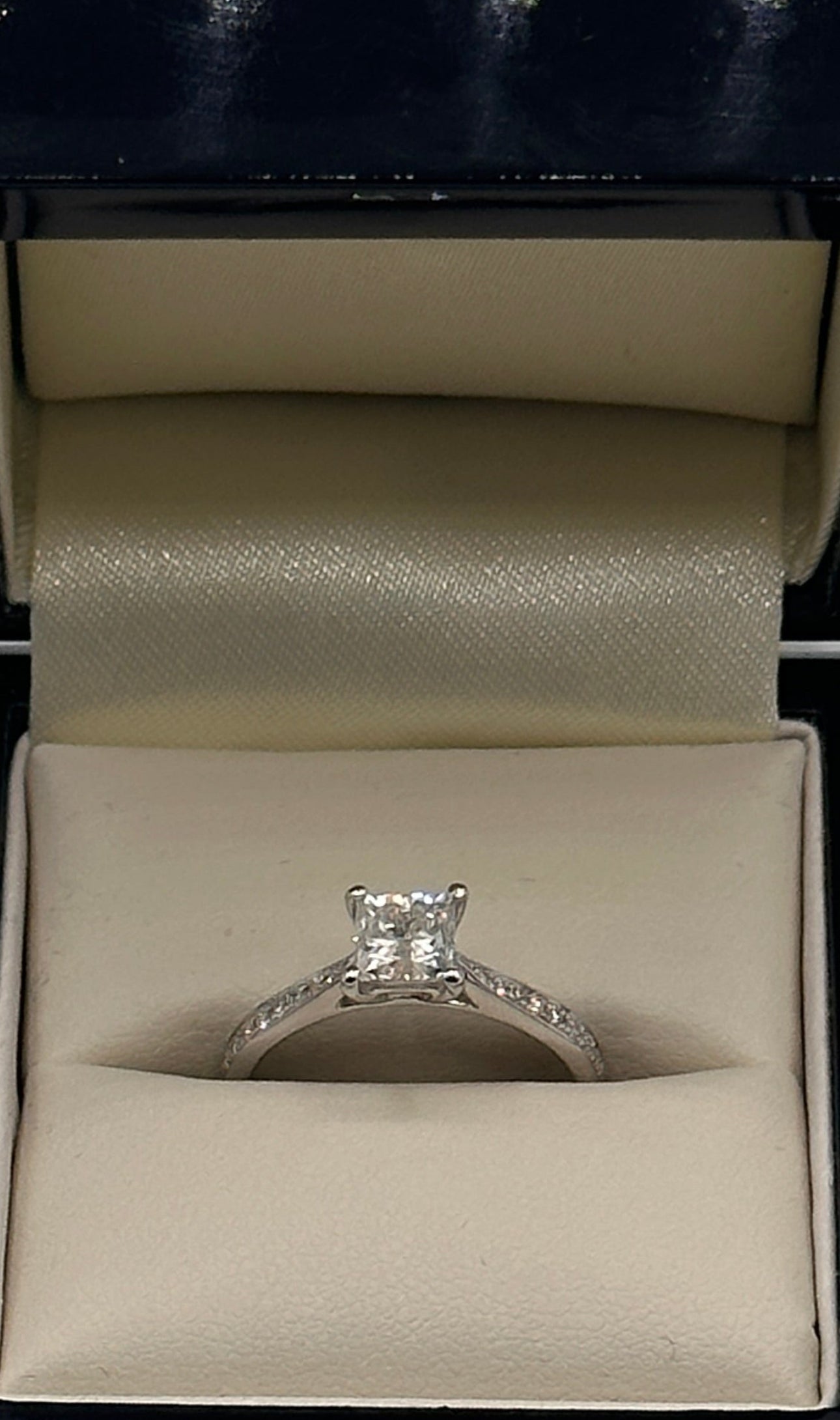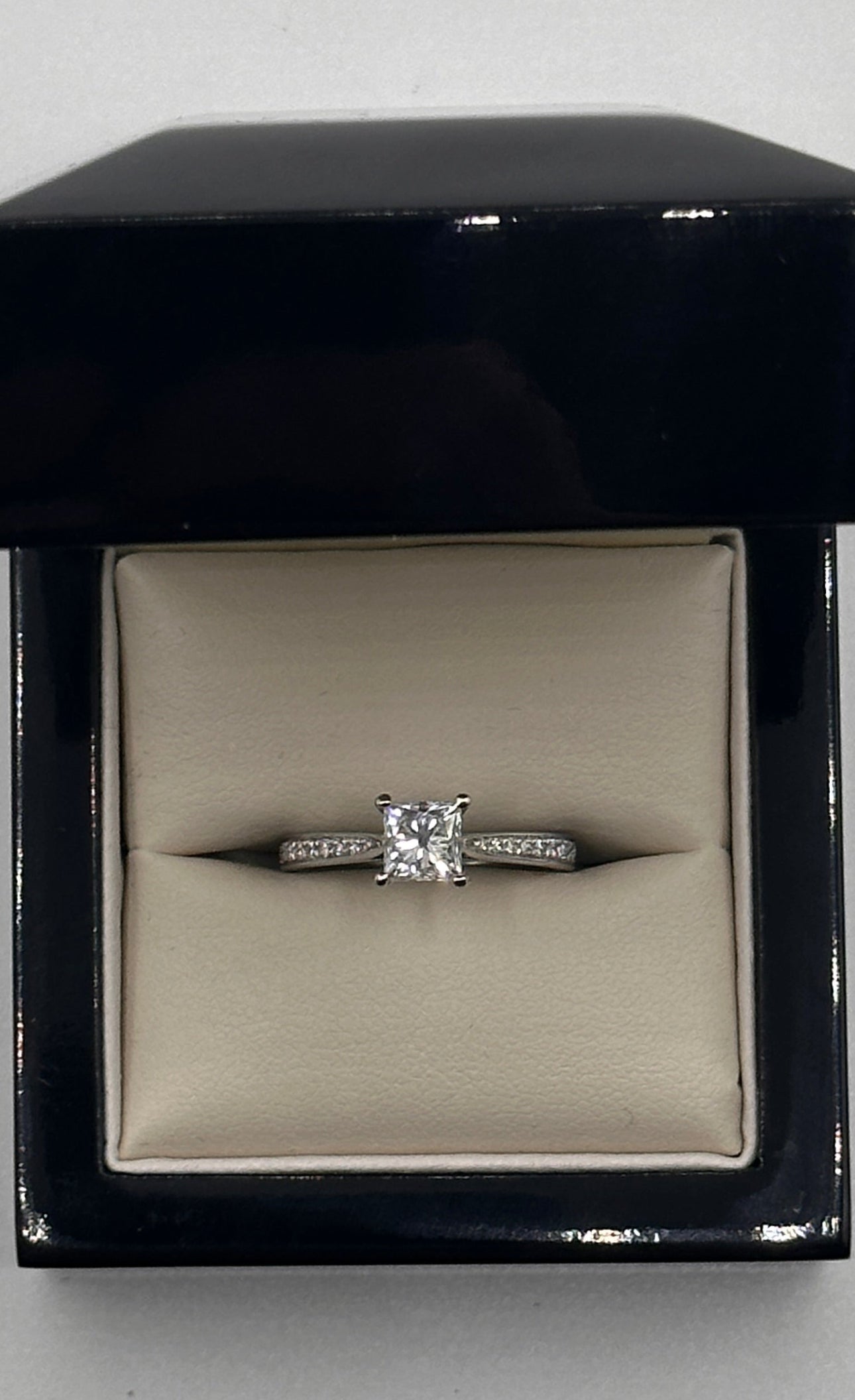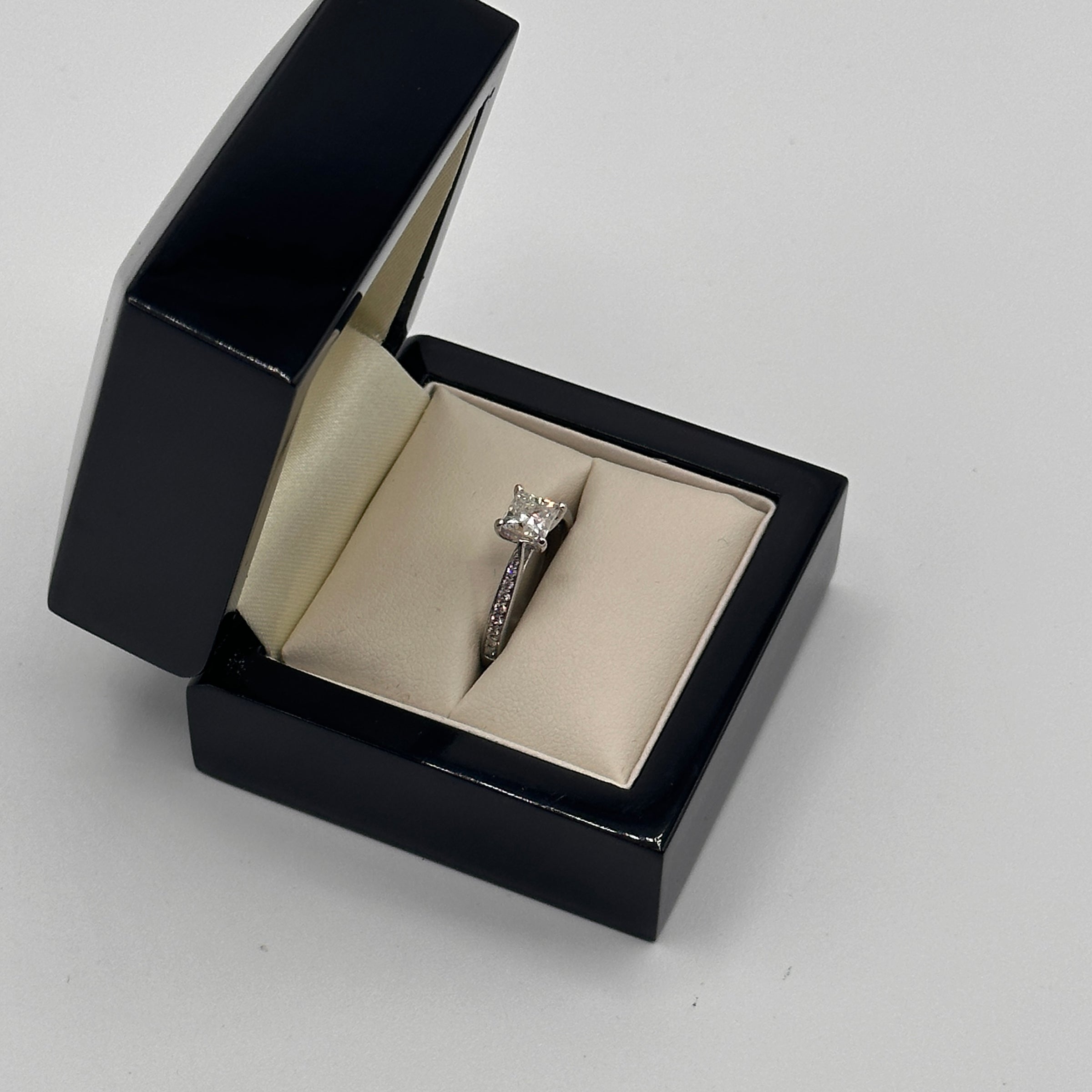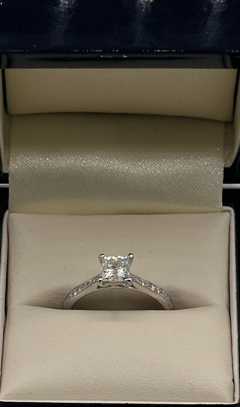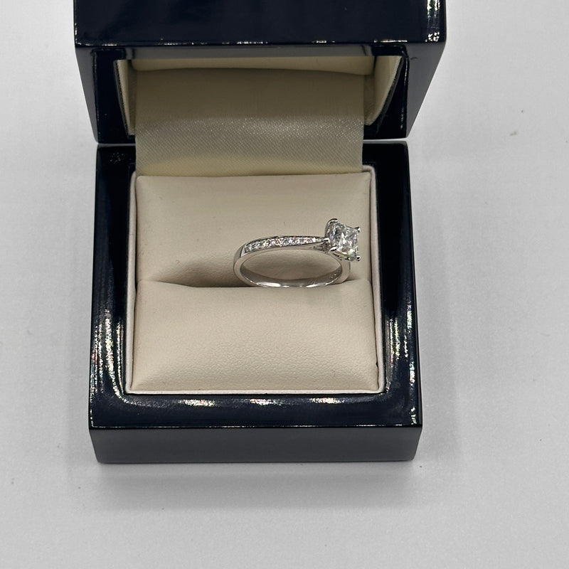 This stunning 18ct white gold diamond ring showcases a timeless design centred around a 1.00ct princess cut diamond, securely held in a classic four-claw mount. The central stone is beautifully complemented by a row of small brilliant-cut diamonds running delicately down each shoulder, adding sparkle and enhancing the ring’s elegant profile. Crafted in polished white gold, the setting offers a clean and contemporary look that maximises the fire and brilliance of each diamond. -