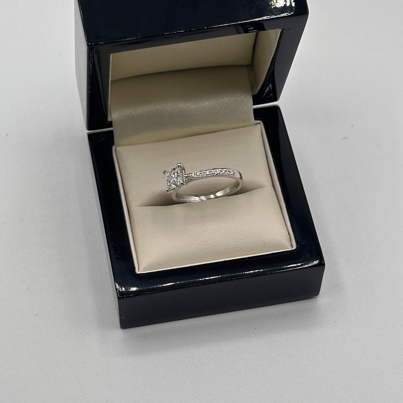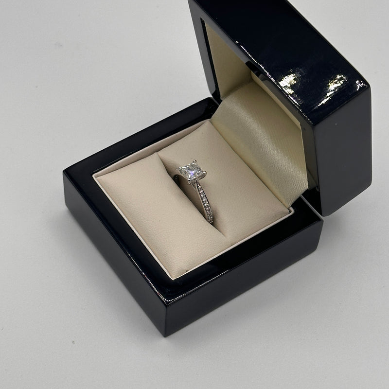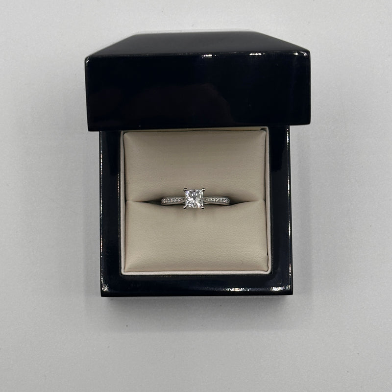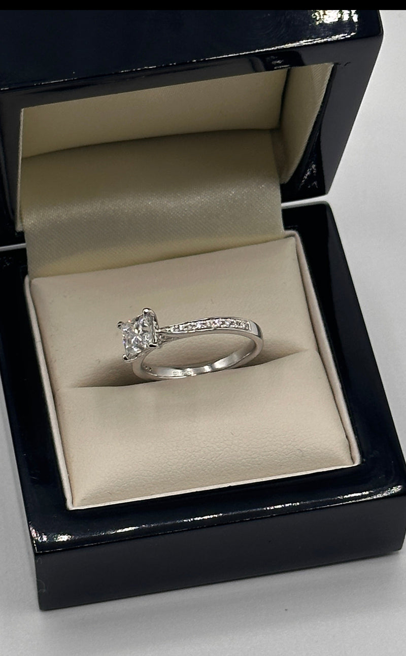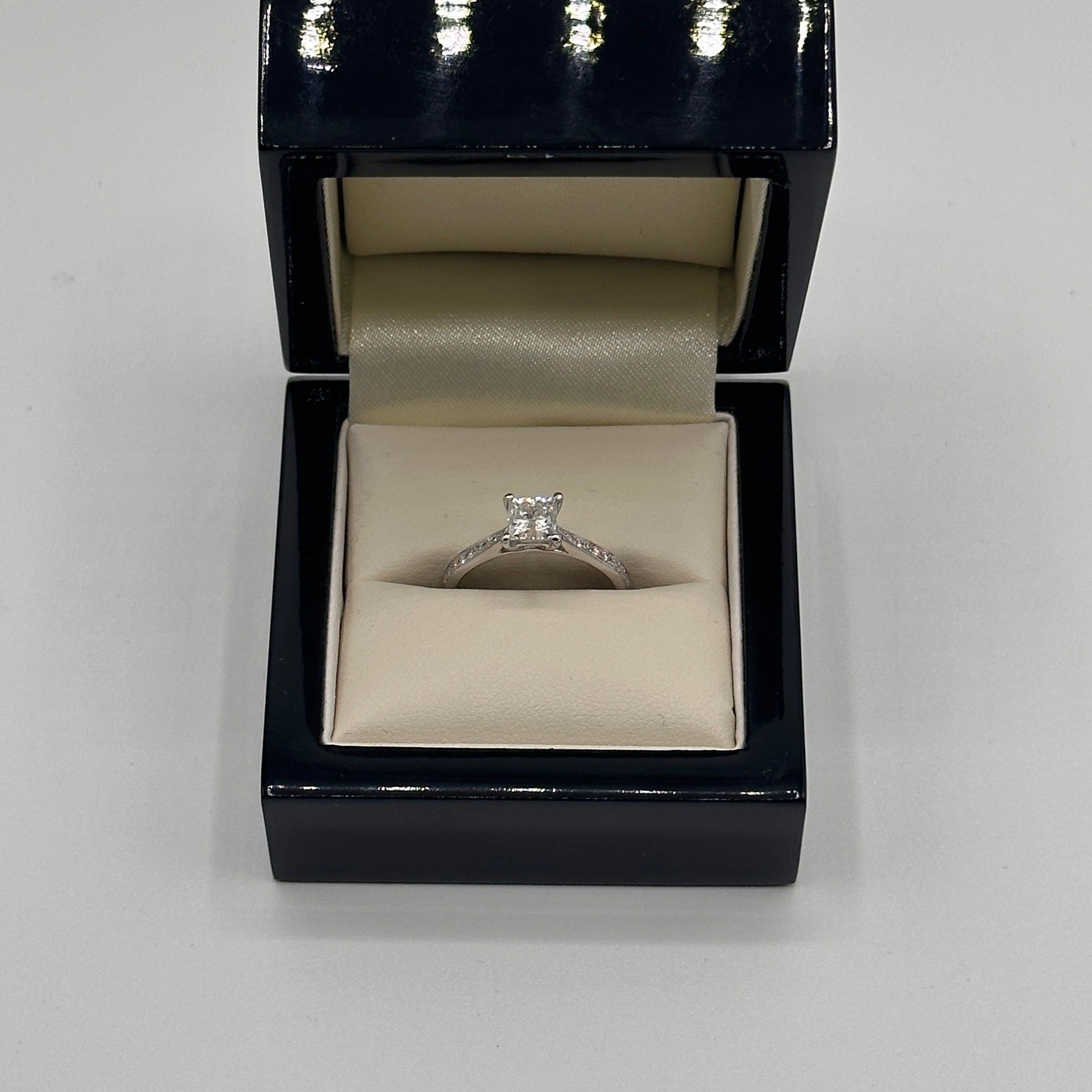 This stunning 18ct white gold diamond ring showcases a timeless design centred around a 1.00ct princess cut diamond, securely held in a classic four-claw mount. The central stone is beautifully complemented by a row of small brilliant-cut diamonds running delicately down each shoulder, adding sparkle and enhancing the ring’s elegant profile. Crafted in polished white gold, the setting offers a clean and contemporary look that maximises the fire and brilliance of each diamond. -