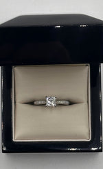 - Setting: Four-claw centre mount with diamond-set shoulders