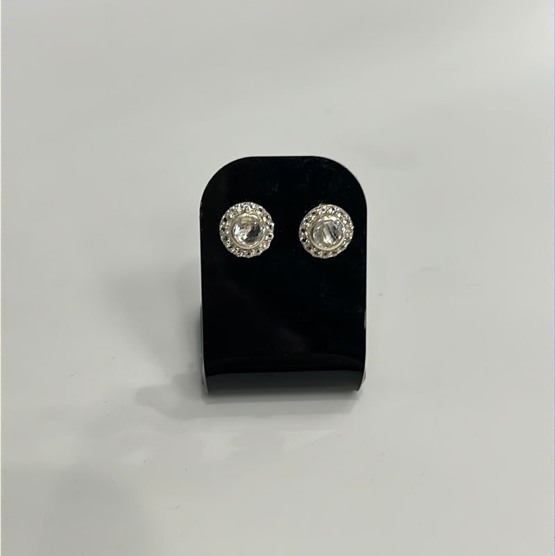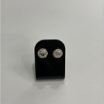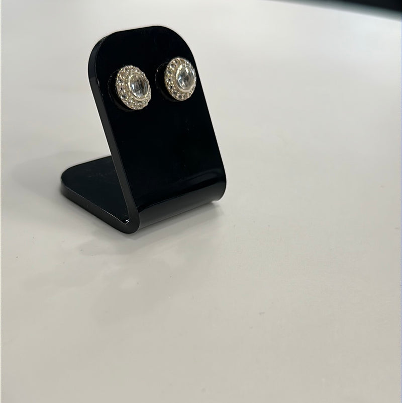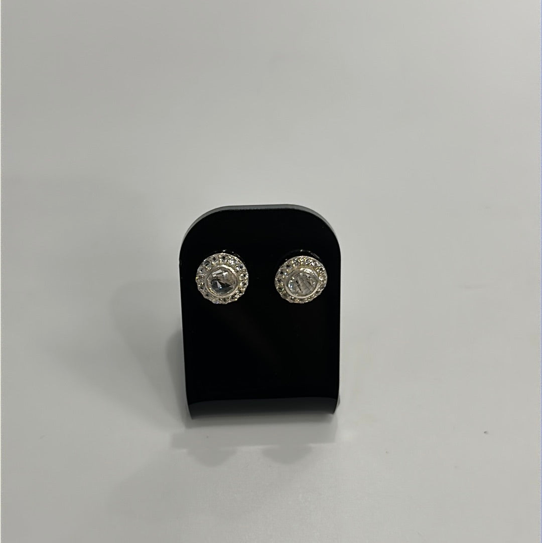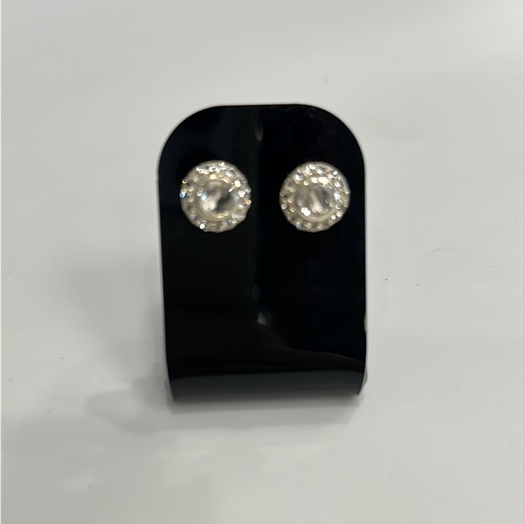 Sterling silver rock crystal earrings set with a halo of Swarovski crystals.