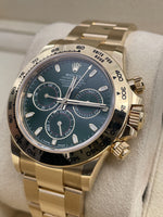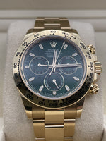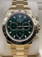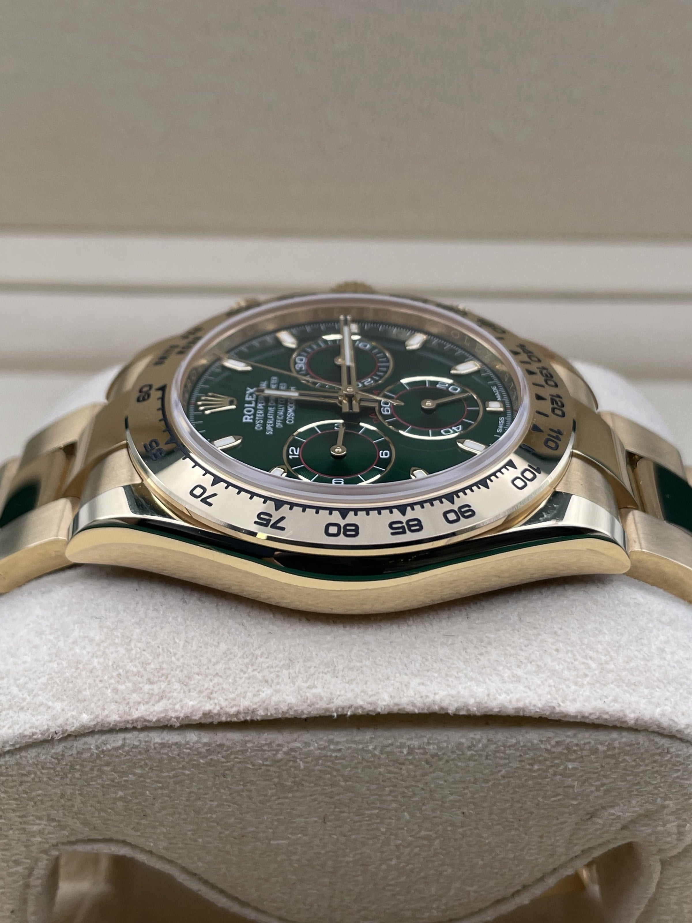 This Rolex Oyster Perpetual Cosmograph Daytona in 18ct Yellow Gold, with a bright Green Dial and a solid 18k yellow gold Oyster Bracelet, features an 18ct yellow gold bezel with an engraved tachymetric scale. The watch has been kept in pristine condition and is a credit to the current owner.