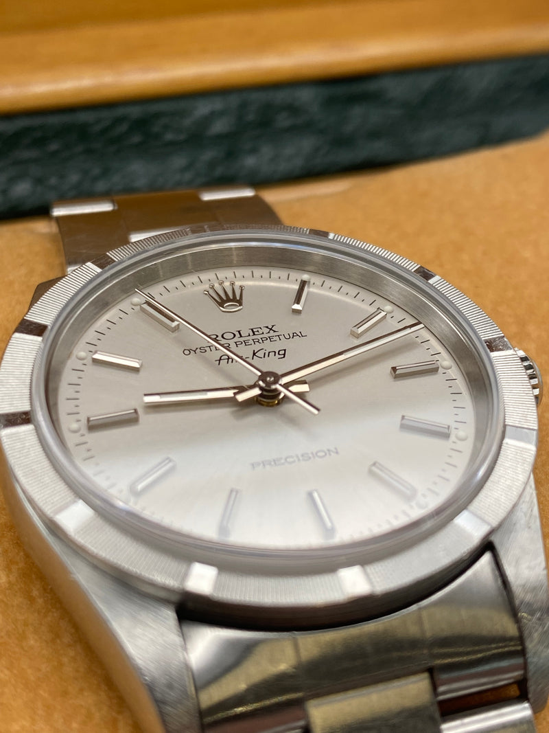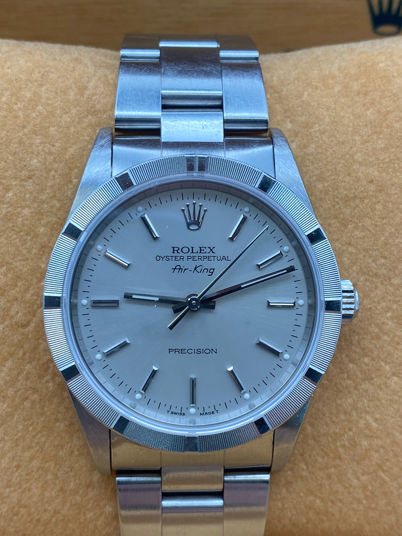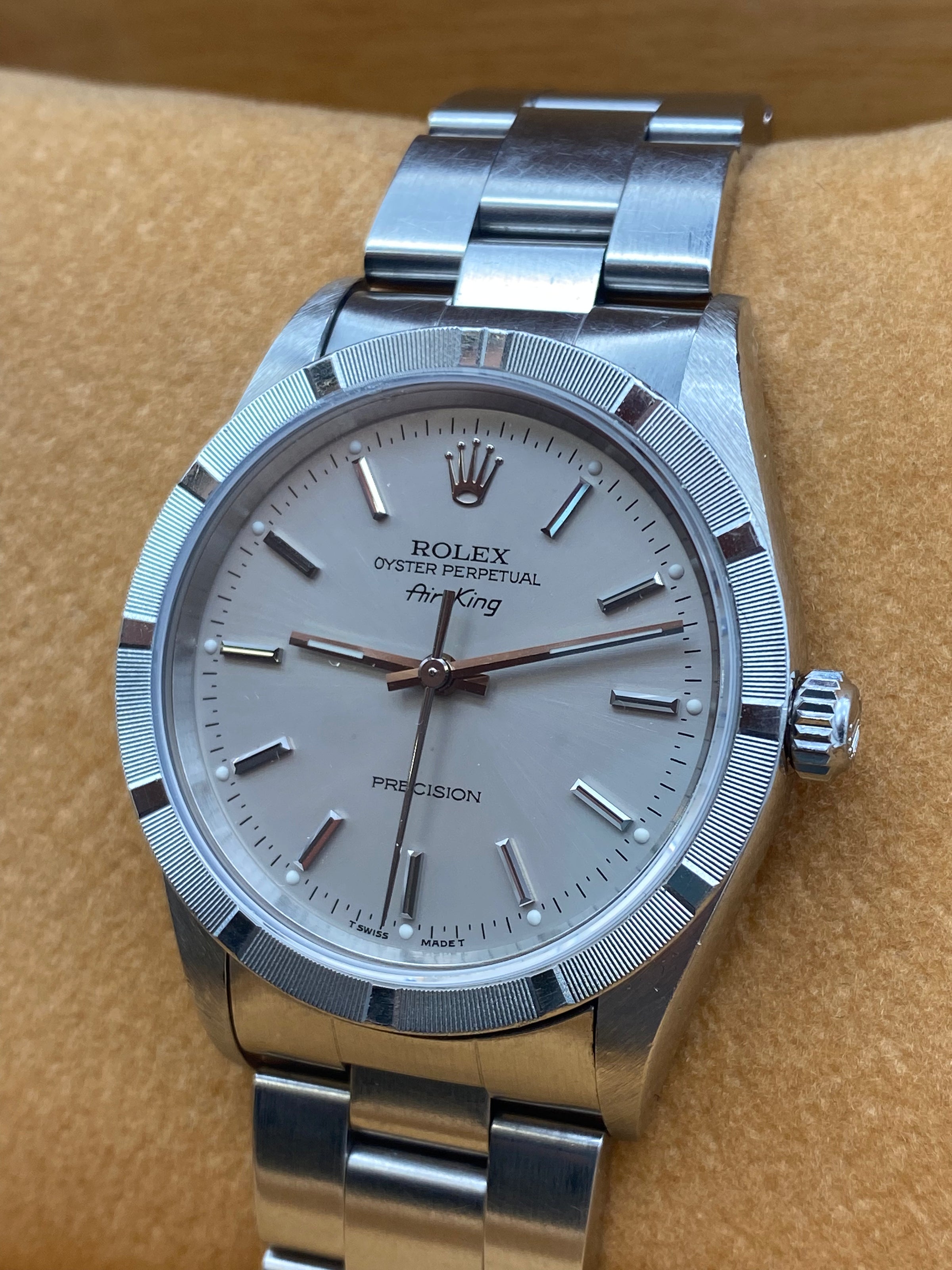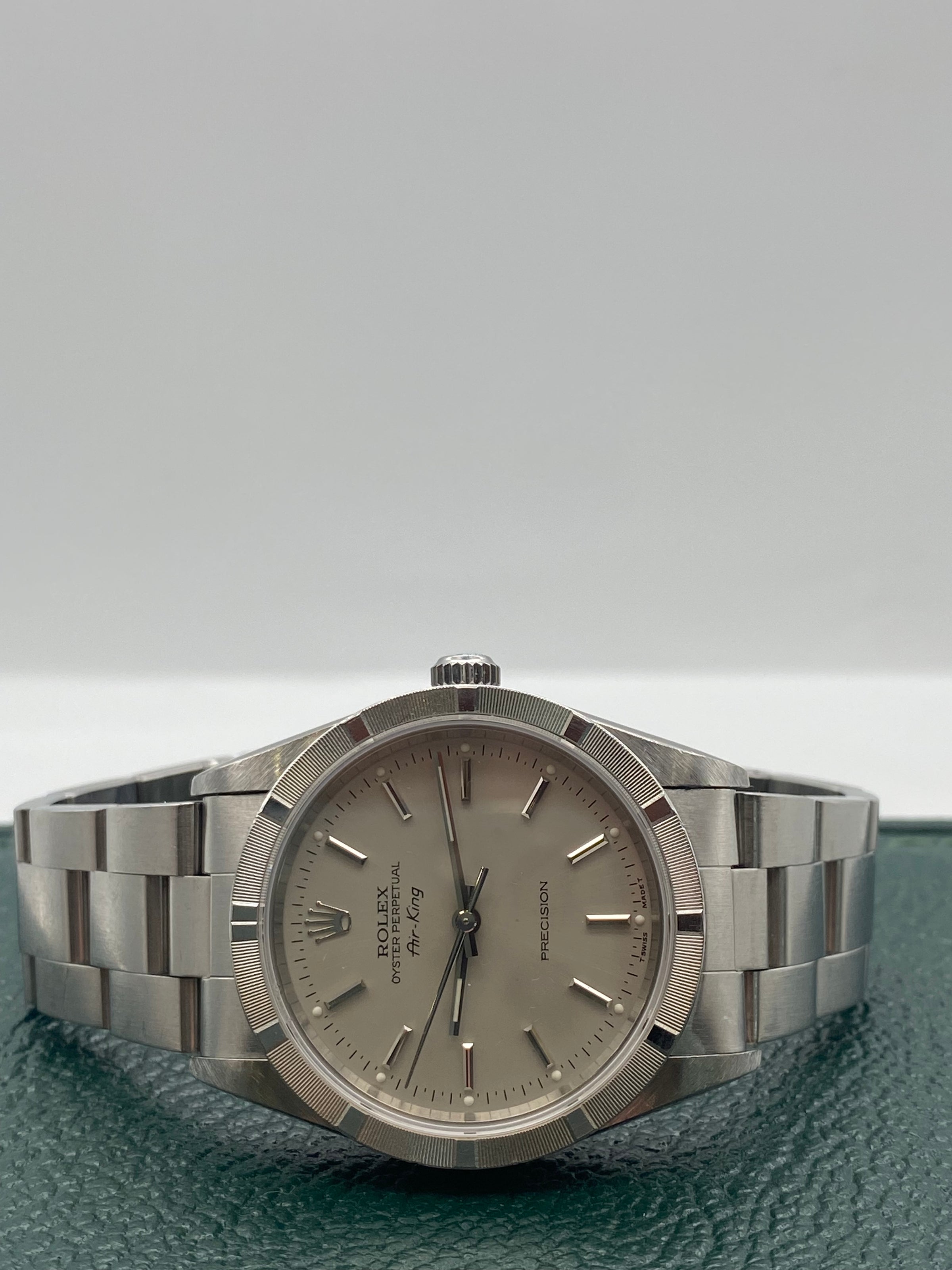 This stunning 1998 34mm Rolex oyster perpetual Air King precision is in unpolished condition. The watch has light signs of wear on the case, bracelet and clasp though the dial, bezel and crystal are all in stunning condition. This watch comes as a complete with a full bracelet, all paperwork and both the inner and outer box.