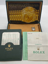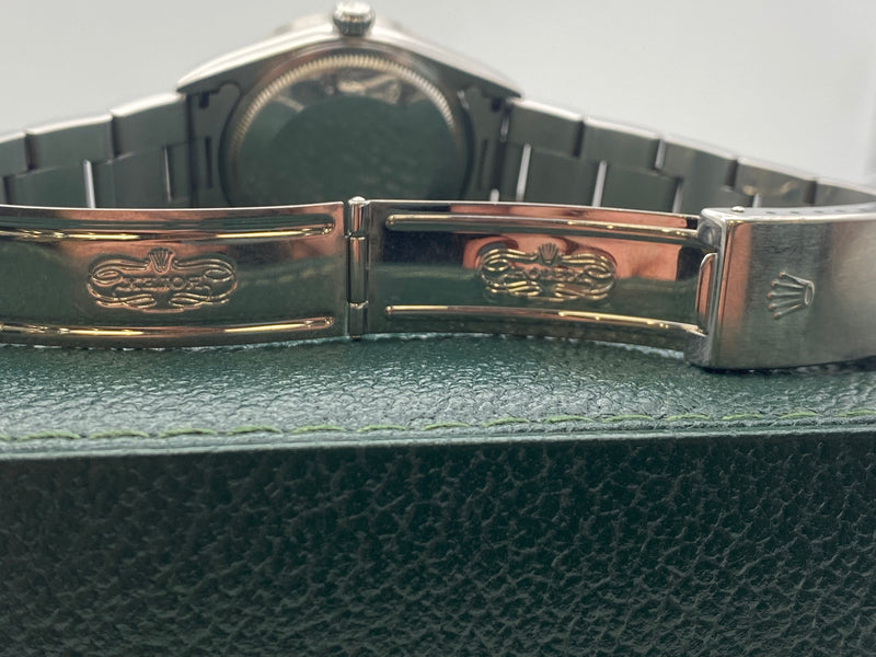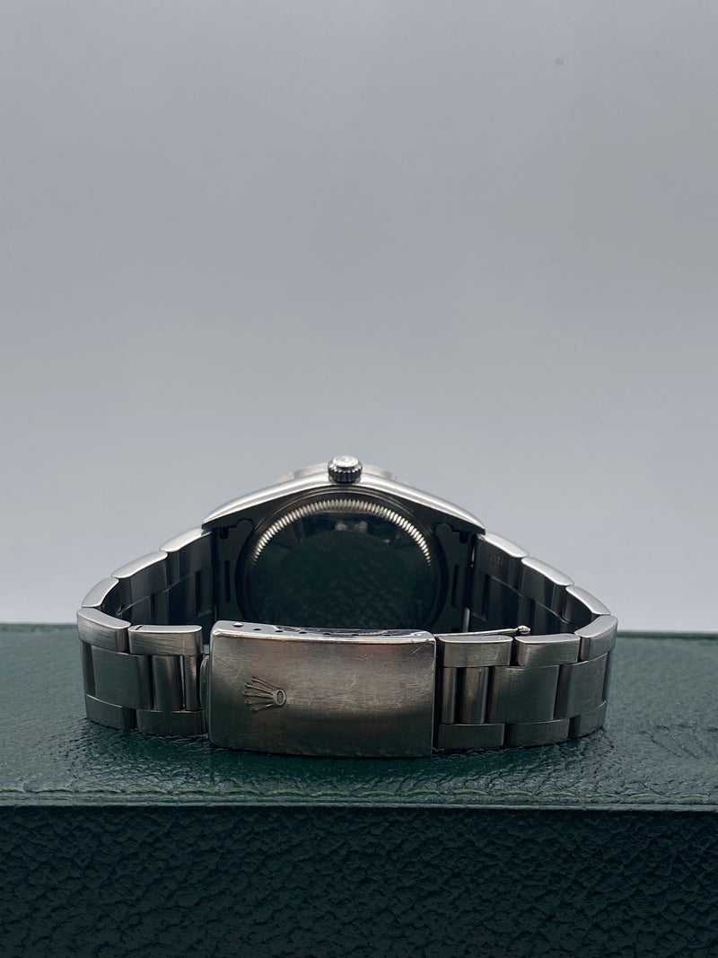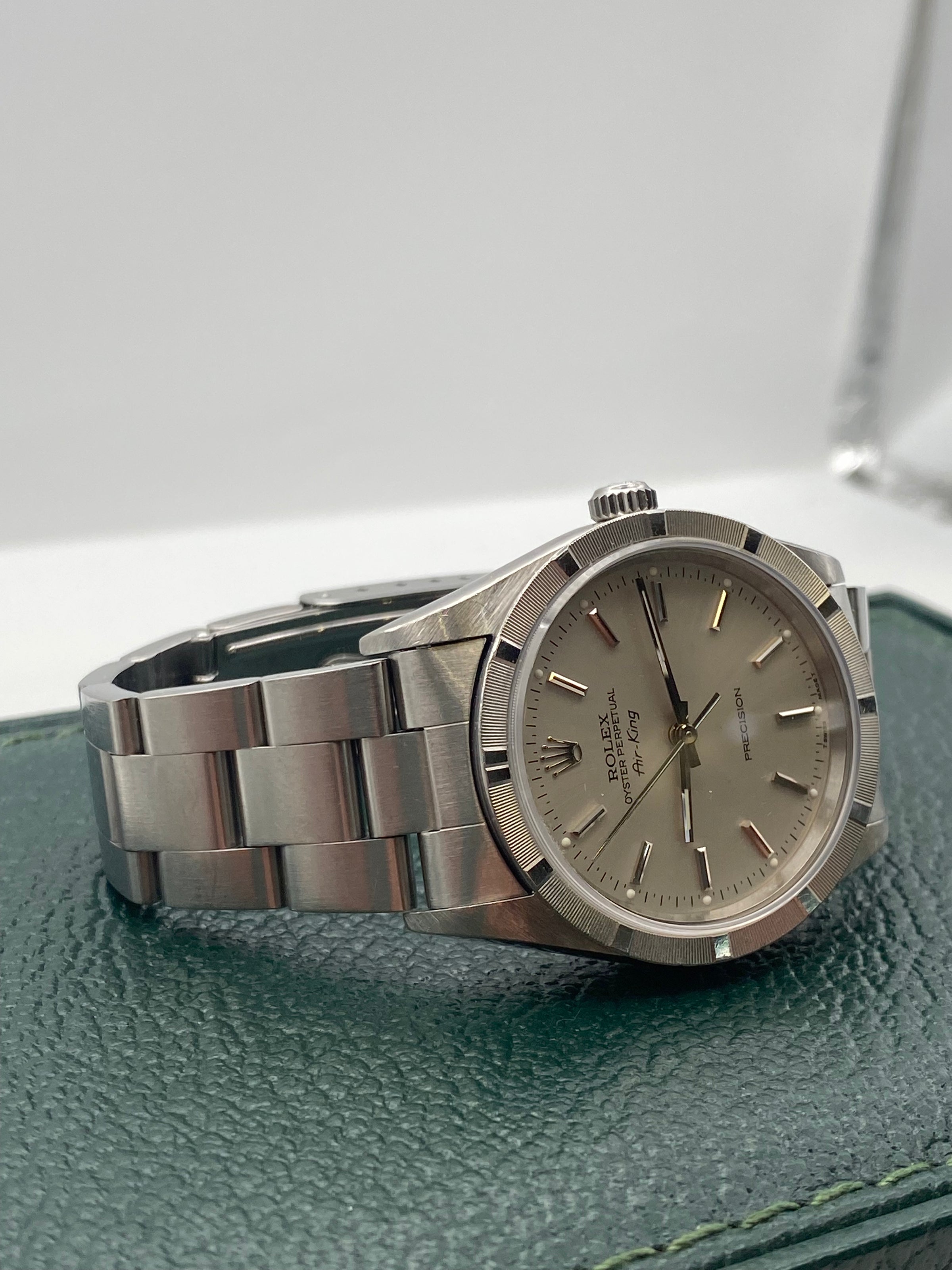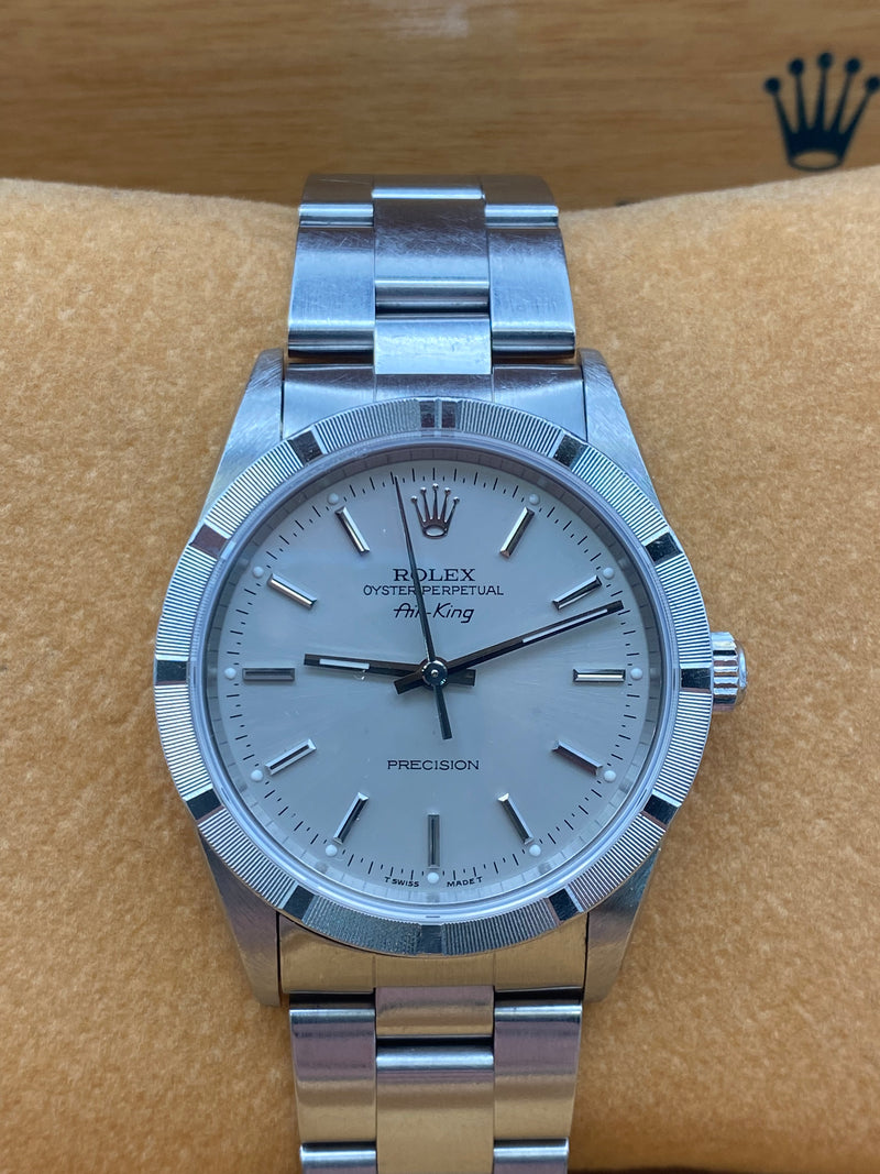 This stunning 1998 34mm Rolex oyster perpetual Air King precision is in unpolished condition. The watch has light signs of wear on the case, bracelet and clasp though the dial, bezel and crystal are all in stunning condition. This watch comes as a complete with a full bracelet, all paperwork and both the inner and outer box.