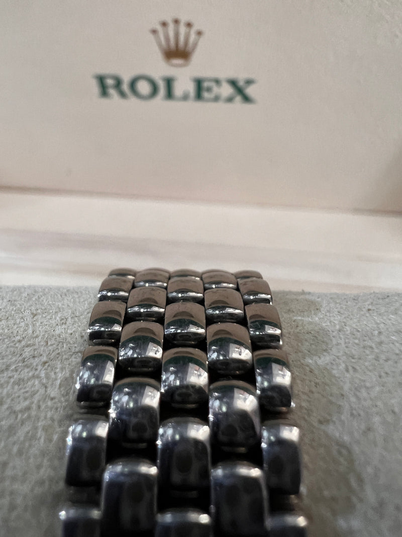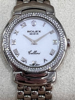 Preowned, excellent condition Rolex Cellini Cellissima 18k White Gold ladies wristwatch. White dial, Roman numeral hour markers, an 18k White Gold 26mm case, winder, bracelet, folded clasp and diamond bezel, sapphire crystal glass and quartz movement. This watch has a serial: K68XXXX and was produced in 2001. This watch comes with our certificate of authenticity, with one of our boxes and with our 24 months warranty.
