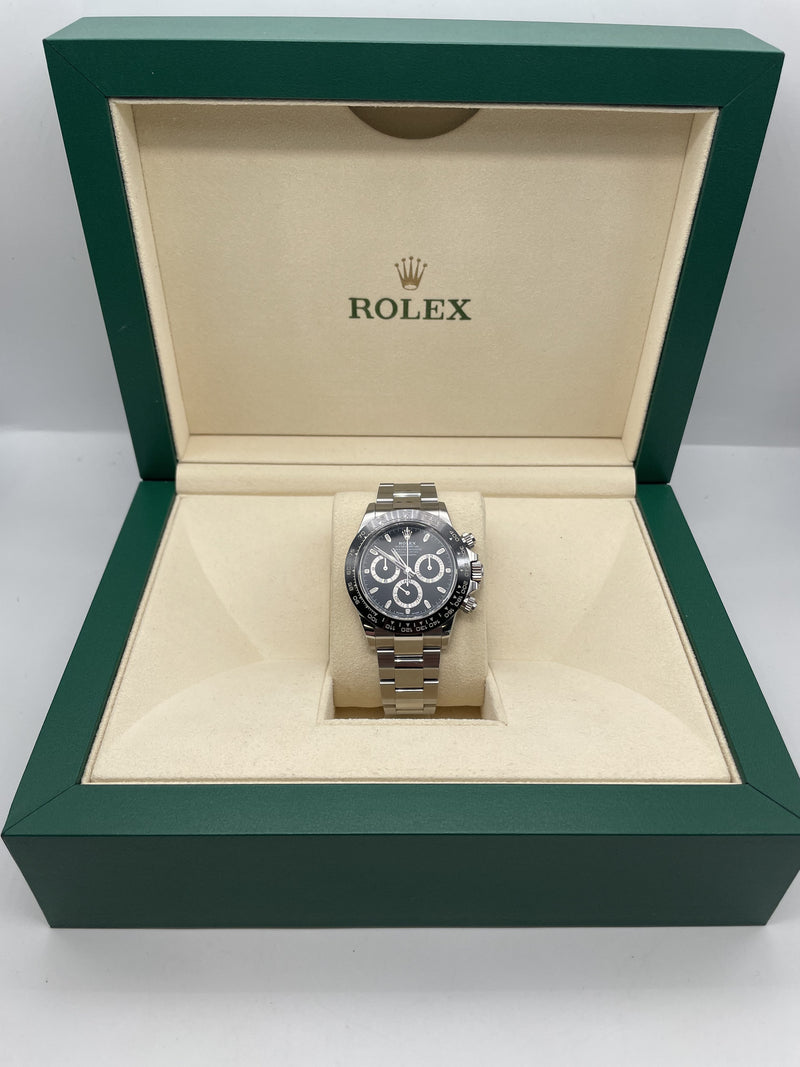 This particular model Features a 40mm stainless steel case, a black dial, black sub dials and a black ceramic bezel. This watch comes on a stainless steel oyster bracelet.