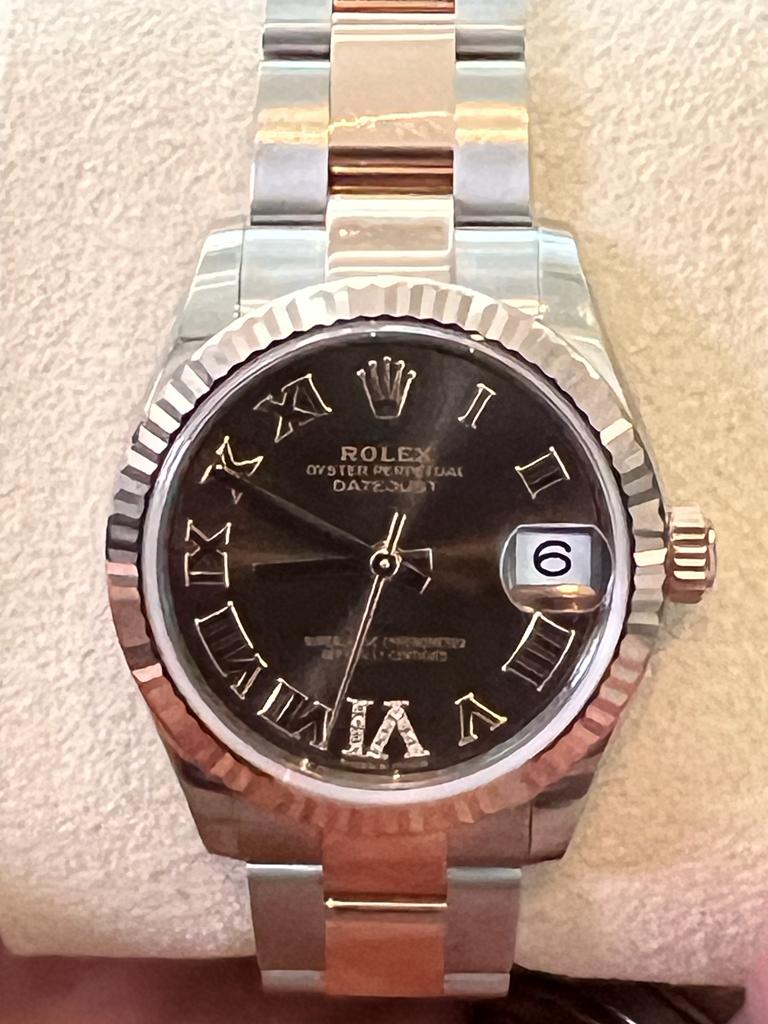 Rolex Oyster Perpetual, Oyster steel and Everose Gold bracelet, Chocolate Dial, Oyster steel case, Everose fluted Bezel, Roman numerals Pave Diamonds at 6 O'clock, 11 in total, Brand new 05/05/23 .Created in 1945, the Datejust was the first self-winding waterproof chronometer wristwatch to display the date in a window at 3 o'clock on the dial – hence its name. With its timeless aesthetics, functions and rich history, the Datejust is a watchmaking icon and one of the brand's most recognizable watches