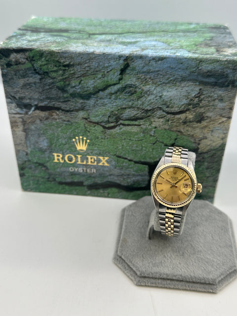 This vintage ladies Rolex datejust features a 26mm stainless steel case, champaign dial with gold baton hour markers, screw down 18k gold crown and a 18k yellow gold fluted bezel. This watch comes on a stainless steel and 18k yellow gold jubilee bracelet with a Rolex folding clasp. This watch was serviced and polished in April of 2024 and comes with a 12 month mechanical guarantee
