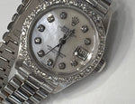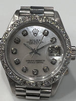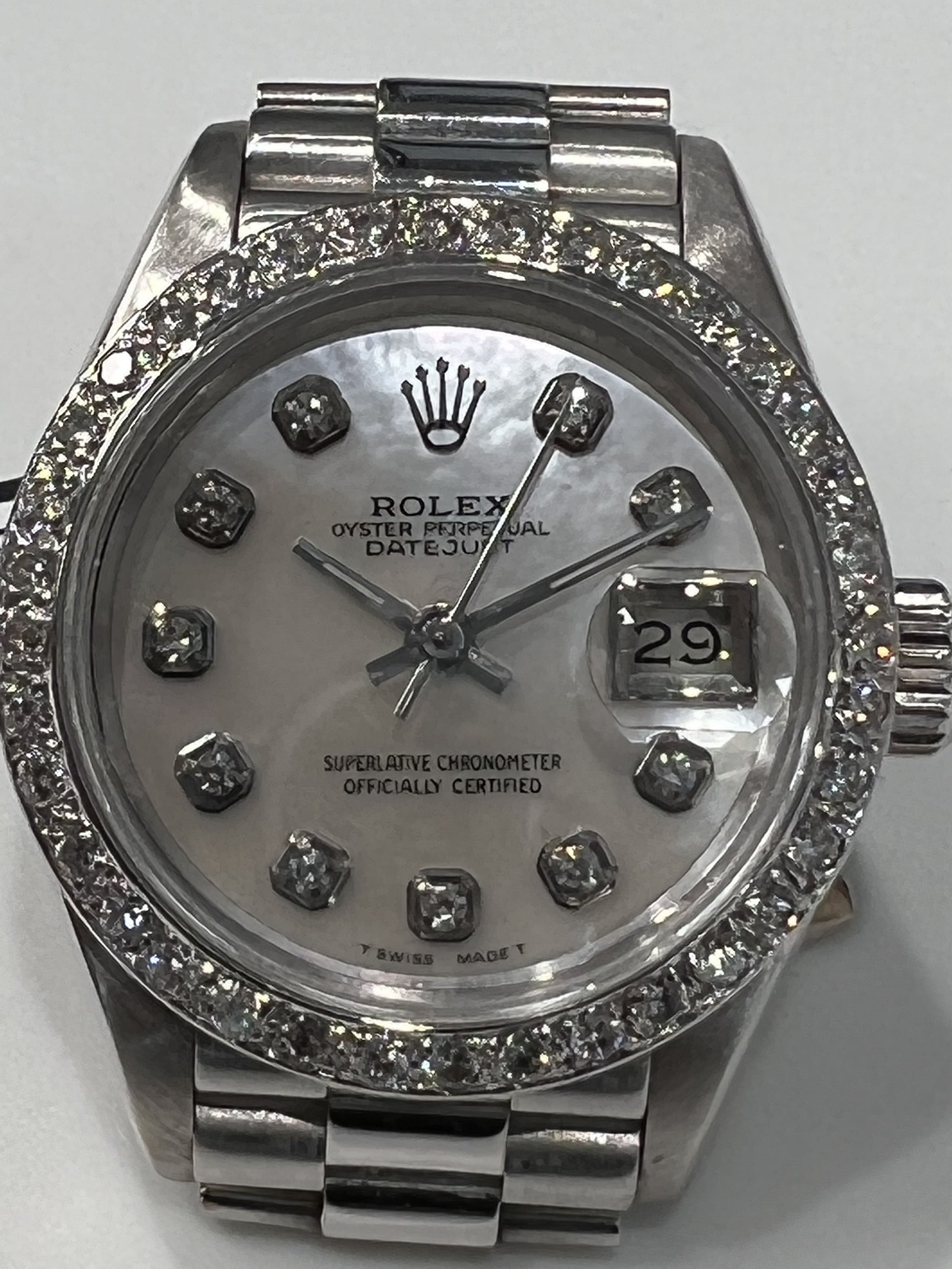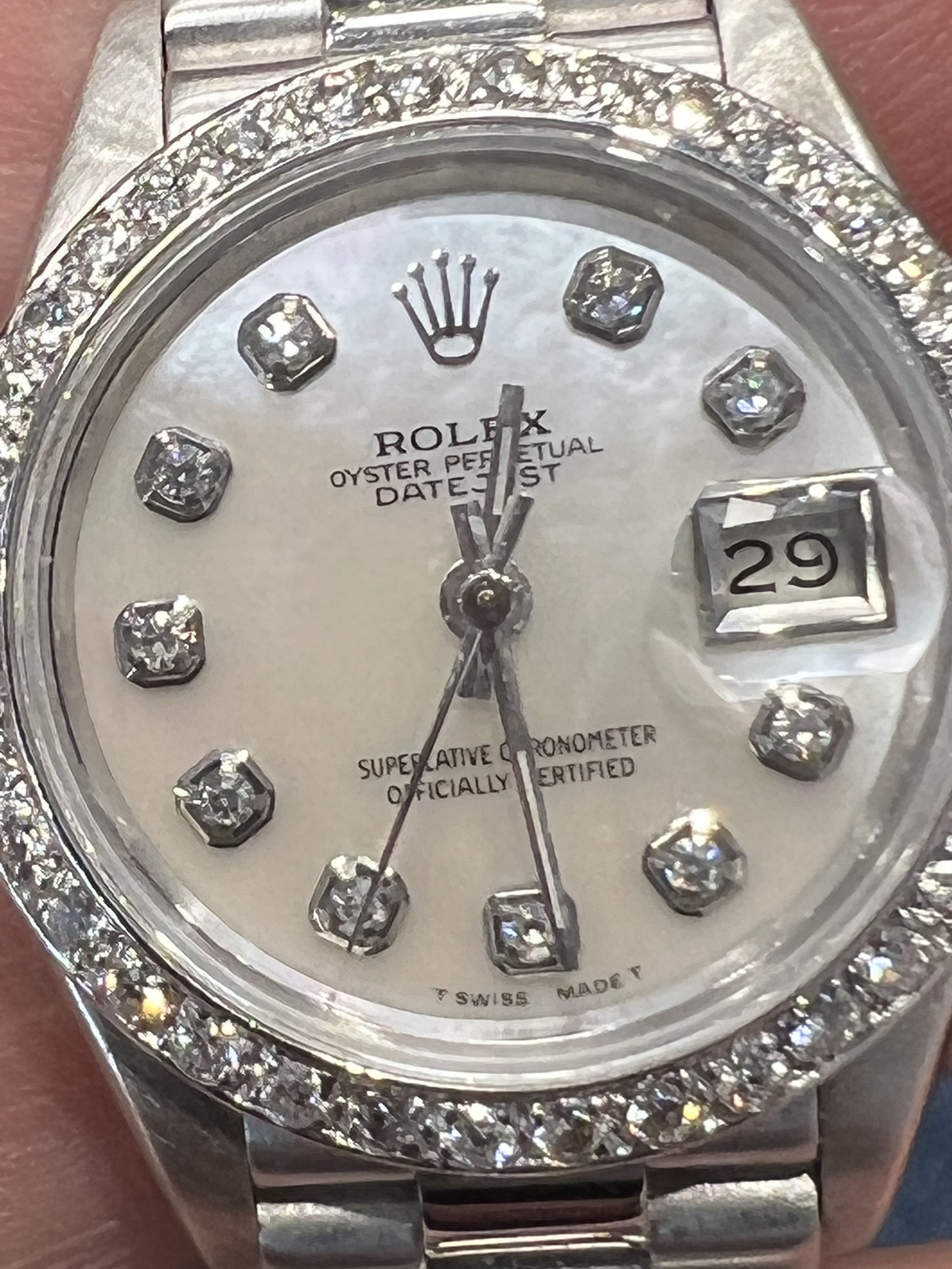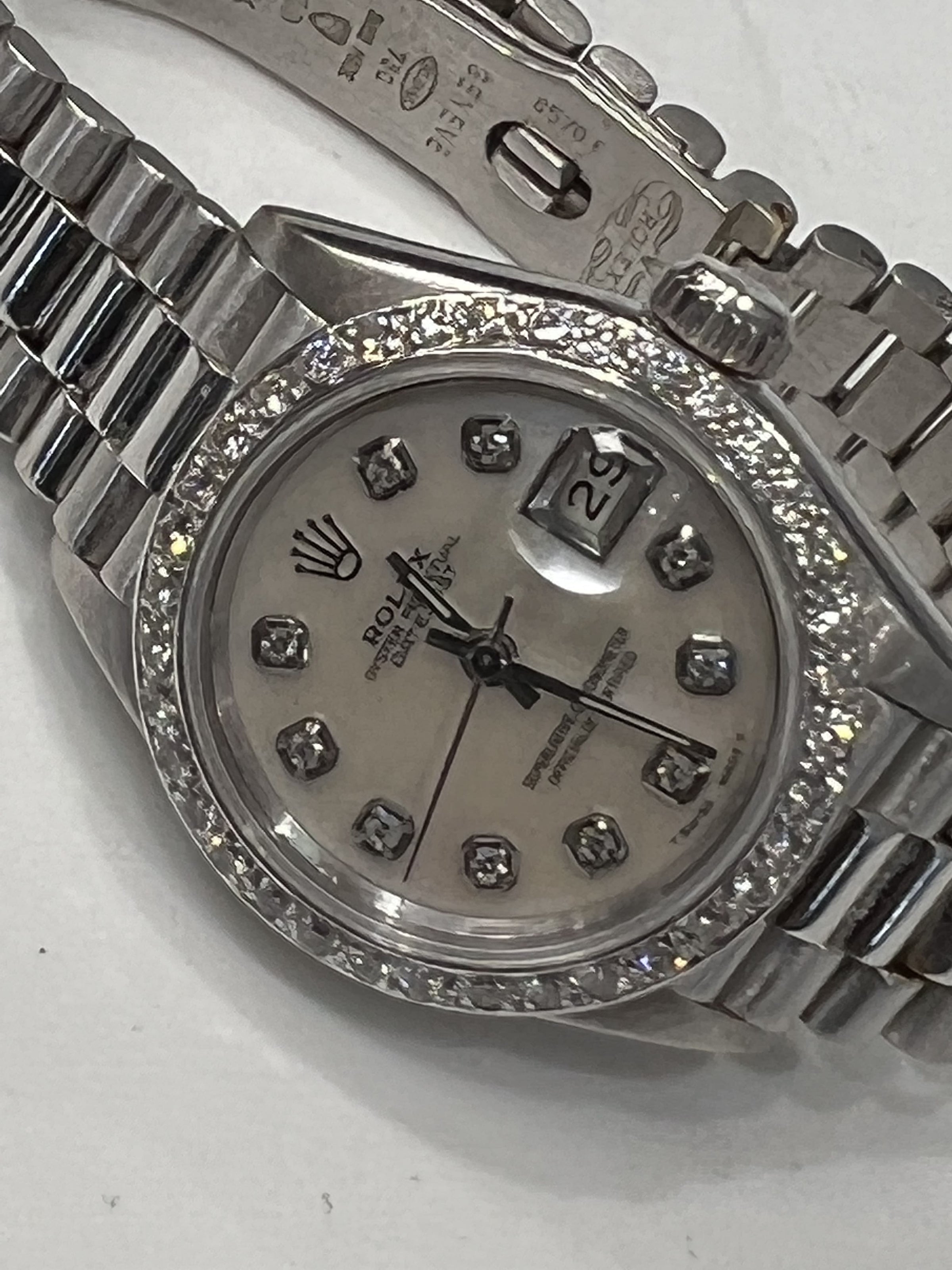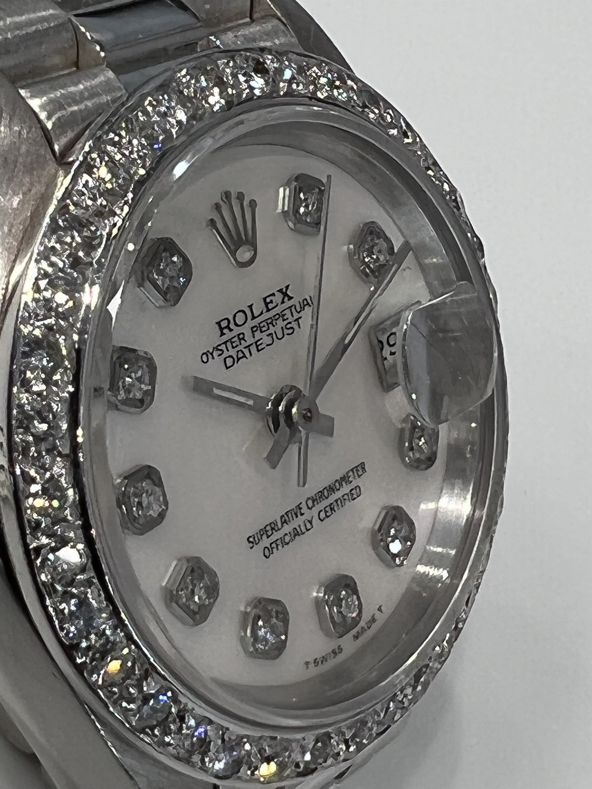 This one-of-a-kind Rolex Ladies 18ct Yellow Gold Datejust 26mm reference (69178) diamond hour marker dial diamond bezel