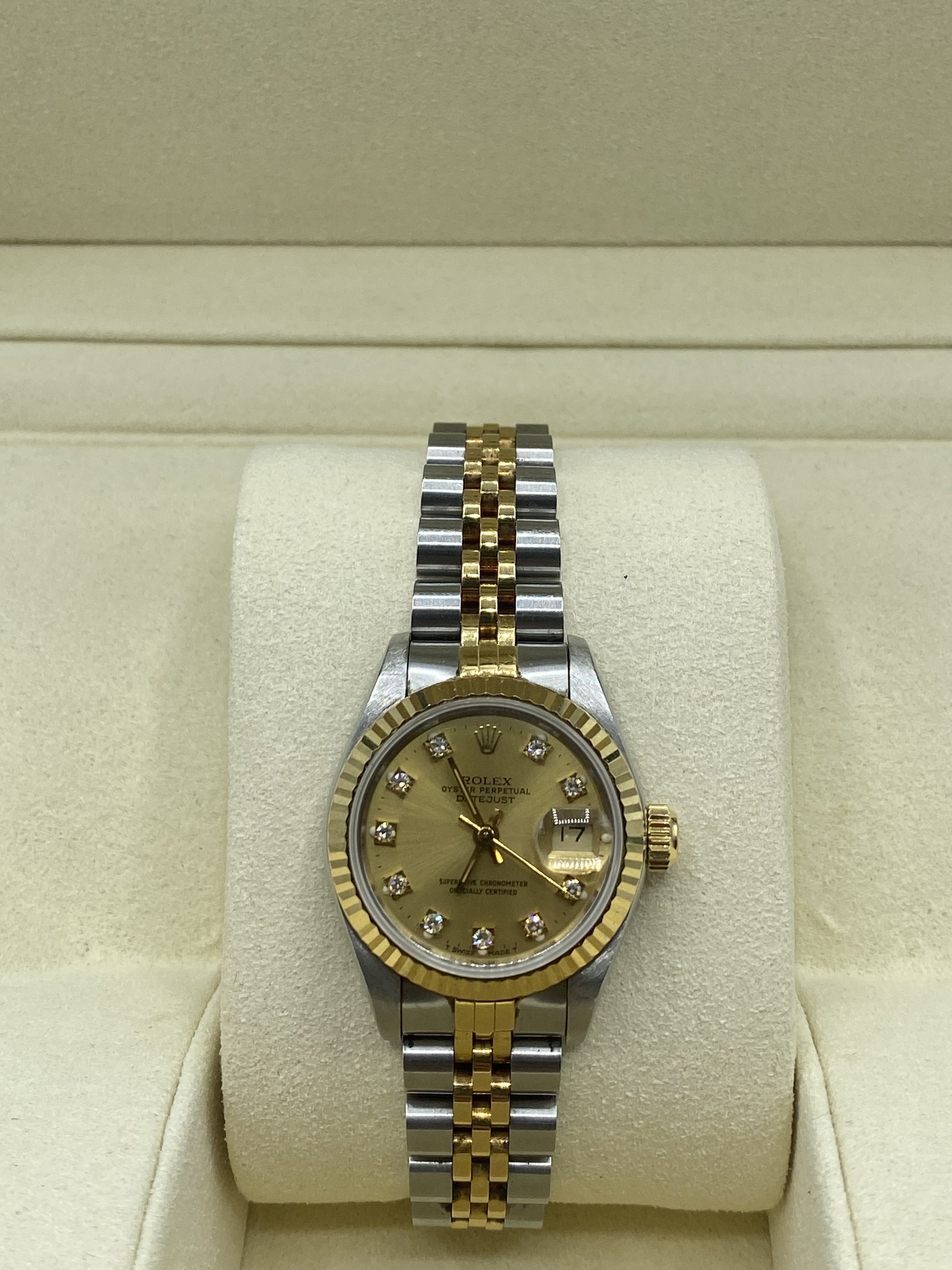 This iconic 26 mm Ladies Datejust features a 26mm stainless steel case with champagne dial, factory set diamond hour markers, 18k yellow gold fluted bezel and a oyster steel and 18k yellow gold jubilee bracelet. Whilst made in 1992, this watch is practically unworn, we rarely see a watch of this age in such pristine condition. It’s literally 33 years old and in better condition than most of our 2020 + watches.