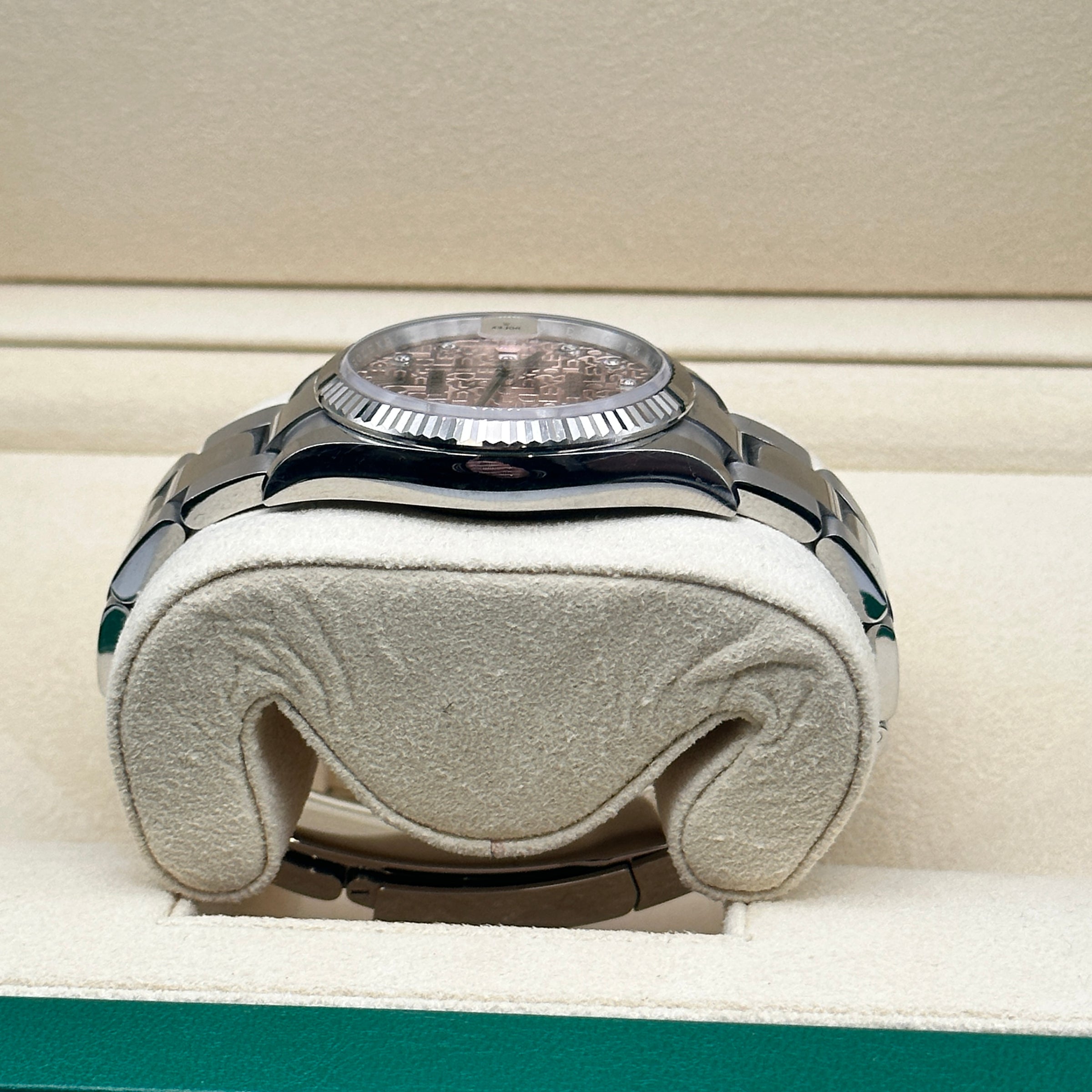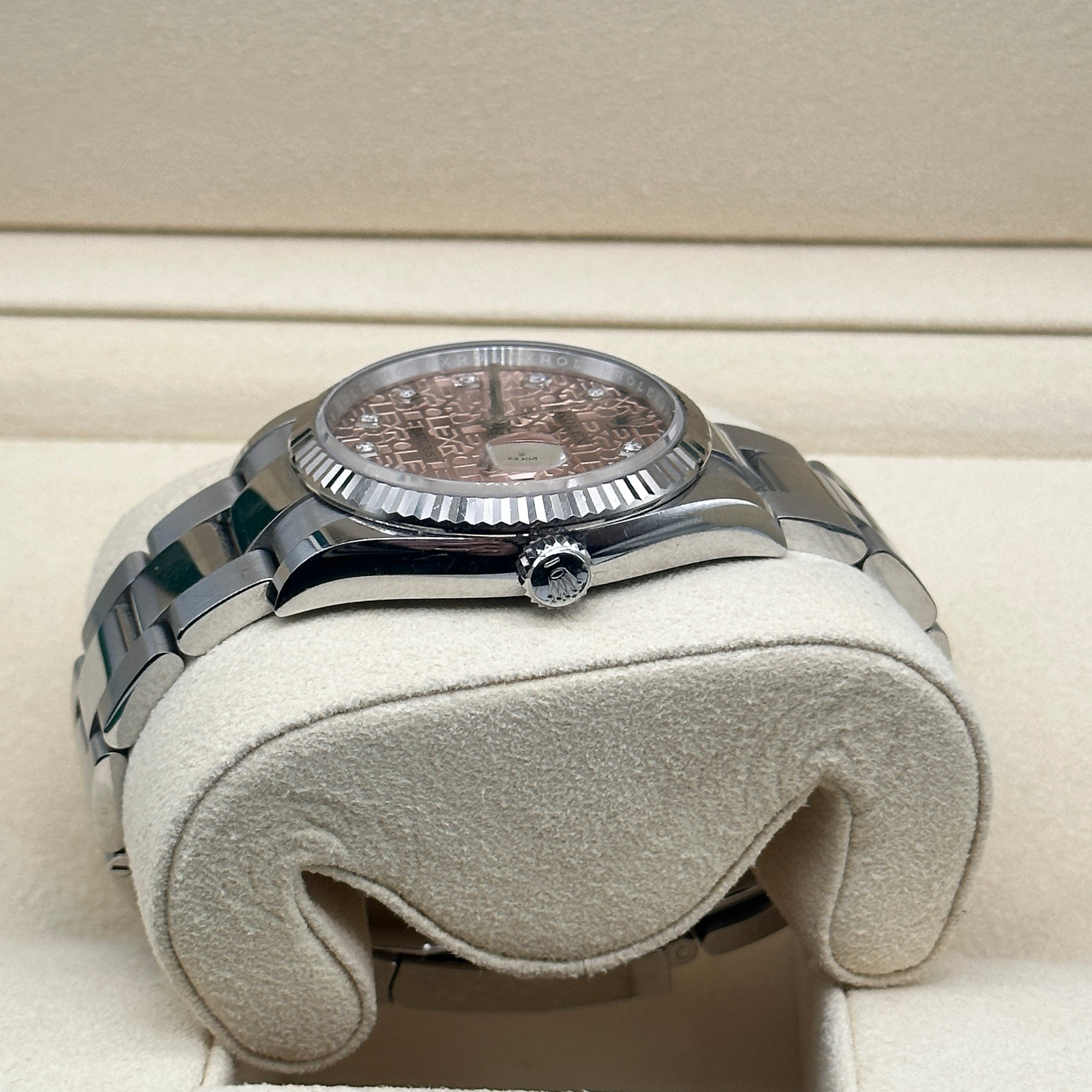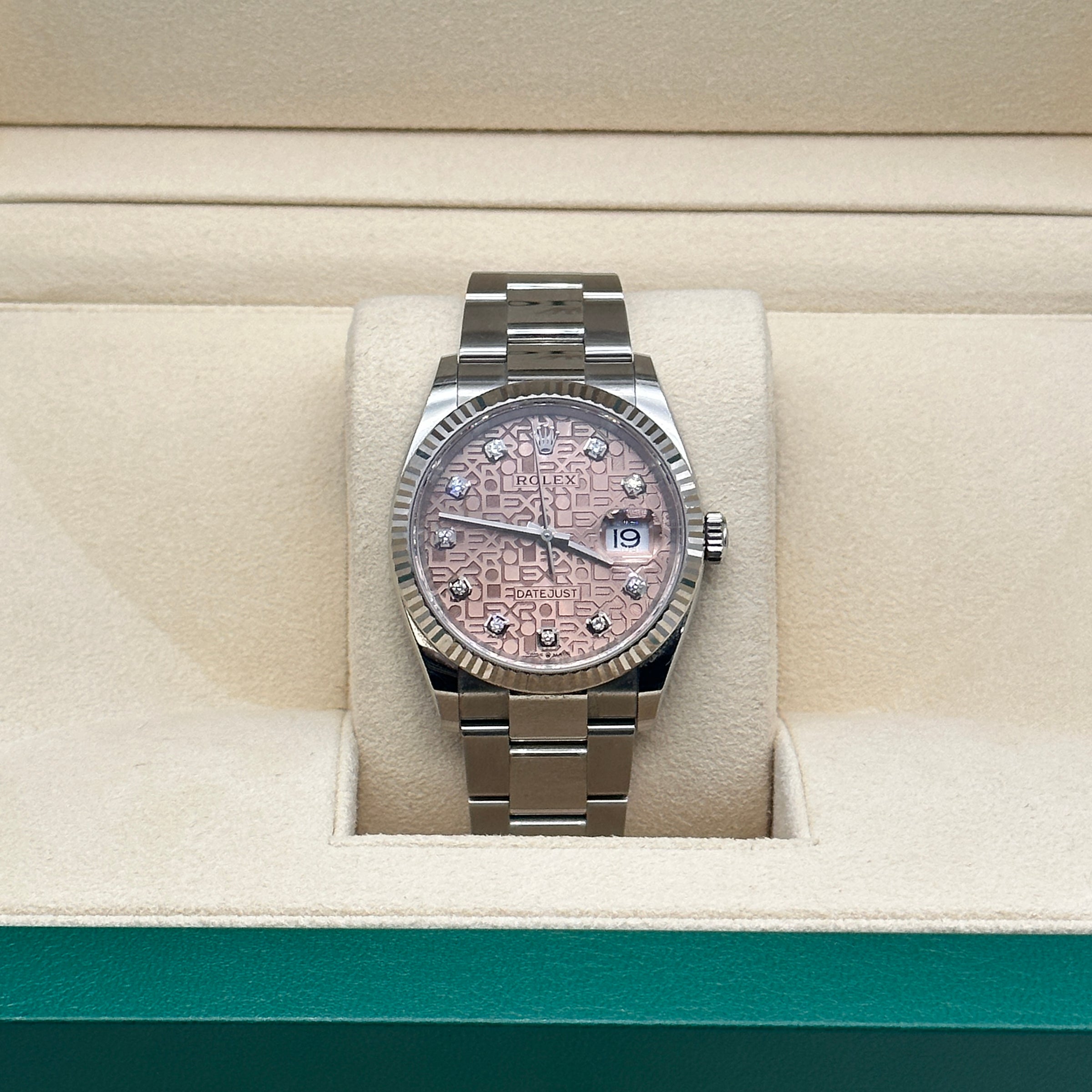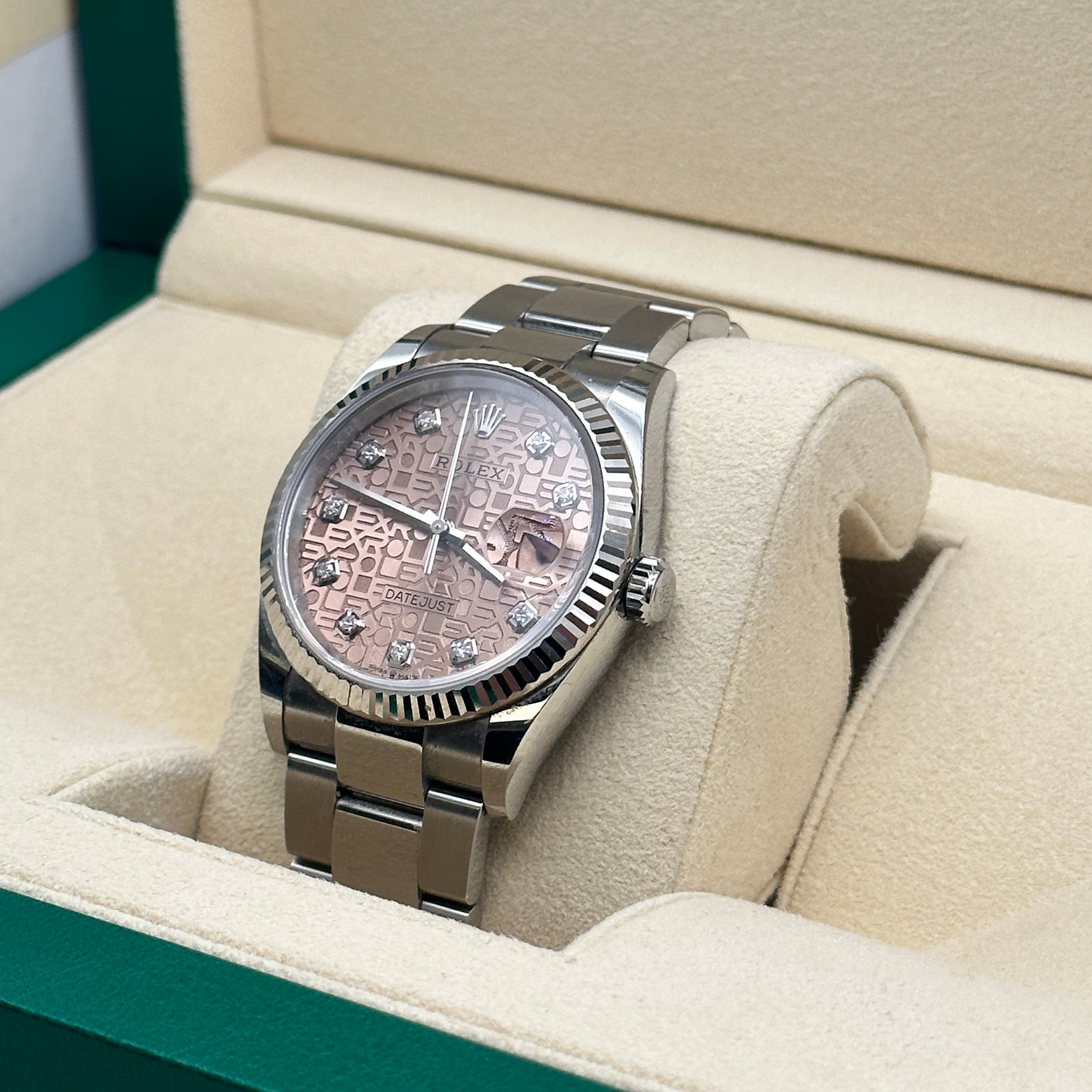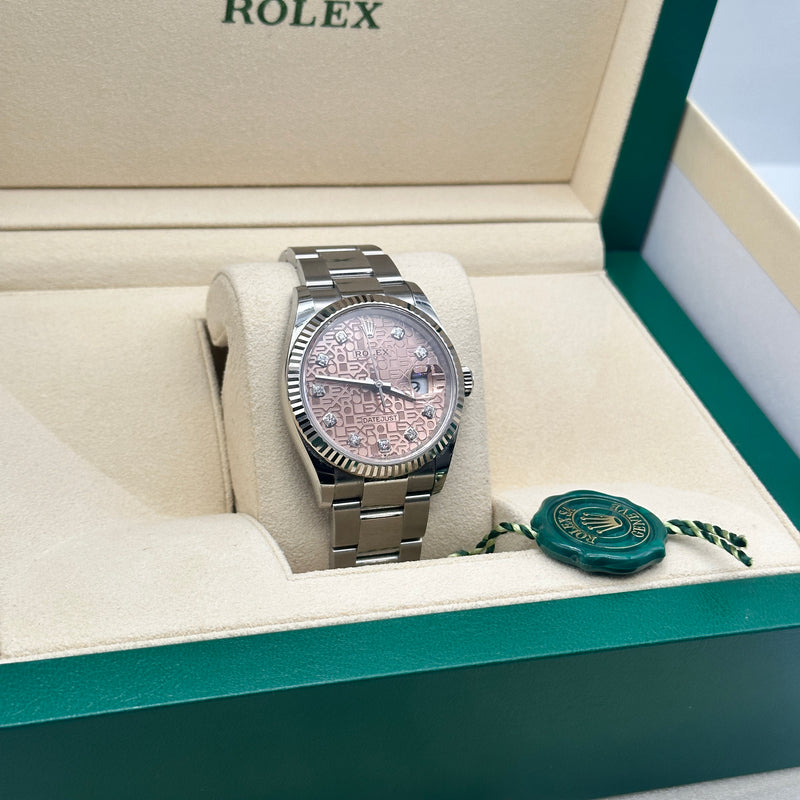 This stunning Rolex Datejust features 36mm stainless steel case, rose jubilee diamond dot dial with a white gold fluted bezel and a stainless steel oyster bracelet
