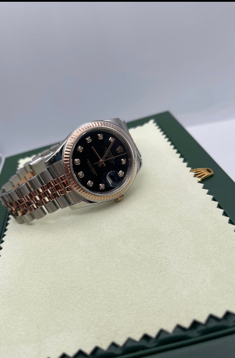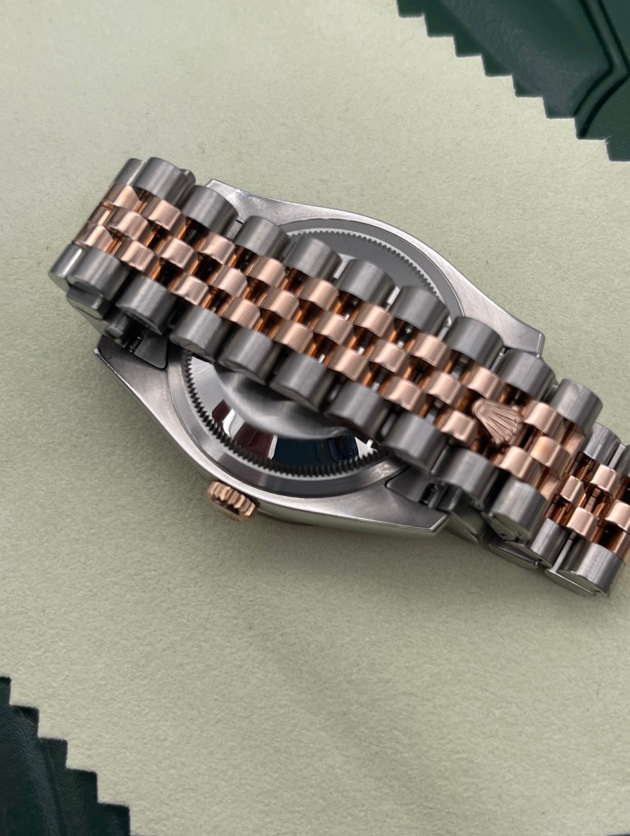 This stunning Rolex Datejust features a 36mm Stainless steel case, Ombre brown dial with diamond dot hour markers, a 18k everose gold fluted bezel, 18k everose screw down crown and a sapphire crystal. This watch comes on a 18k everose and stainless steel bracelet with an integrated clasp.