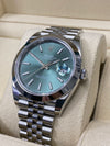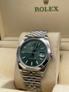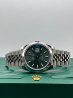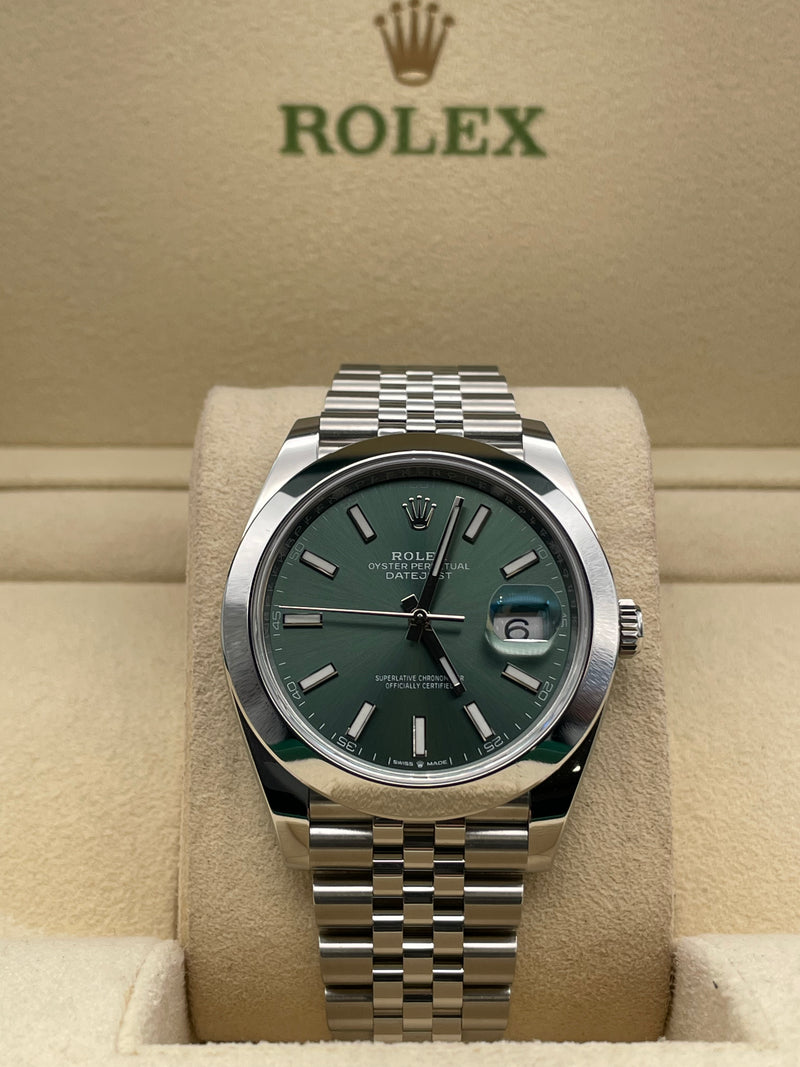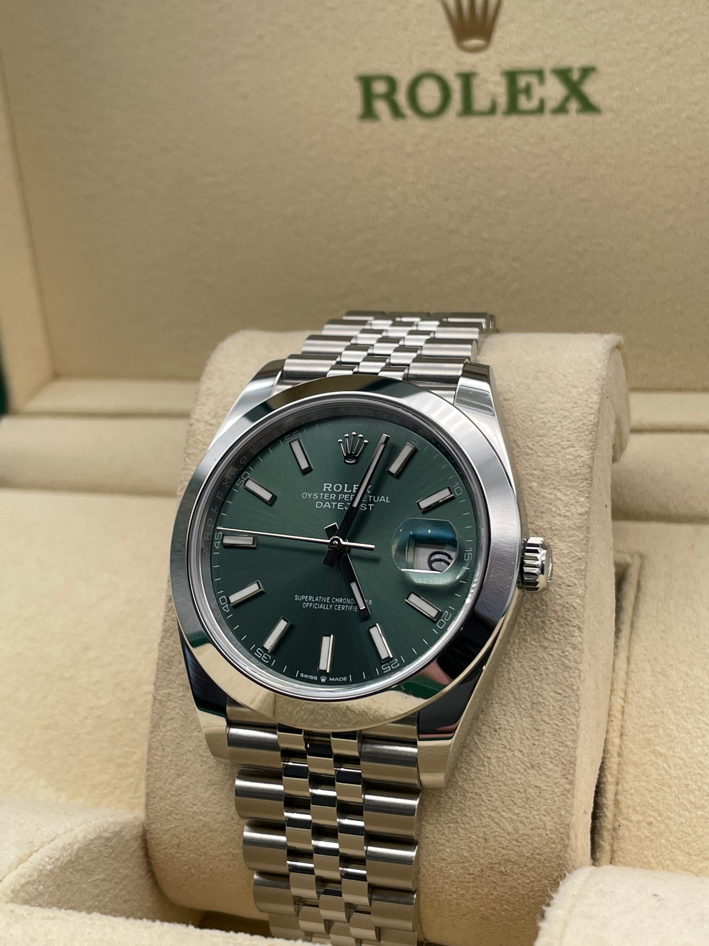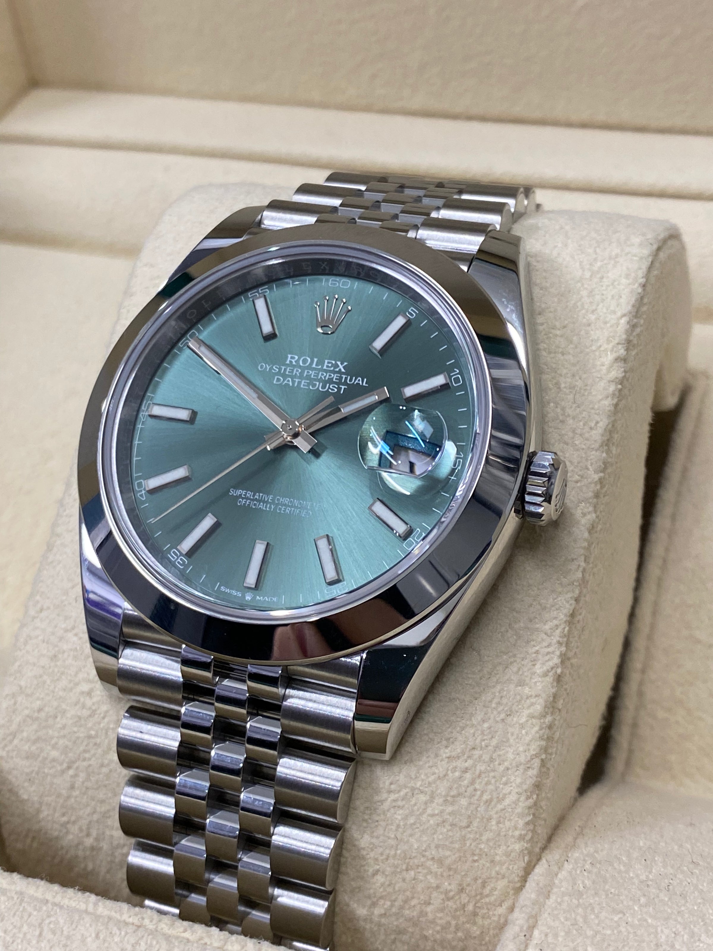 Rolex Datejust 41mm featuring a mint green dial and smooth bezel on a jubilee bracelet. December 2022 registration. Brand new.