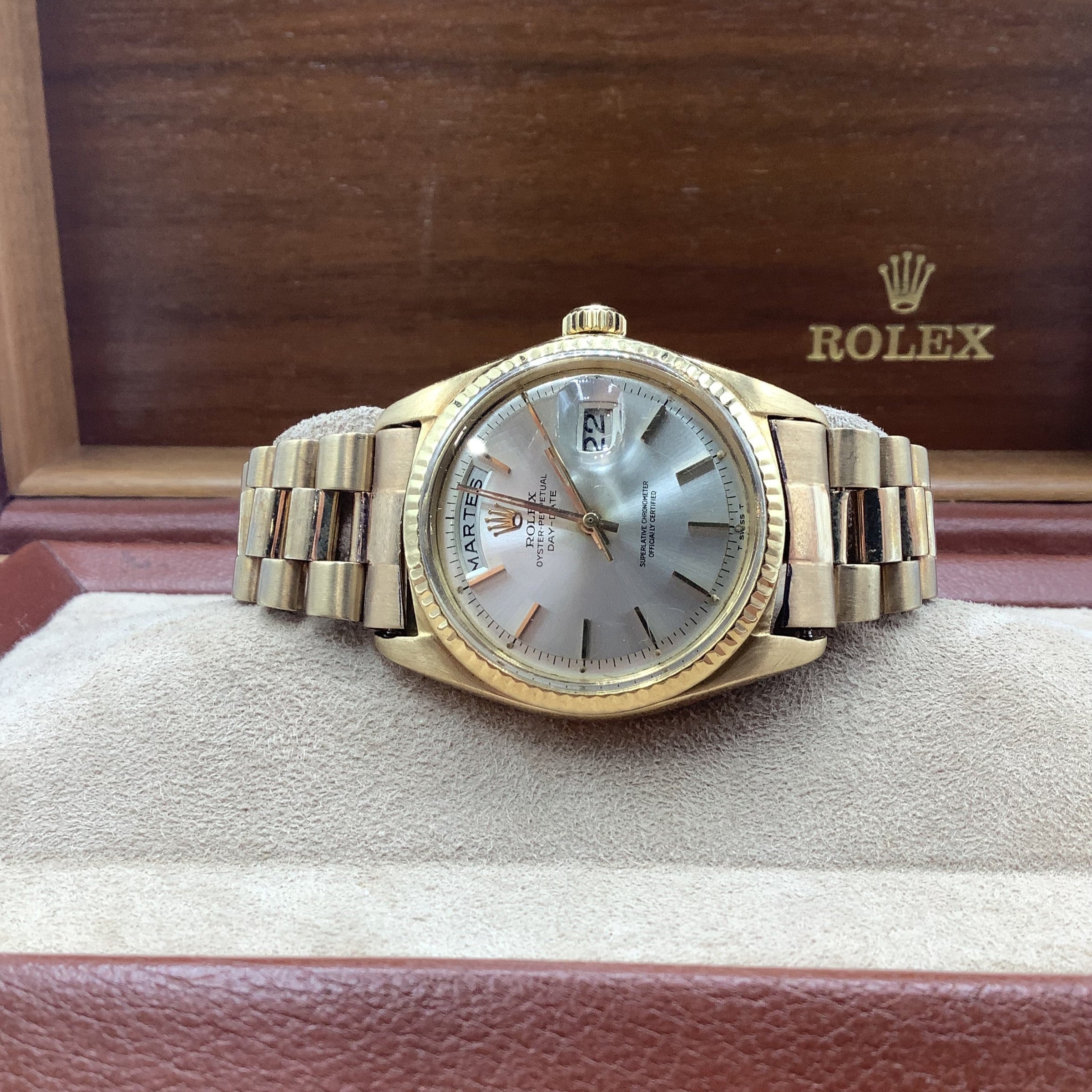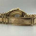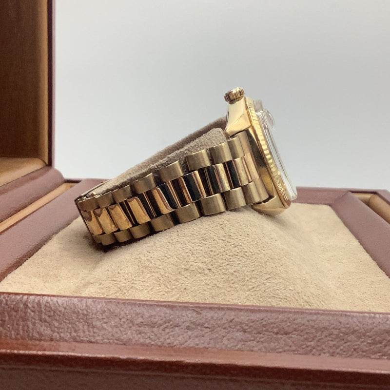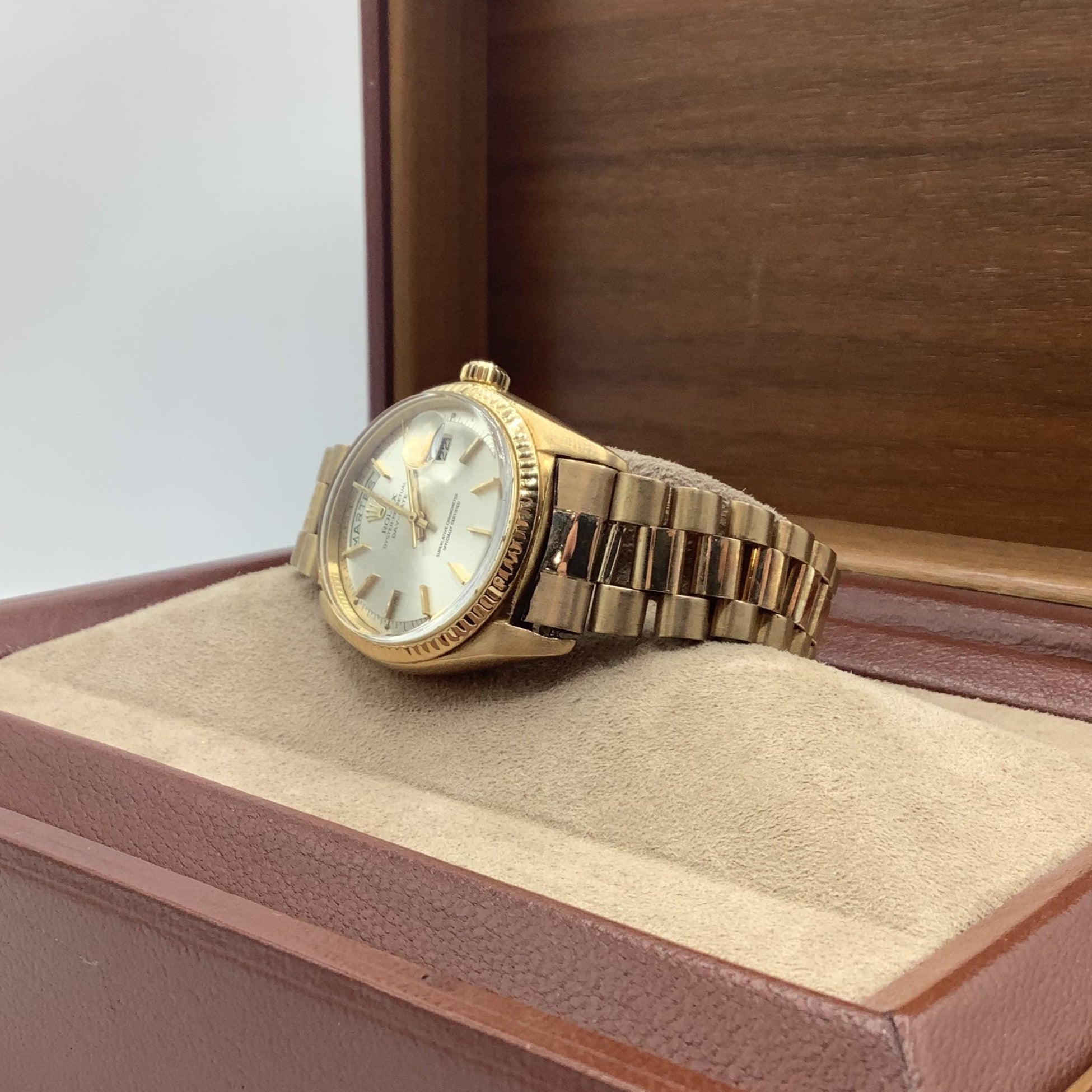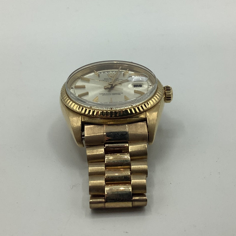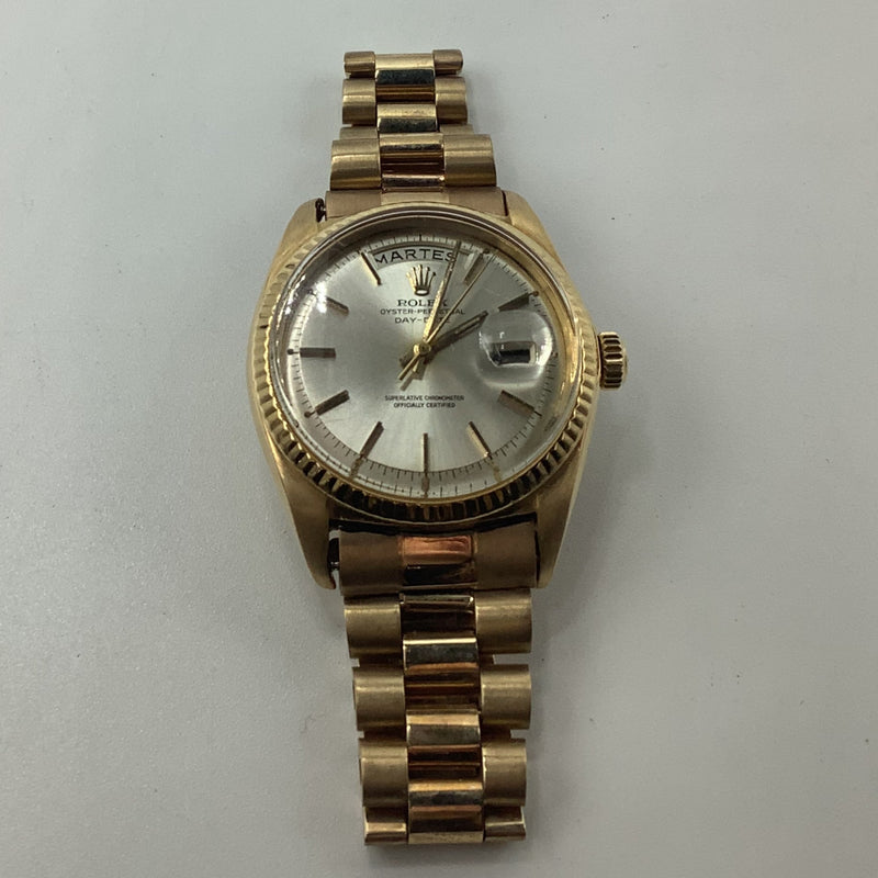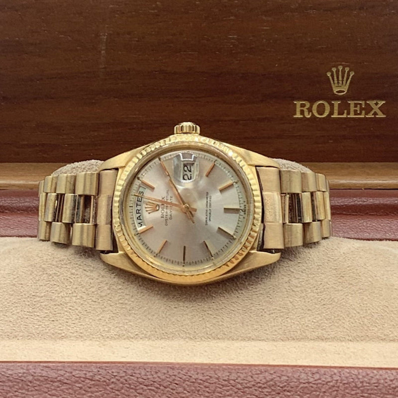 This Rolex Day-Date reference 1803/8 has a 36mm case crafted from 18k yellow gold. The watch showcases a distinctive champagne "pie-pan" dial, a distinctive design element cherished by vintage watch collectors. Another charming aspect of this particular watch is the day wheel's Spanish text. This Day-Date is on an aftermarket, 9-carat President-style bracelet. Aftermarket bracelets are common on Day-Dates of this vintage, as the original bracelets of the era often wore out with regular use.