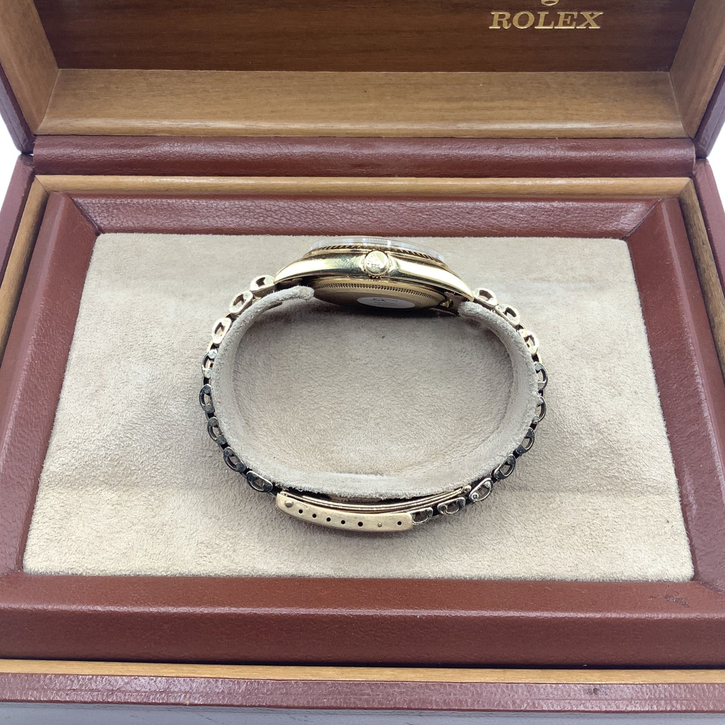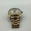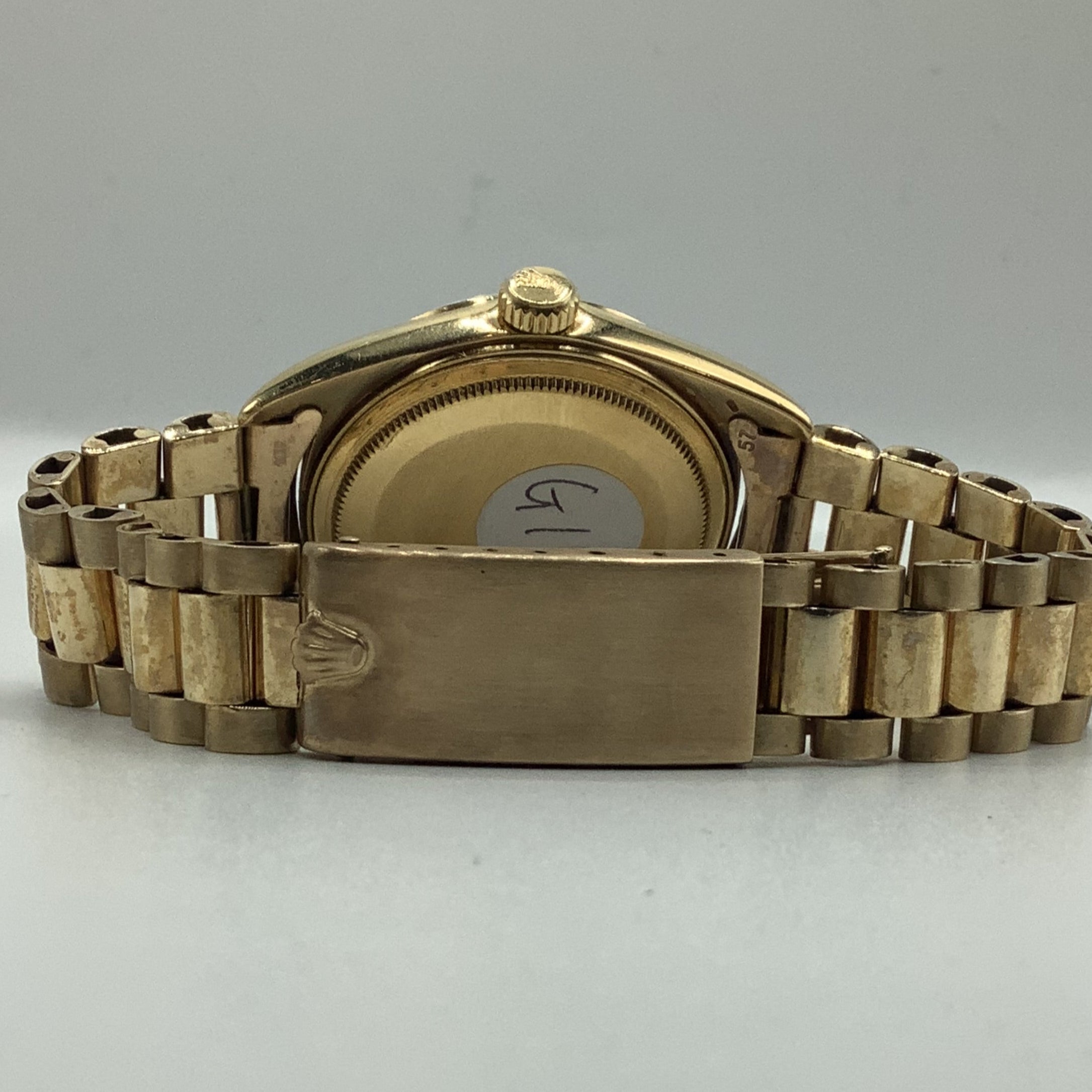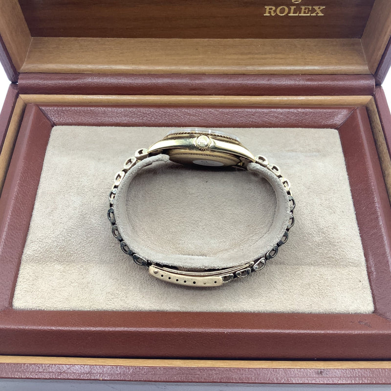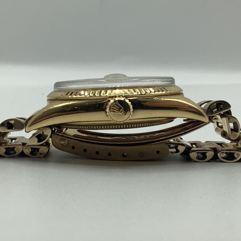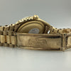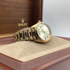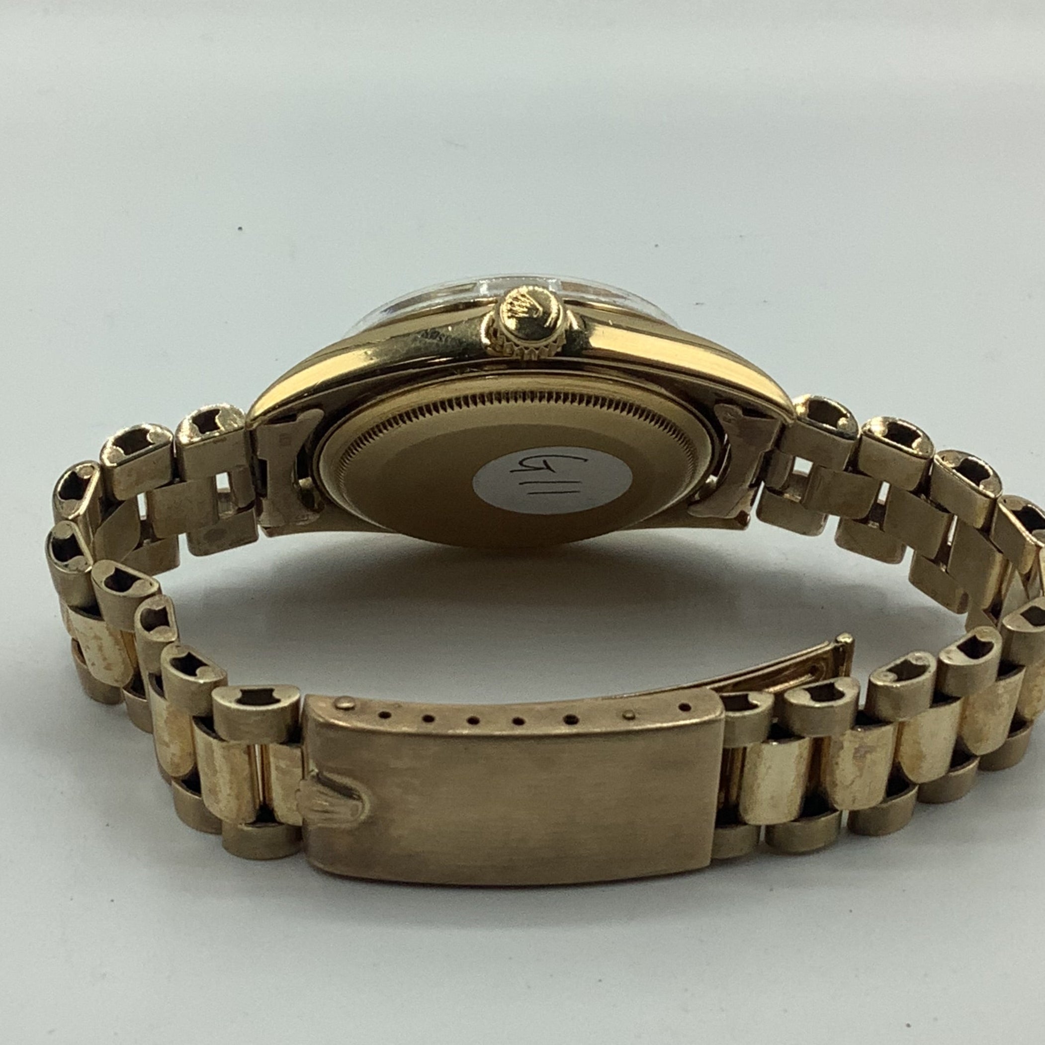 This Rolex Day-Date reference 1803/8 has a 36mm case crafted from 18k yellow gold. The watch showcases a distinctive champagne "pie-pan" dial, a distinctive design element cherished by vintage watch collectors. Another charming aspect of this particular watch is the day wheel's Spanish text. This Day-Date is on an aftermarket, 9-carat President-style bracelet. Aftermarket bracelets are common on Day-Dates of this vintage, as the original bracelets of the era often wore out with regular use.