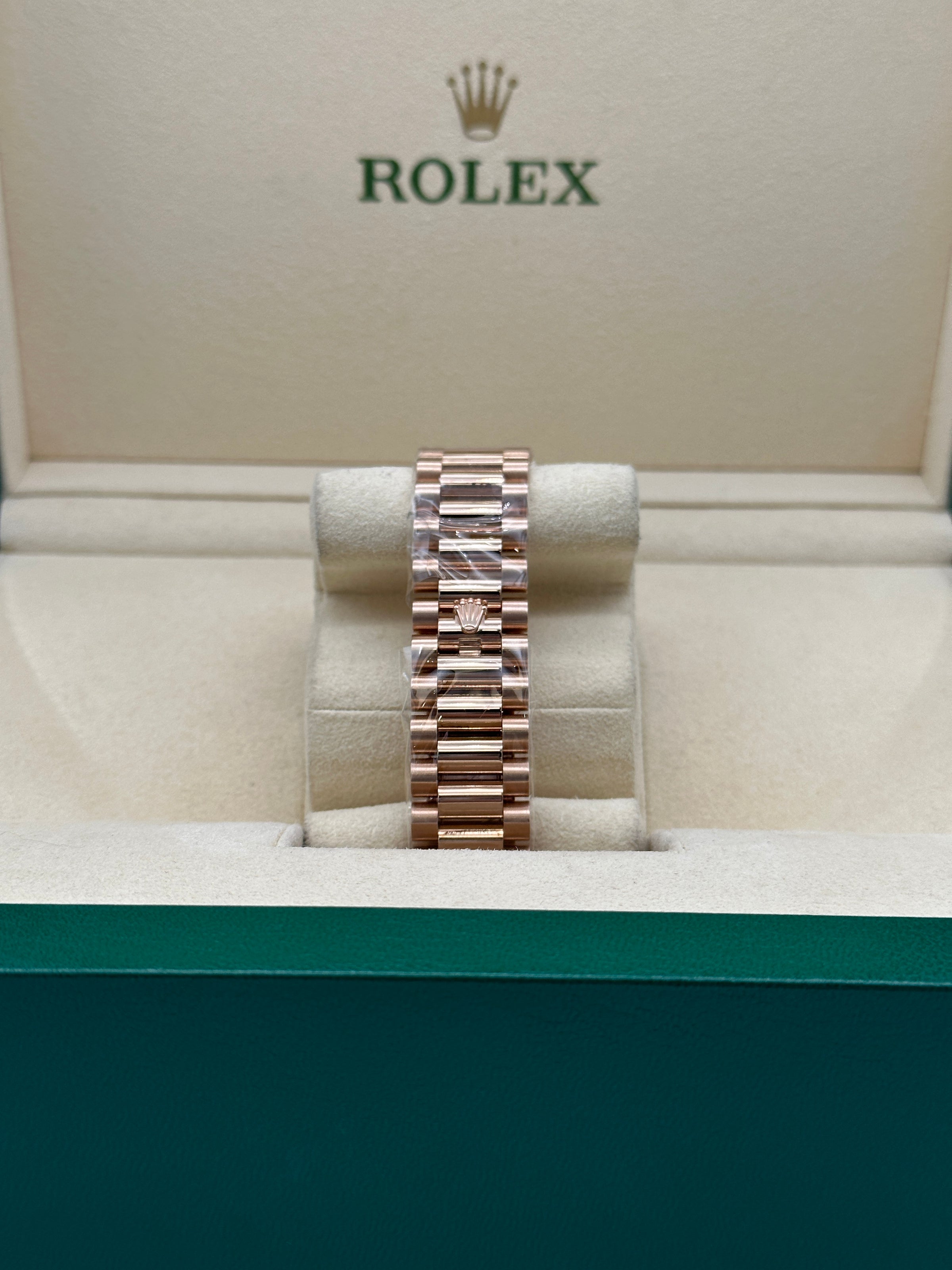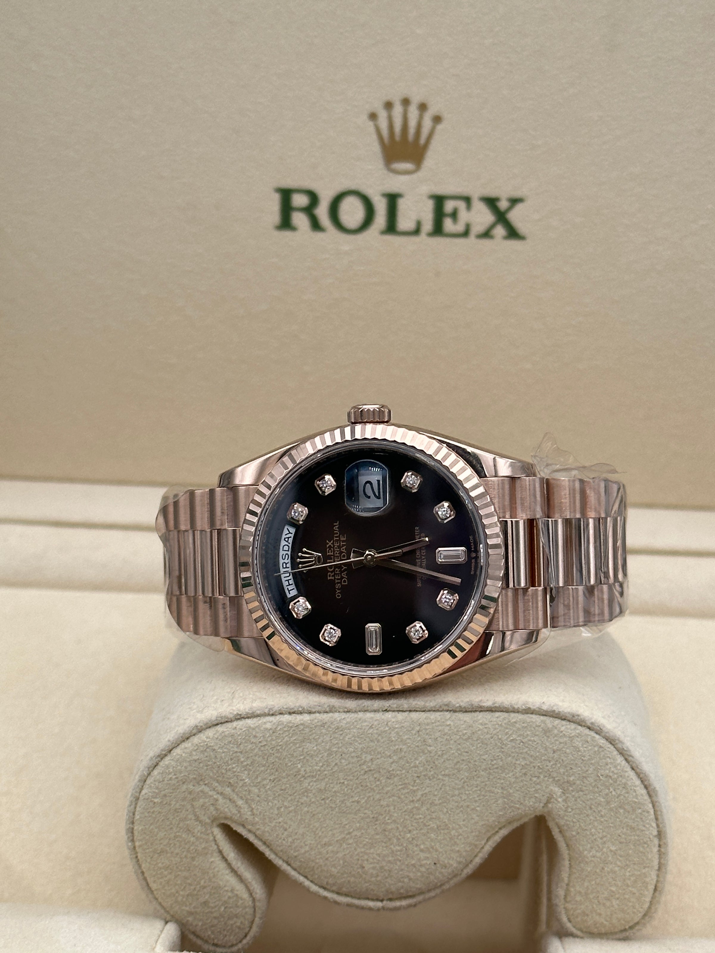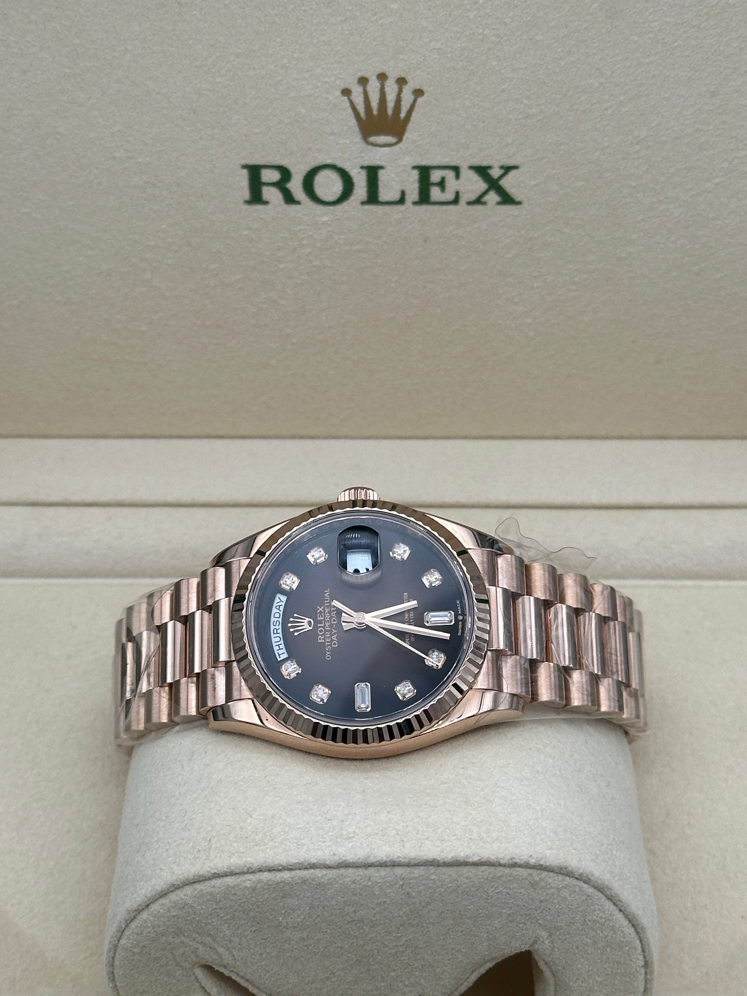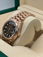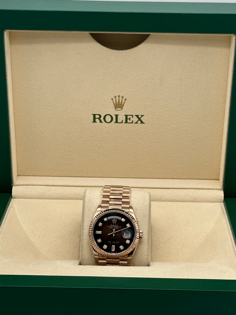 This stunning Rolex Day-Date features a 36mm solid 18K everose gold case, everose gold fluted bezel, brown ombre dial with diamond hour markers and comes on a 18k everose presidential bracelet.
