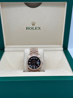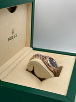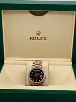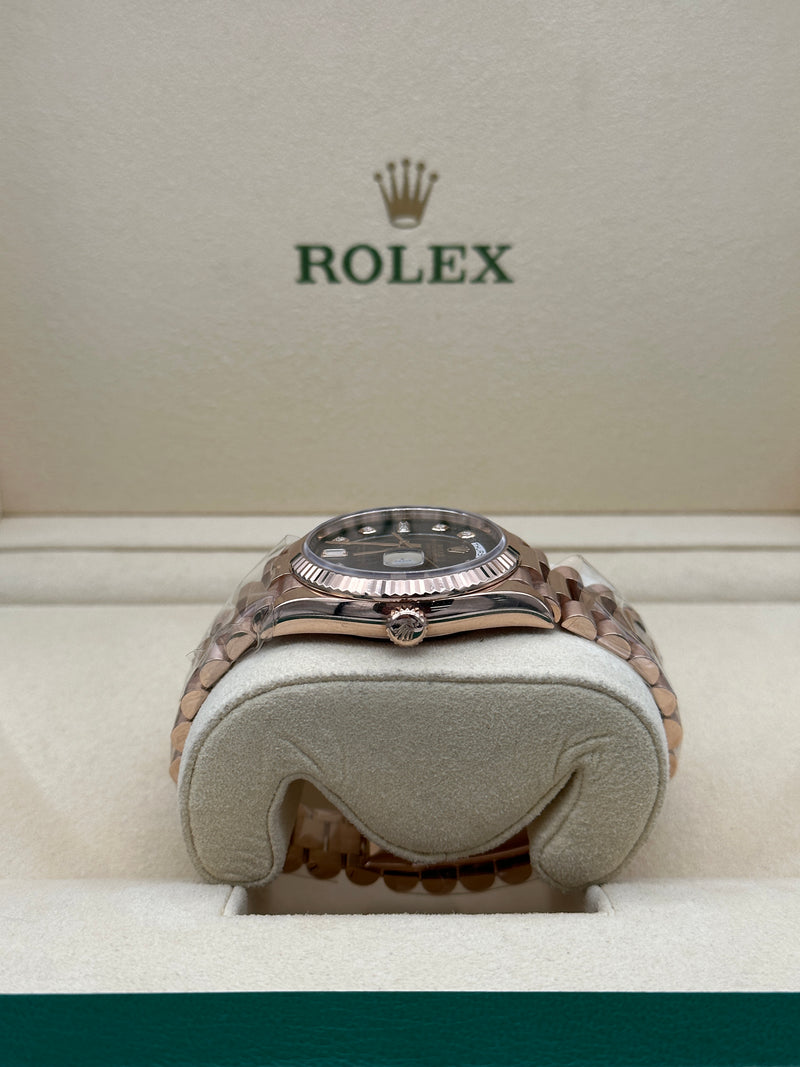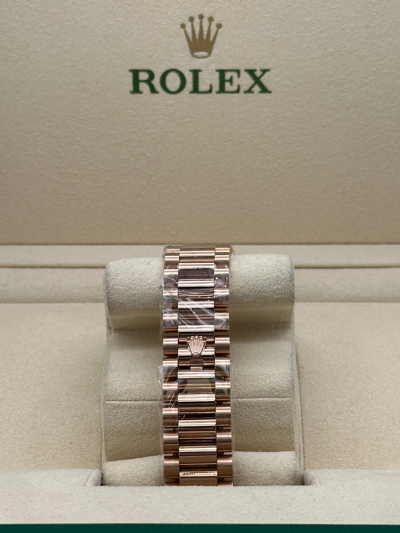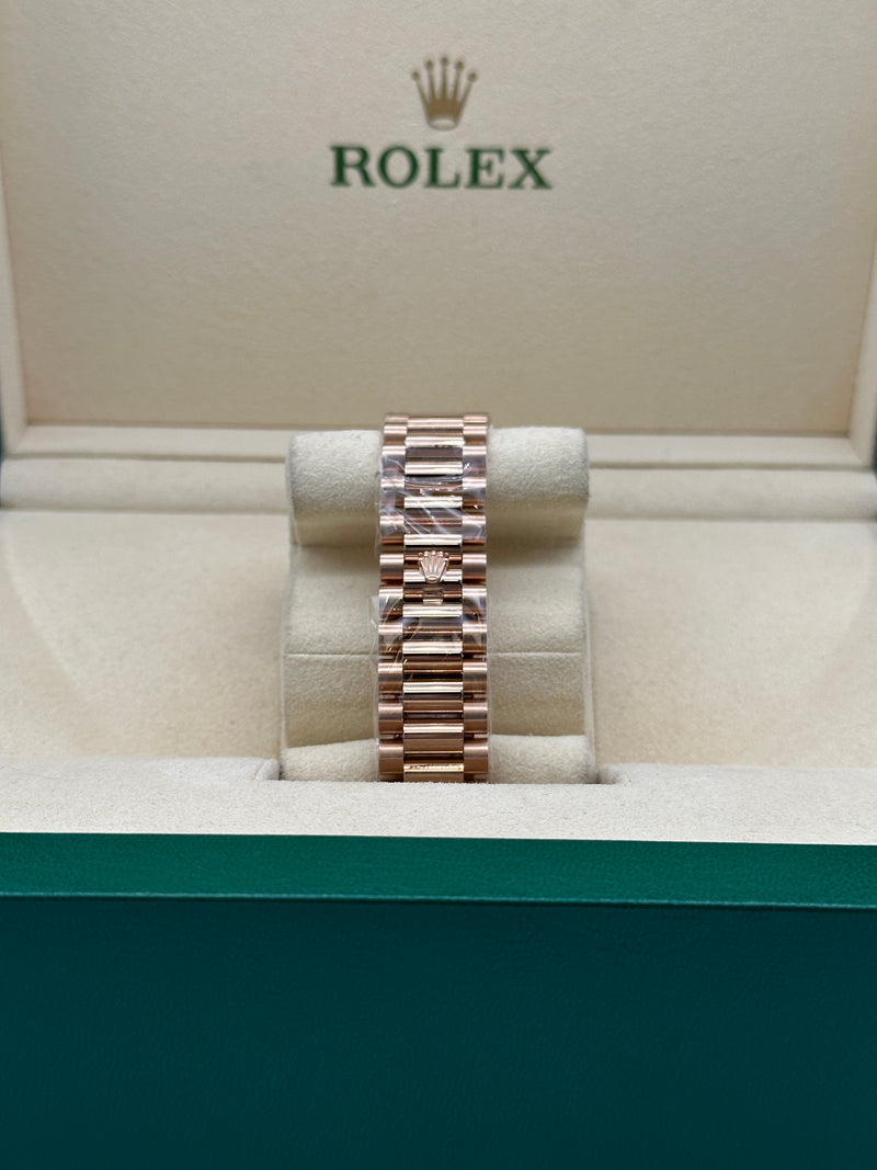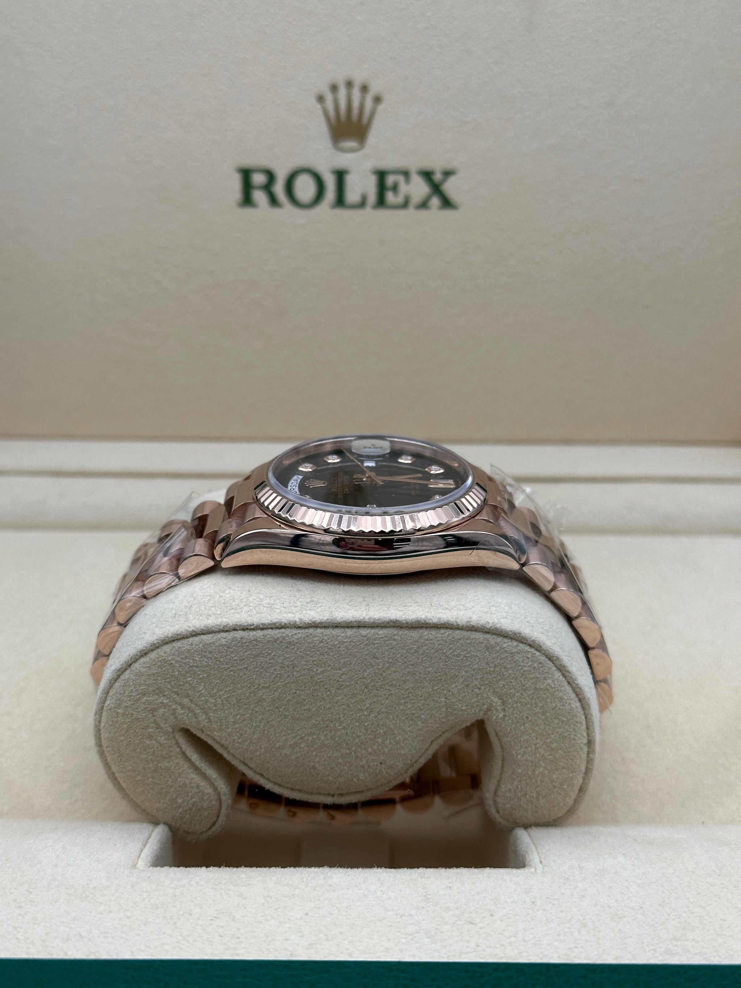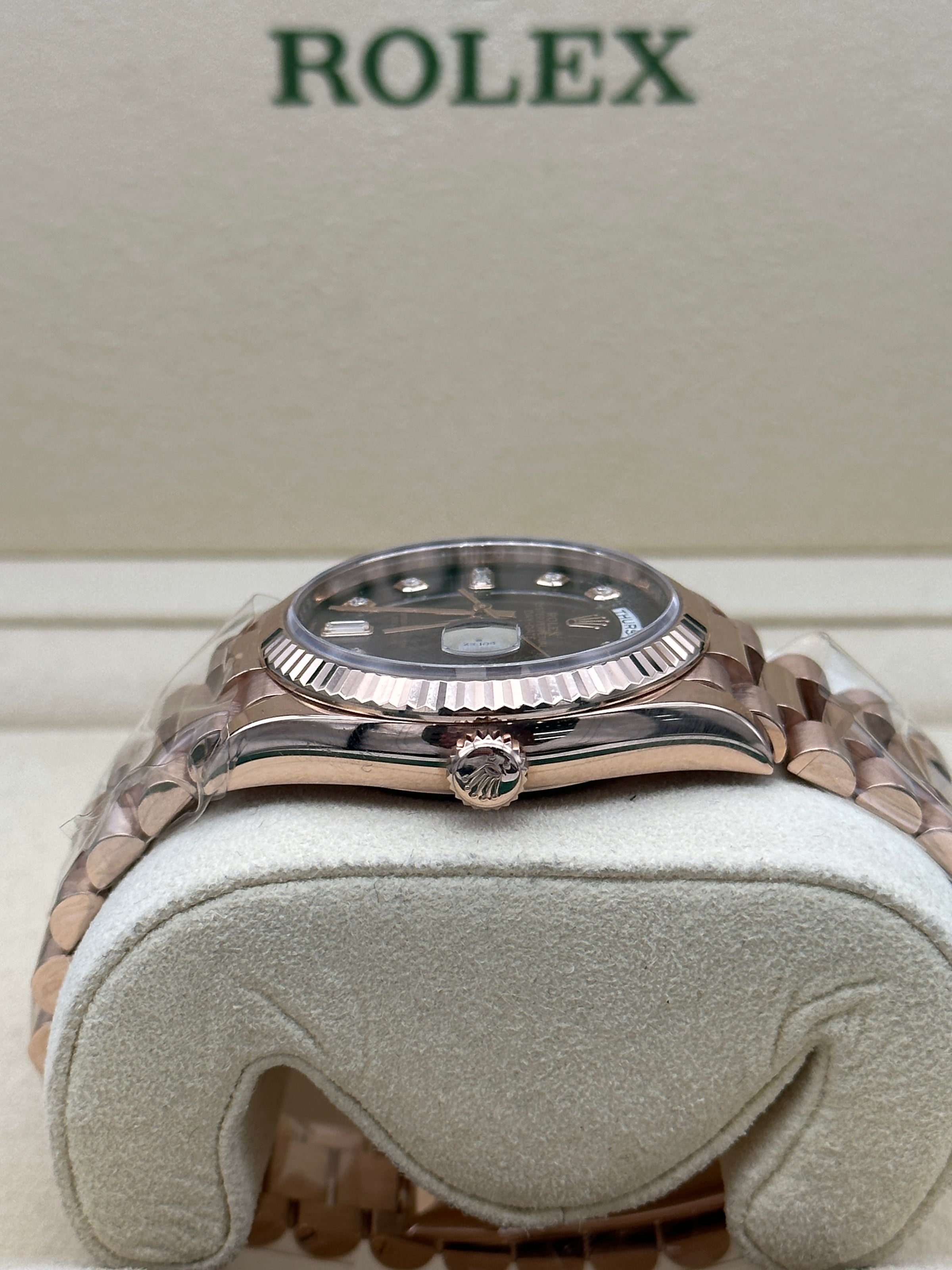 This stunning Rolex Day-Date features a 36mm solid 18K everose gold case, everose gold fluted bezel, brown ombre dial with diamond hour markers and comes on a 18k everose presidential bracelet.