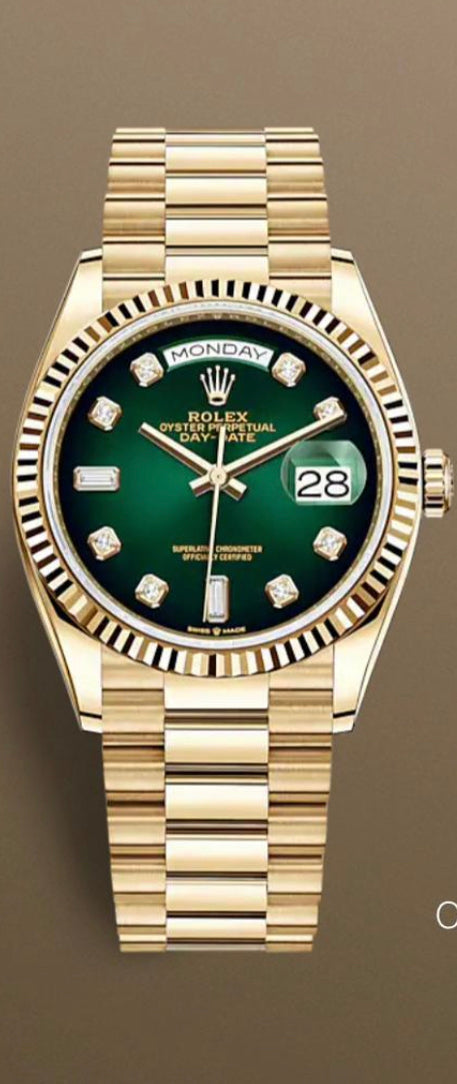 18k yellow gold case with a gold-tone 18k yellow gold rolex president bracelet.