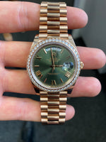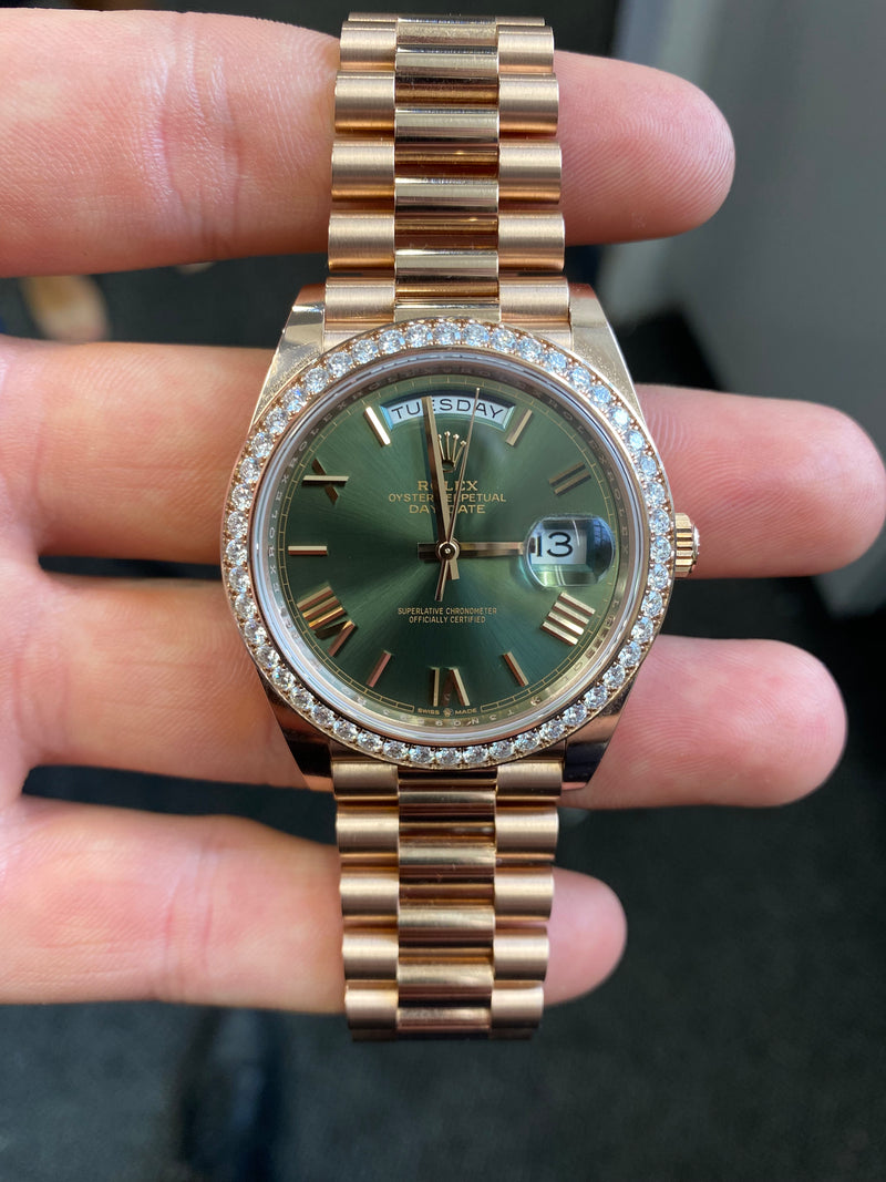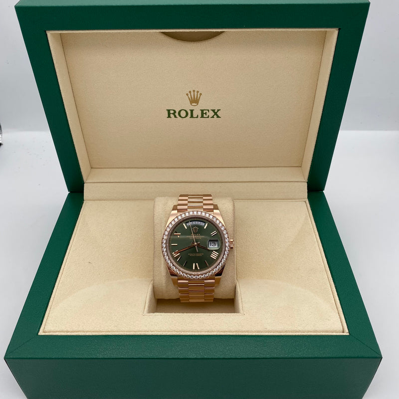 THE OYSTER PERPETUAL DAY-DATE 40 IN 18 CT EVEROSE GOLD WITH AN OLIVE-GREEN DIAL, DIAMOND-SET BEZEL AND A PRESIDENT BRACELET.(228345RBR).
