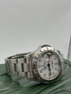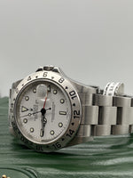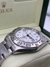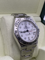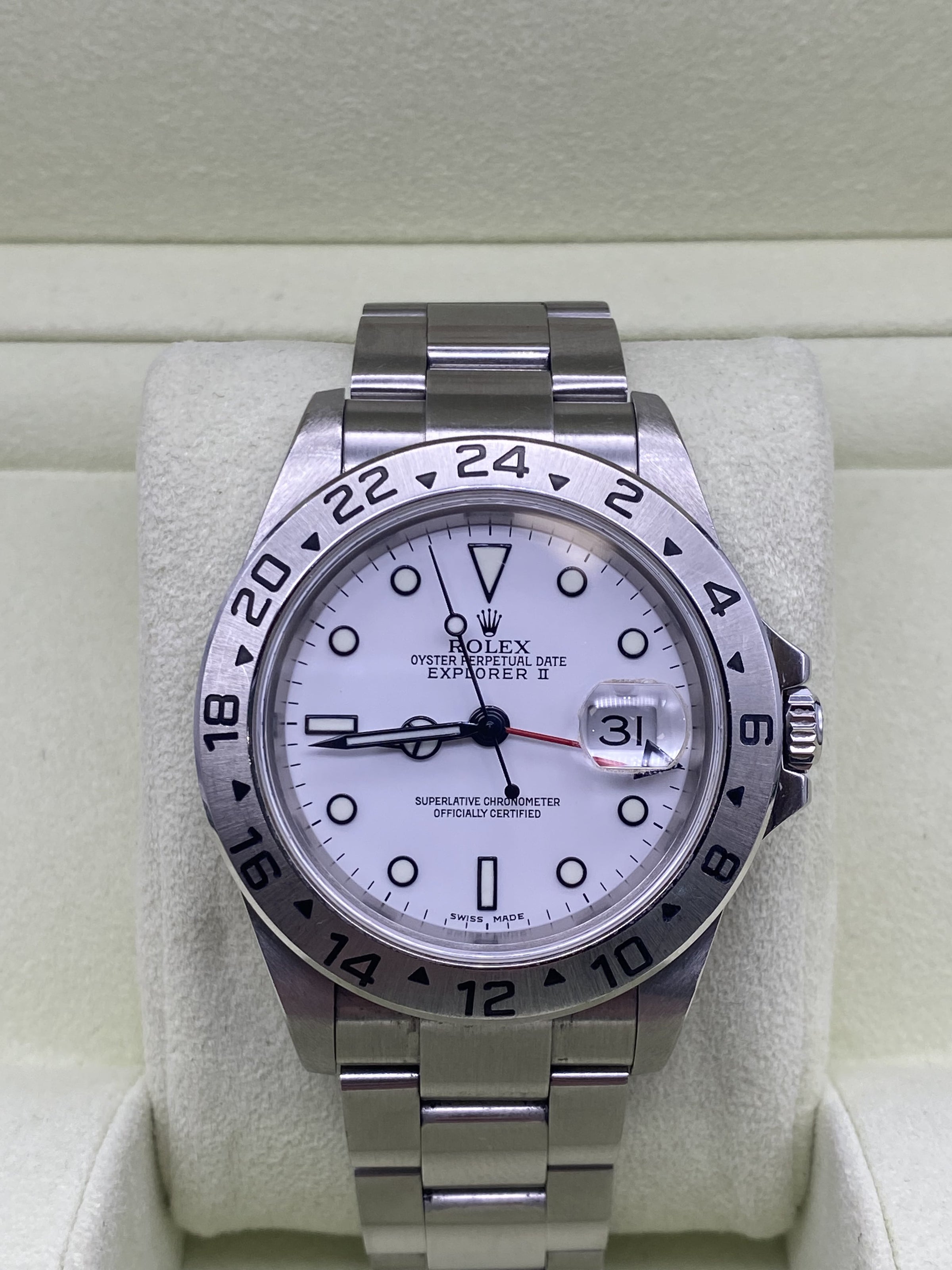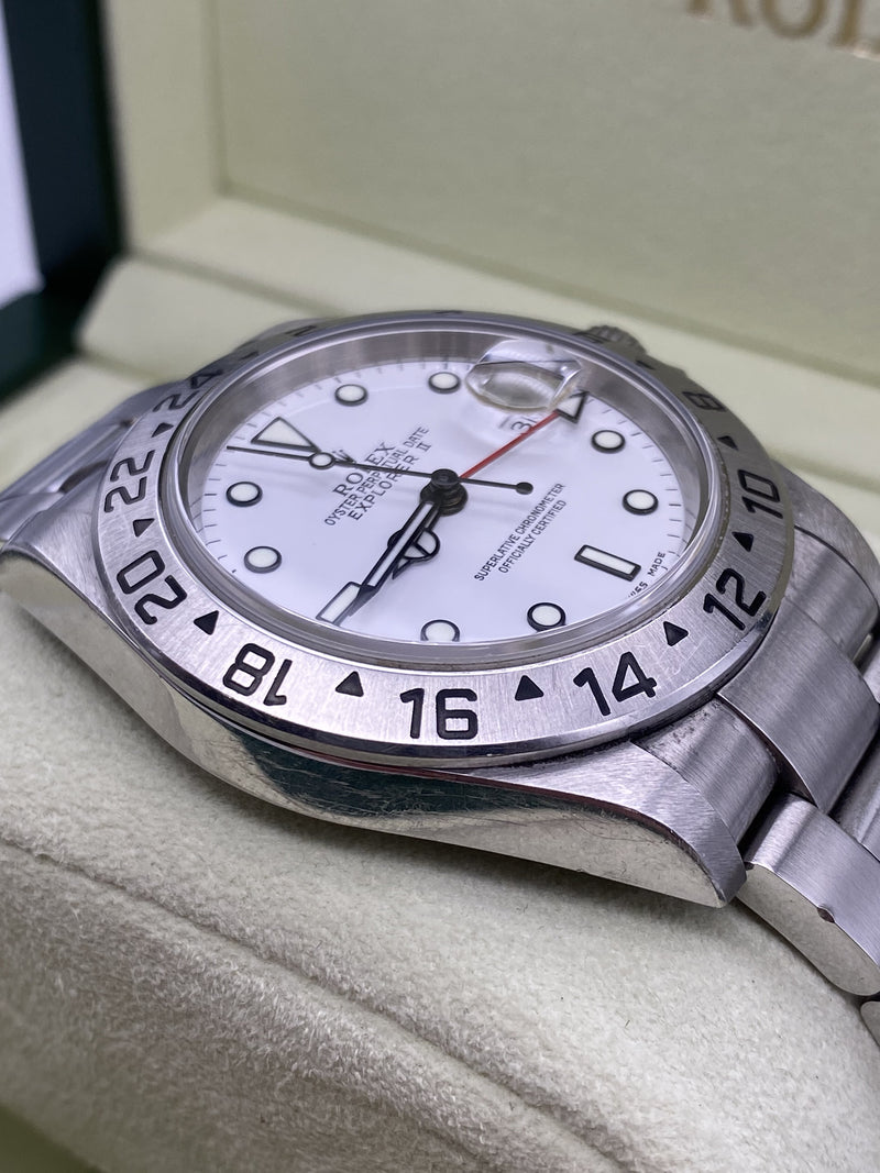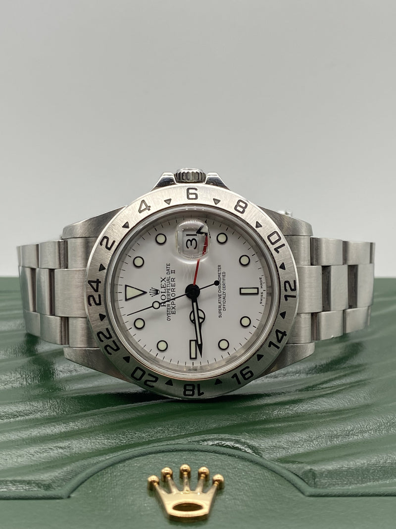 Materials & Design: The Rolex Explorer II reference 16570 features a 40mm stainless steel Oyster case, embodying durability and resilience. It is available with a white "Polar" dial, both offering excellent legibility. The fixed 24-hour bezel and additional GMT hand allow wearers to track a second time zone or distinguish between day and night. The watch is fitted with a stainless steel Oyster bracelet, ensuring both comfort and robustness.