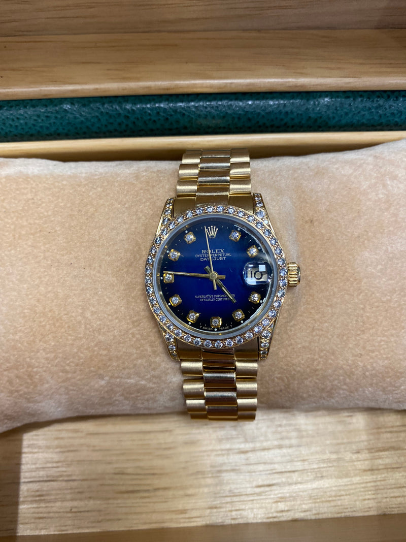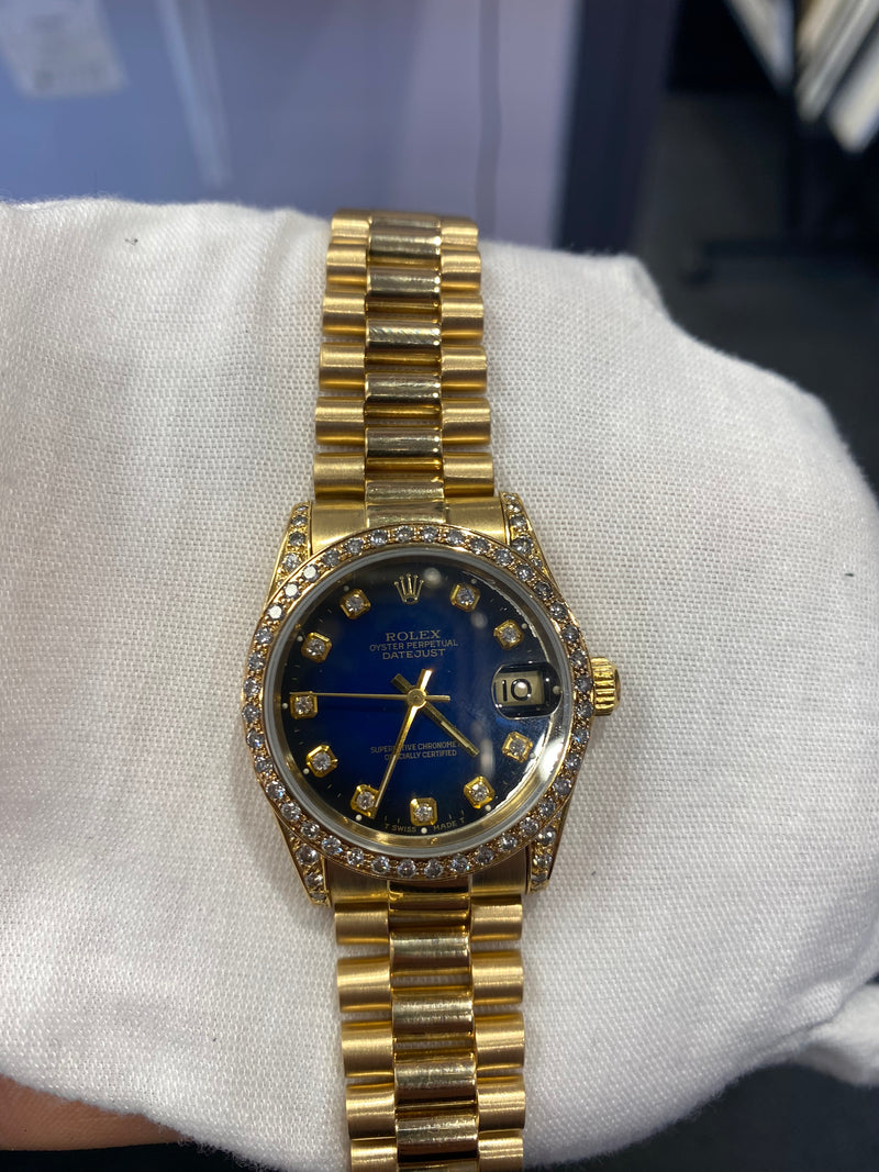A Stunning 18k yellow gold 28mm ladies datejust on a presidential bracelet. This watch was produced in 1991 and comes with diamond hour markers as well as a diamond bezel with dark blue face. Brand new 2022 movement (no box or paperwork).
