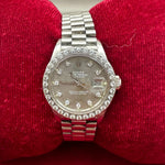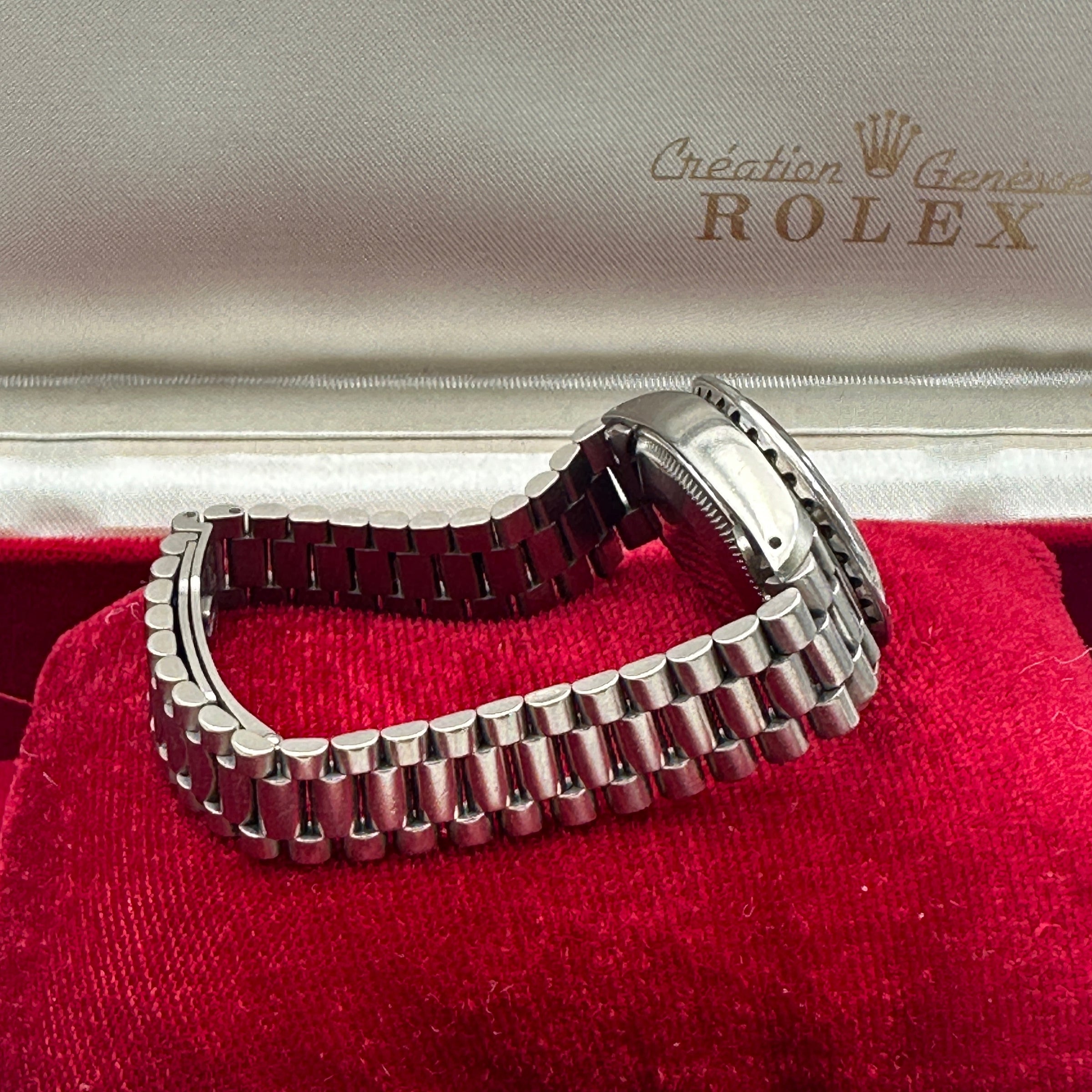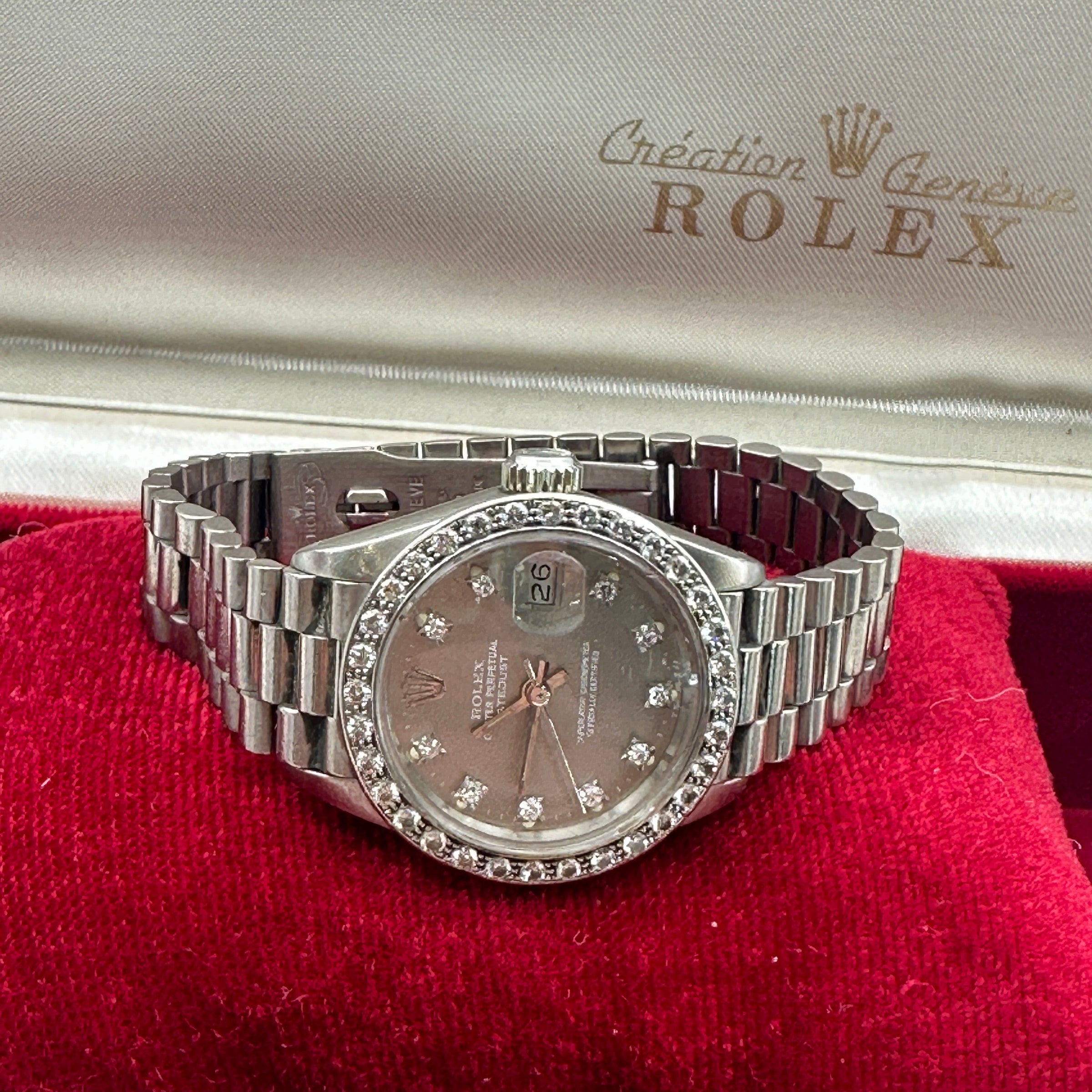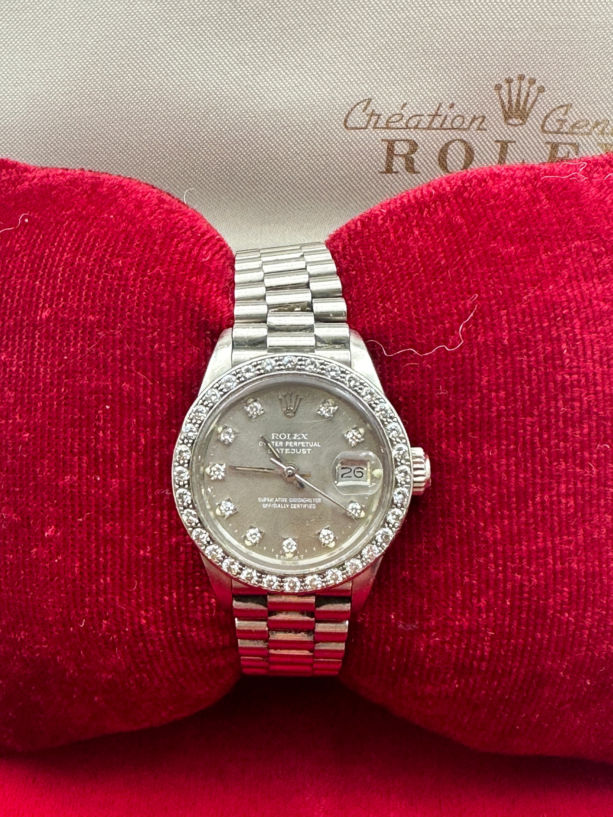 Rolex Lady-Datejust, reference 6913/9, crafted in 18ct white gold. The 26mm case is set with a diamond bezel and complemented by a grey, diamond-set dial. It is fitted to the elegant President bracelet, also in solid white gold. Powered by the Rolex automatic calibre 2030 movement with 28 jewels, it features the iconic date function visible through the cyclops magnifier. This vintage model dates from 1979 and was serviced by Rolex in 2006, proving authenticity.