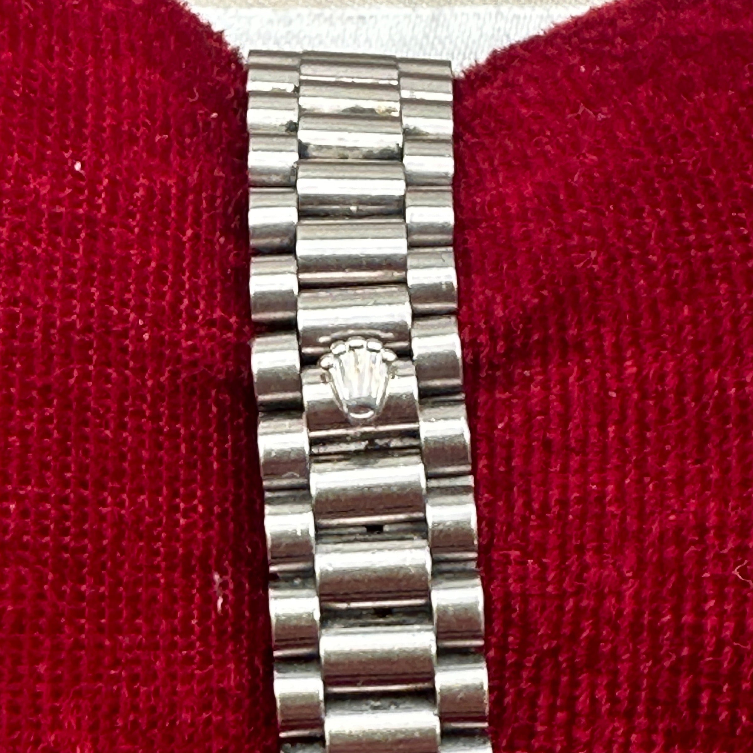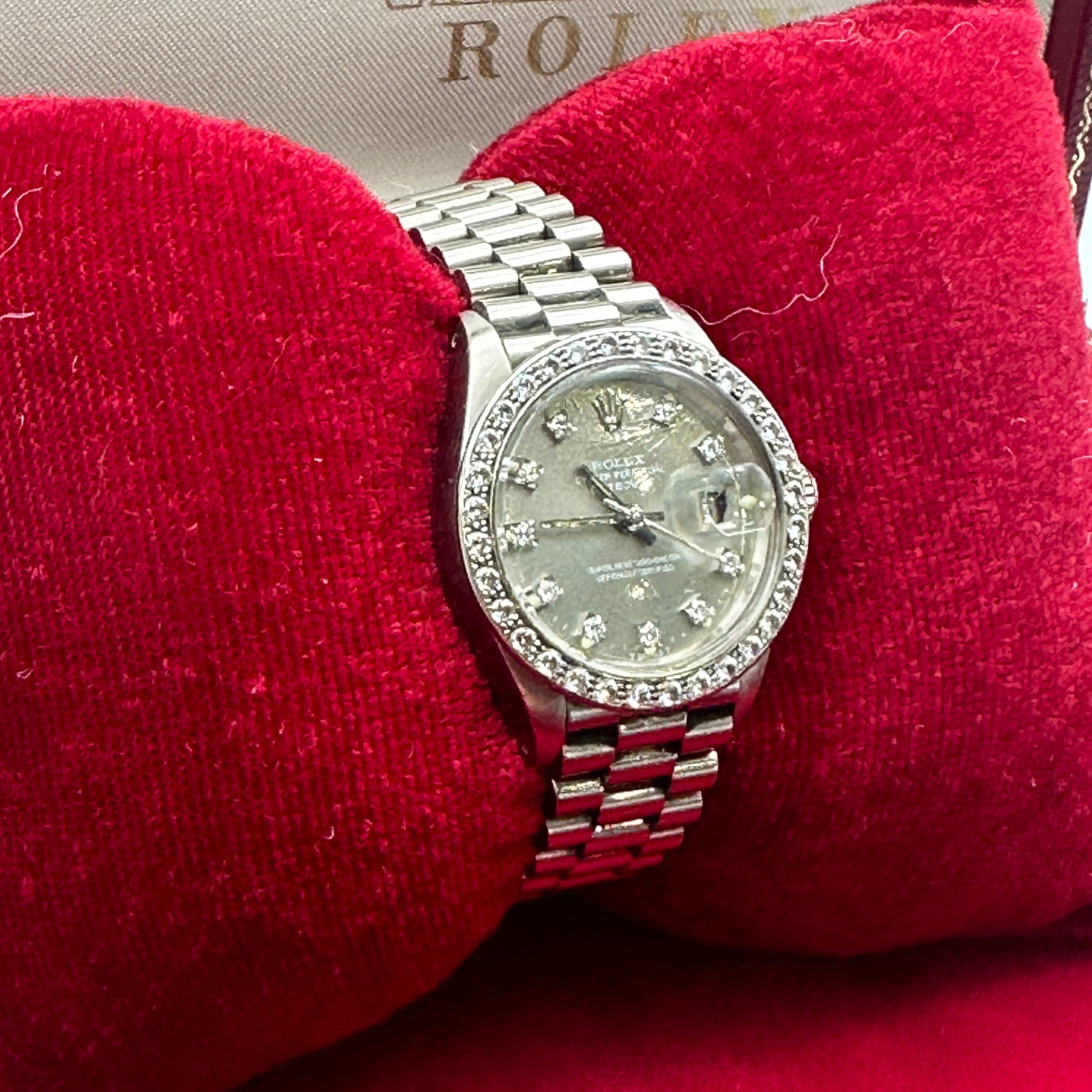 Rolex, established in 1905, is celebrated worldwide for its precision, innovation and timeless design. The Datejust, introduced in 1945, was the first self-winding wristwatch with an automatically changing date window, setting a new standard in horology. The Lady-Datejust brings the same heritage in a reduced size. The reference 6913/9, with its diamond-set dial, diamond bezel and prestigious President bracelet, stands as a perfect expression of Rolex’s blend of technical mastery and luxury design.