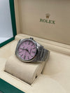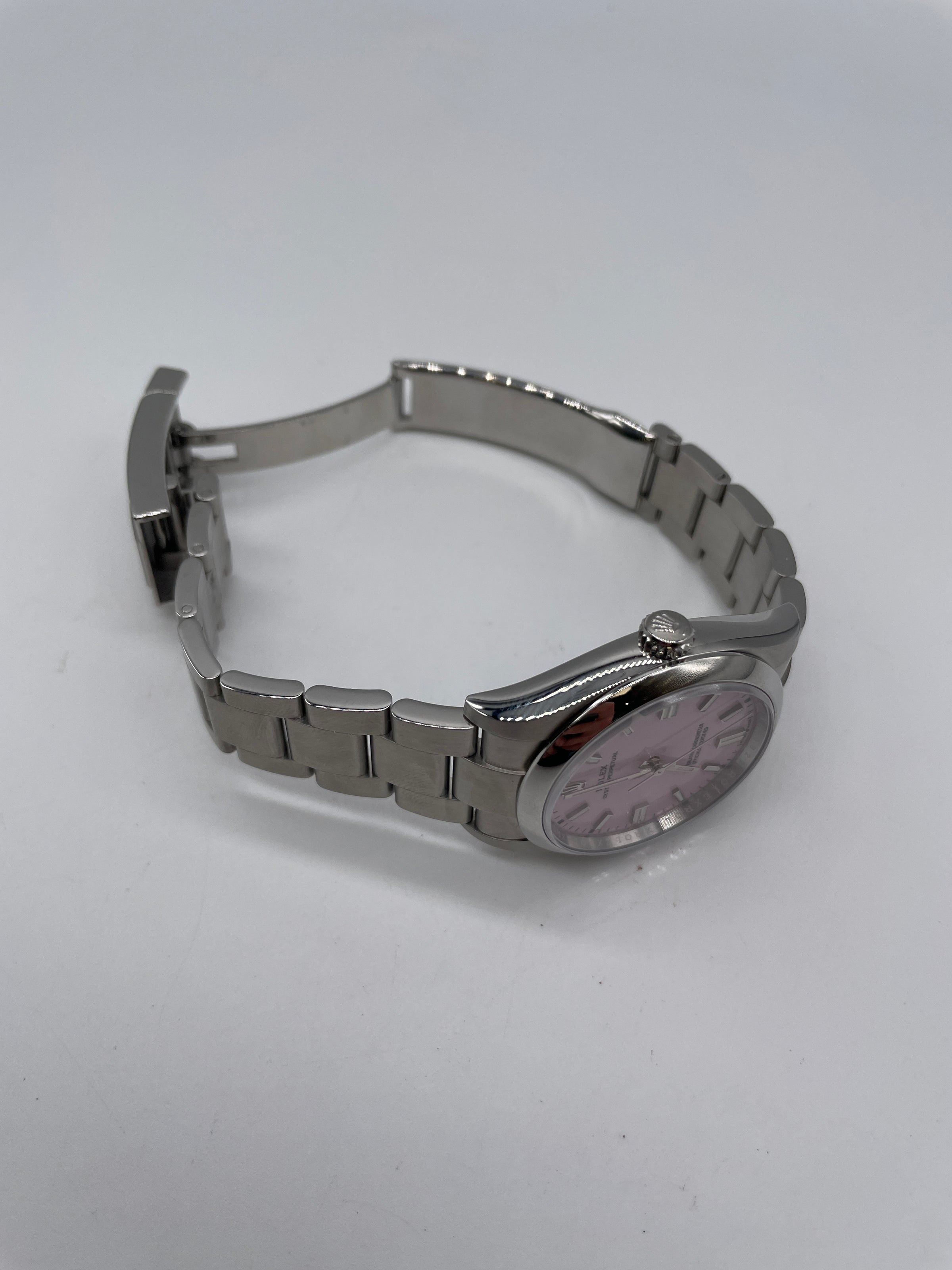 This stunning 36mm Rolex Oyster Perpetual features a 36mm stainless steel case, smooth bezel, candy pink dial with white hour markers and a oyster steel bracelet. These lacquered dials come in an array of vivid colours. Choose from Yellow, Turquoise Blue (aka the ‘Tiffany’ dial), Candy Pink, Coral Red, and Green. They’re vibrant, they’re fun and they look great on.