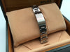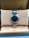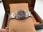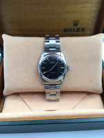 The Rolex Oyster Precision 6426 boasts a 34mm stainless steel Oyster case and Oyster bracelet, embodying the brand's signature blend of durability and elegance. The watch features a smooth bezel and a black dial, complemented by applied baton hour markers and sword hands. The minimalist design underscores its timeless appeal. Powered by the manual-winding Rolex Calibre 1225, the 6426 requires daily winding, offering a tactile connection to traditional watchmaking. This Rolex is fitted with a plexiglass (acrylic) crystal, characteristic of the era, which provides a vintage charm.