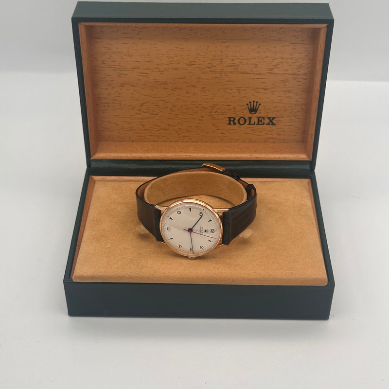 Beautiful Vintage Rolex Precision with a leather strap, a low dome crystal with white dial, applied gold indexes and Rolex logo. Original Rolex logo crown for winding and setting, 18ct rose gold.