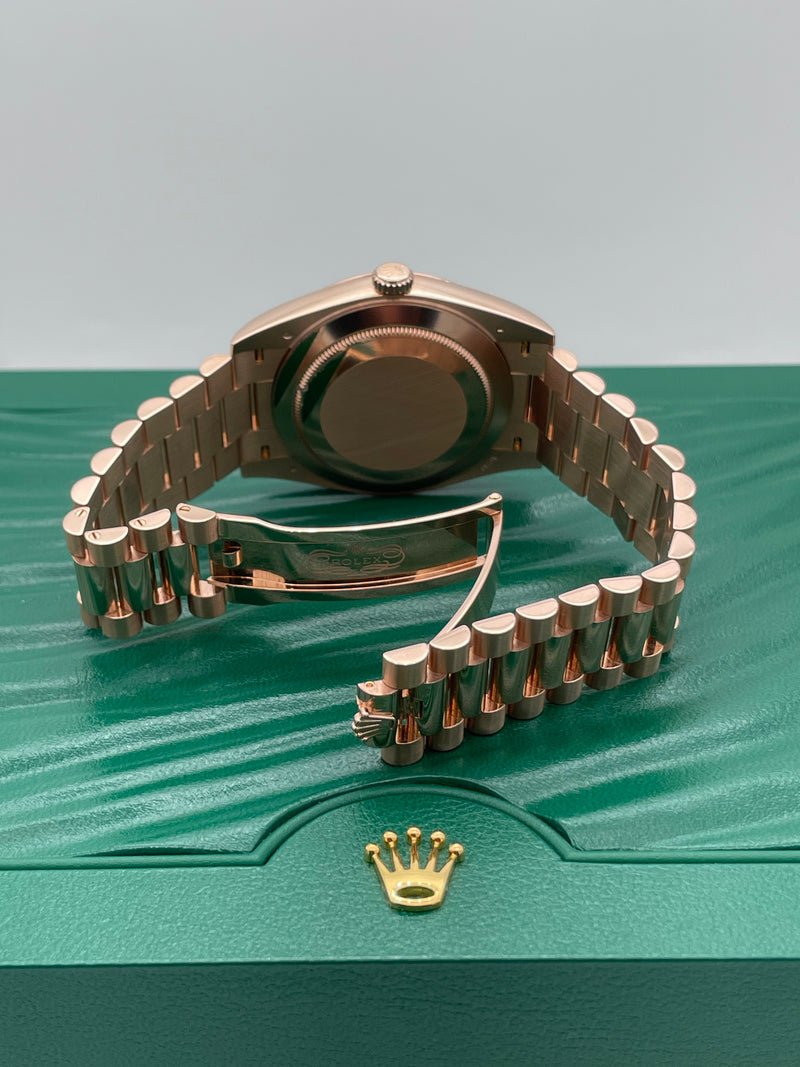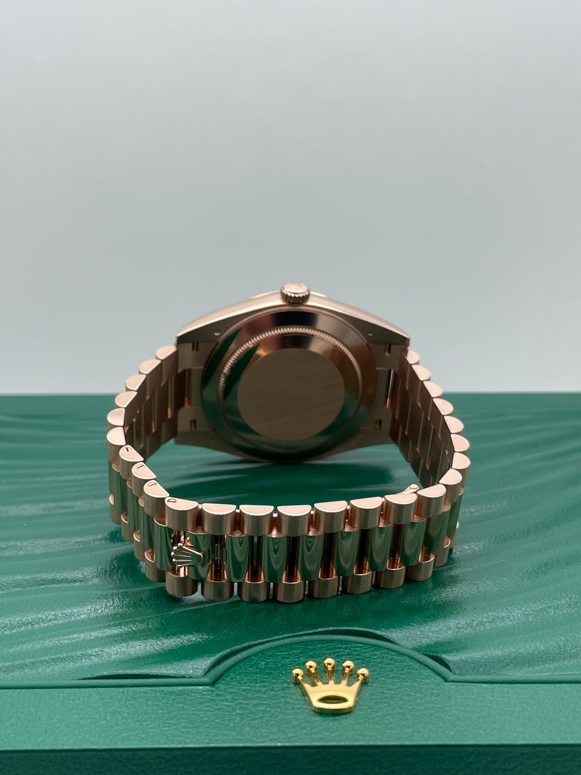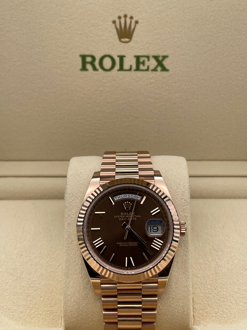 Rolex Rose Gold Day Date 40mm with a chocolate brown roman numeral dial on a presidential bracelet.