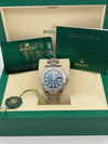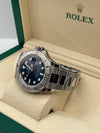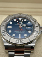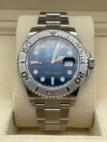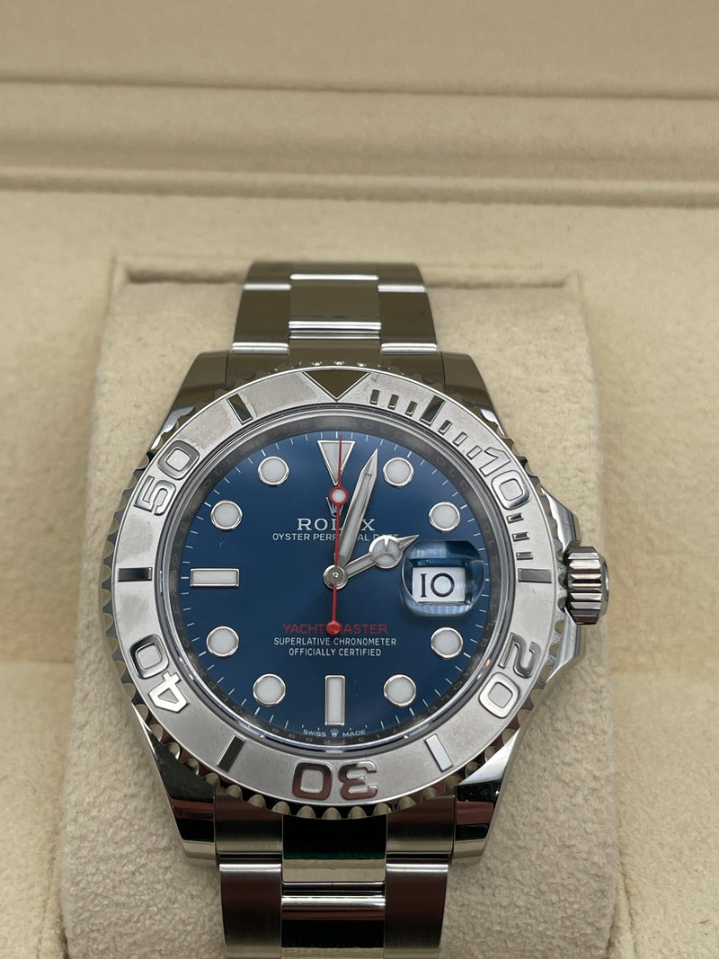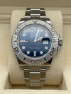 A 40mm Yacht-Master in stainless steel by Rolex. Featuring a bright blue dial with a date aperture and a platinum bi-directional rotatable bezel, with raised 60-minute numerals and graduations.