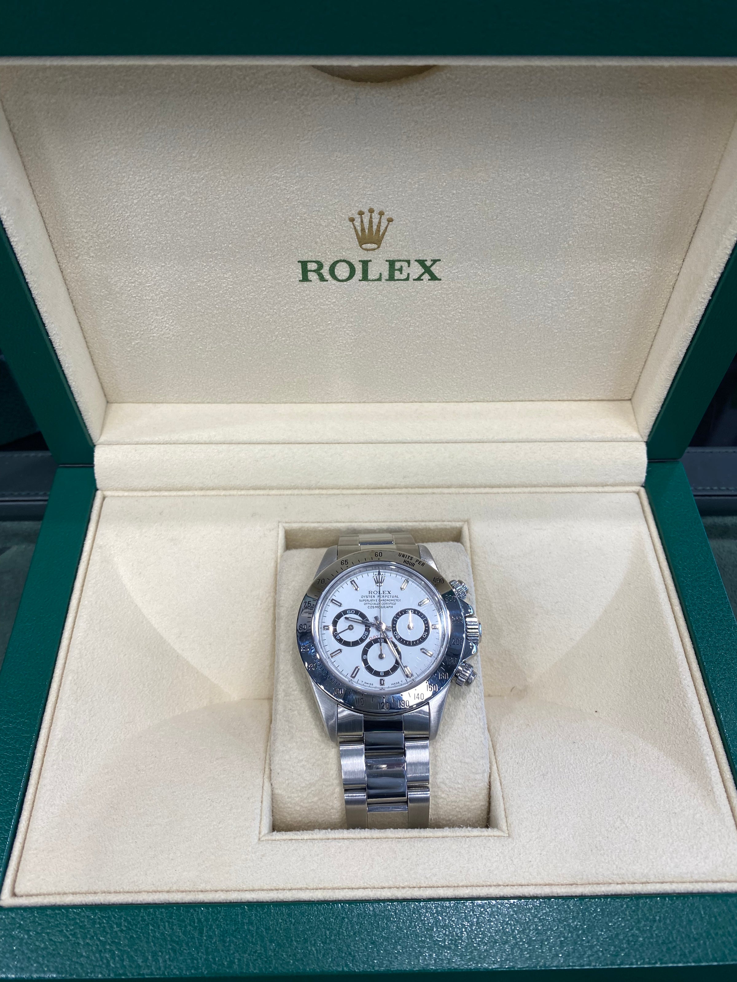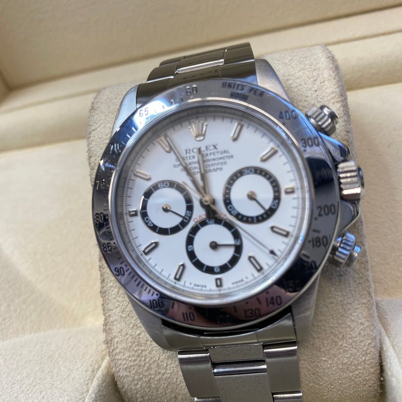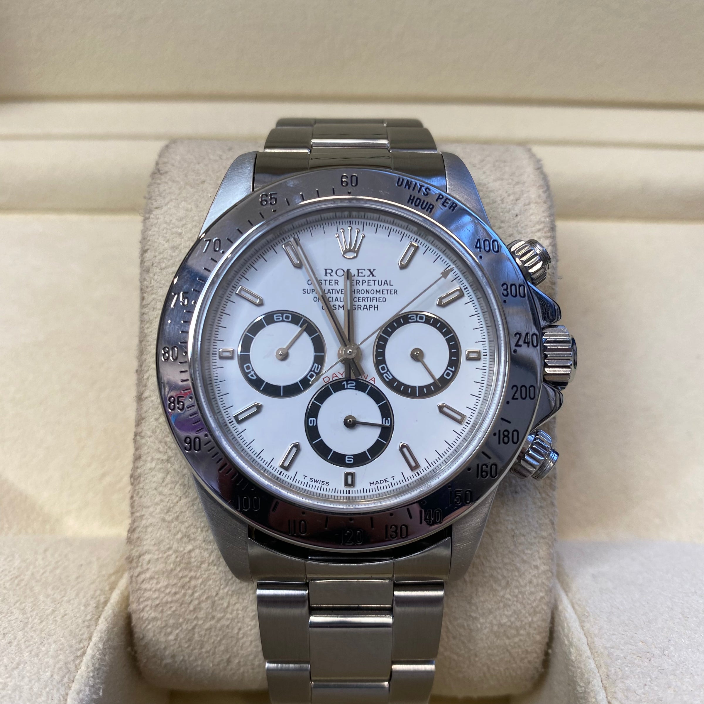 1994 Stainless Steel Rolex Zenith Daytona. This Rolex Daytona contains a Zenith movement which over time has become increasingly sought after, especially in this configuration. This watch features a white dial with black outlined sundials and an oyster bracelet.