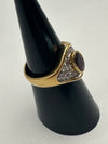 - Gemstones: Oval-cut ruby, surrounded by a halo of round brilliant-cut diamonds