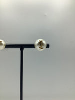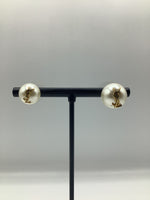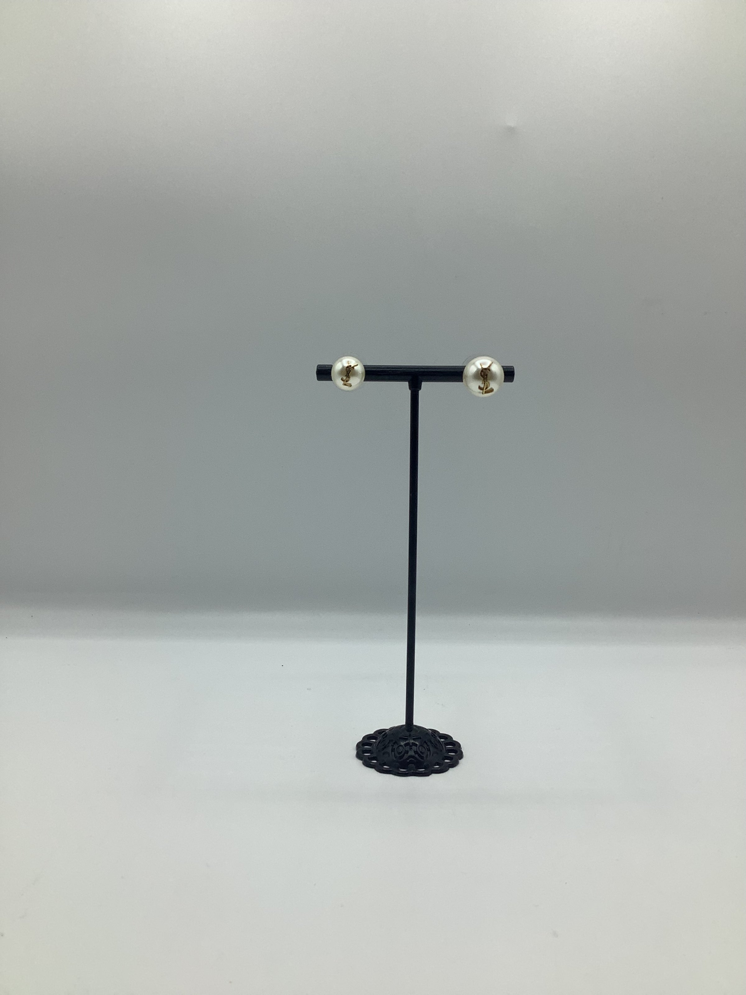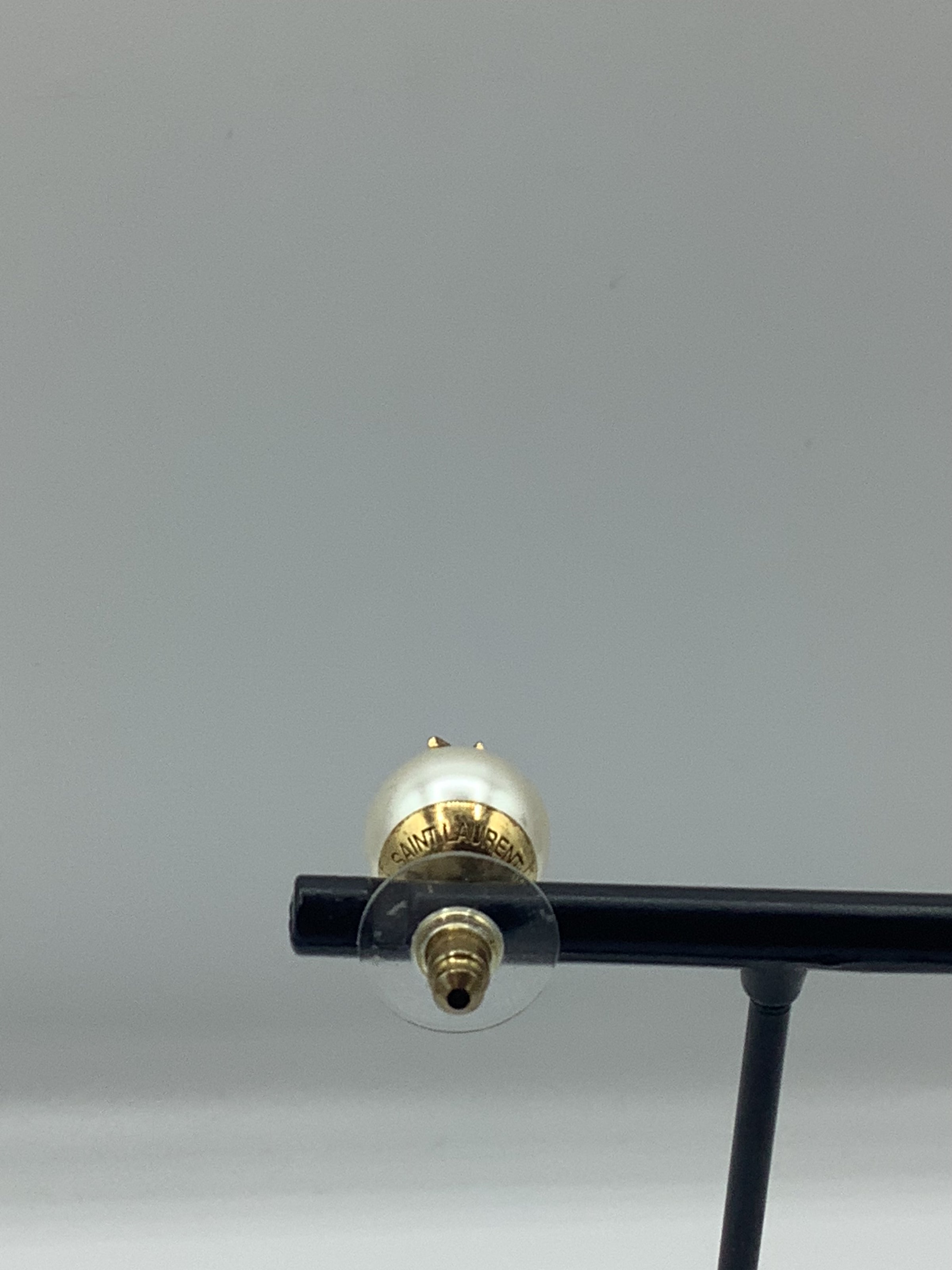Introducing the Saint Laurent Cassandre Asymmetric Pearl Earrings, a harmonious blend of classic elegance and modern design. These earrings feature an asymmetric composition, with one earring showcasing a small pearl and the other a larger pearl, both crafted from lustrous glass. The iconic YSL monogram, known as the Cassandre logo, is delicately placed on each pearl, adding a touch of brand heritage. Constructed from gold-tone brass, these earrings exude luxury and sophistication. The small pearl measures approximately 1 cm in diameter, while the larger pearl is about 1.2 cm, creating a subtle yet distinctive asymmetry.
