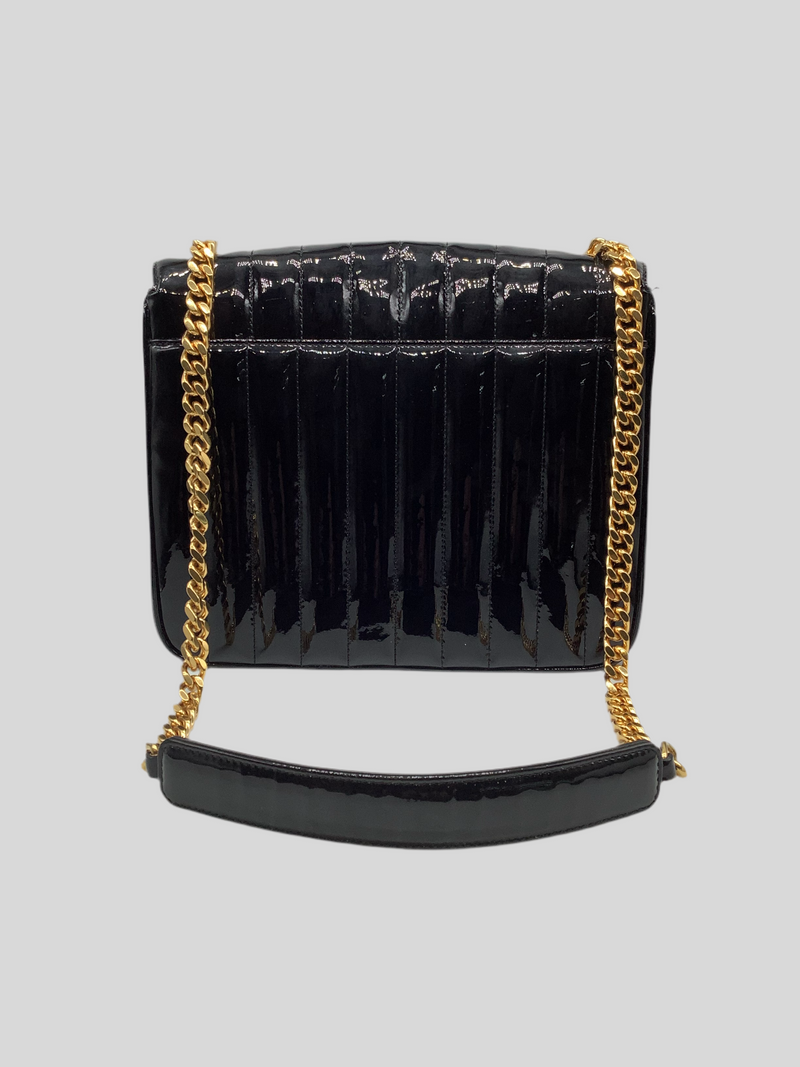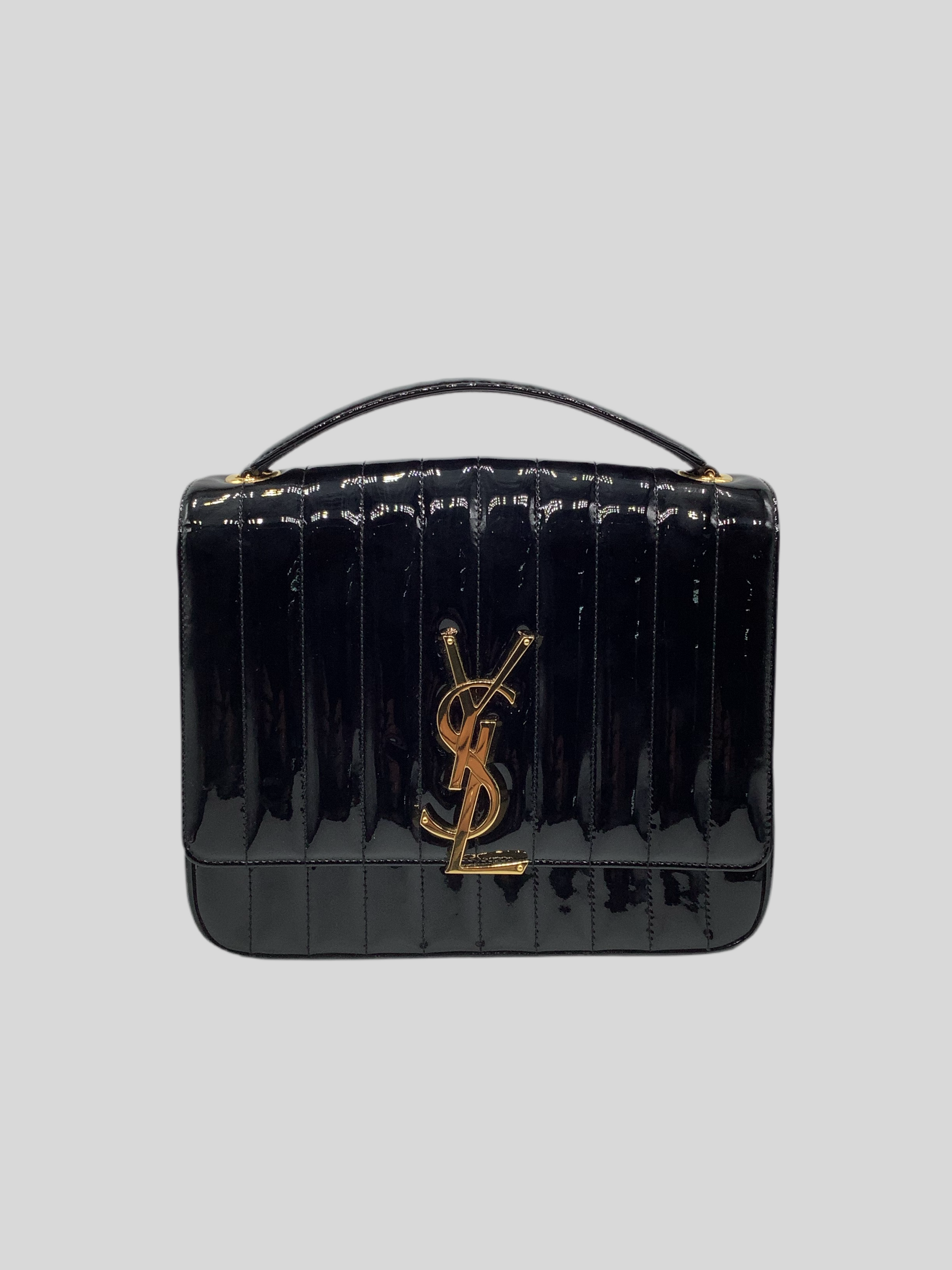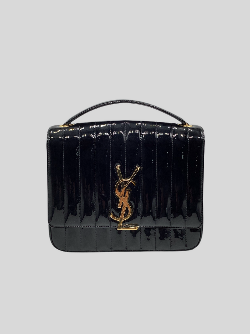 Materials & Design: The Yves Saint Laurent Patent Matelassé Monogram Large Vicky Chain Bag in black is meticulously crafted from high-quality patent leather, featuring a distinctive matelassé quilted pattern that exudes sophistication. The bag's glossy finish enhances its luxurious appeal, making it a standout accessory for both day and evening wear.