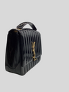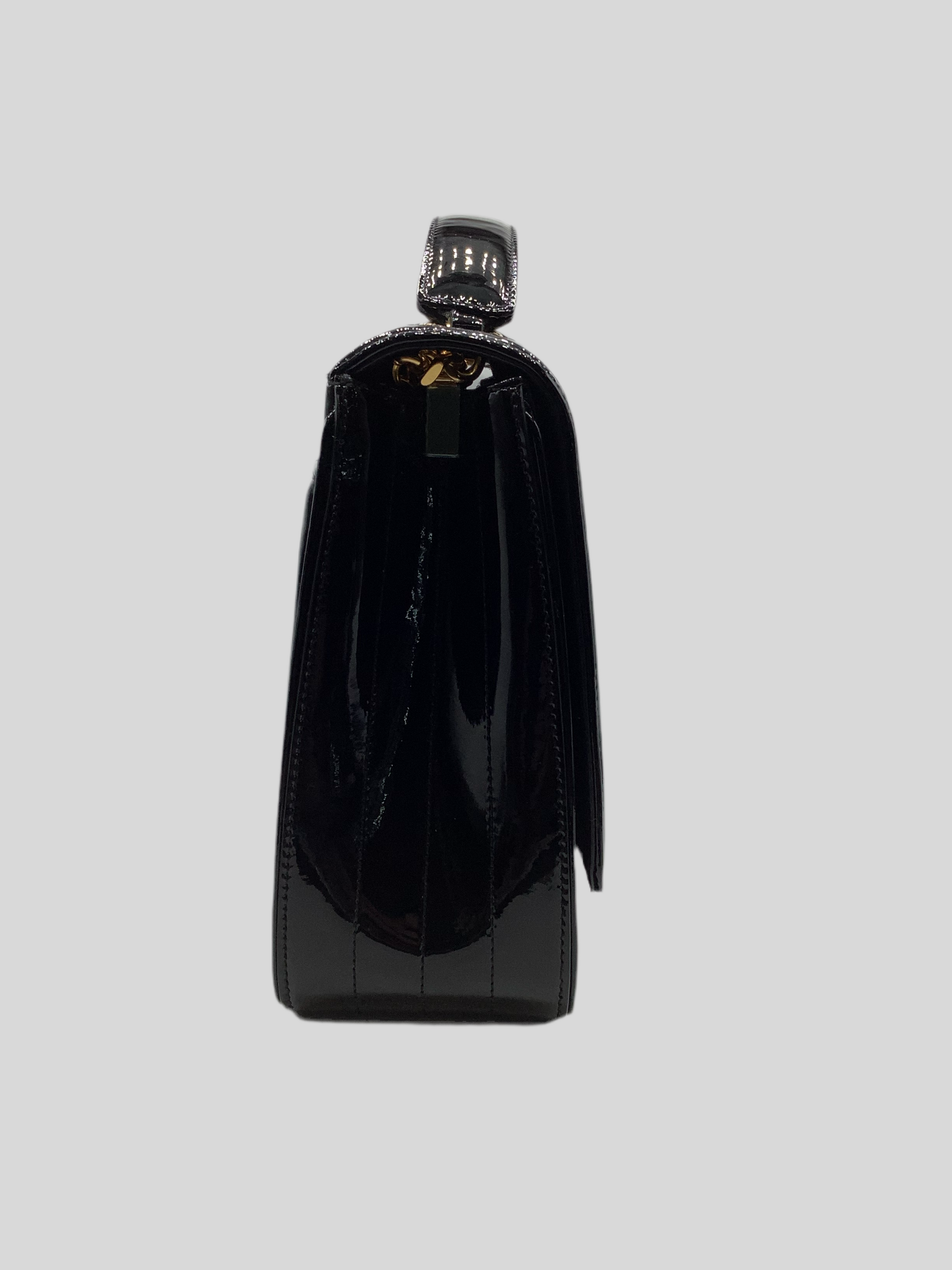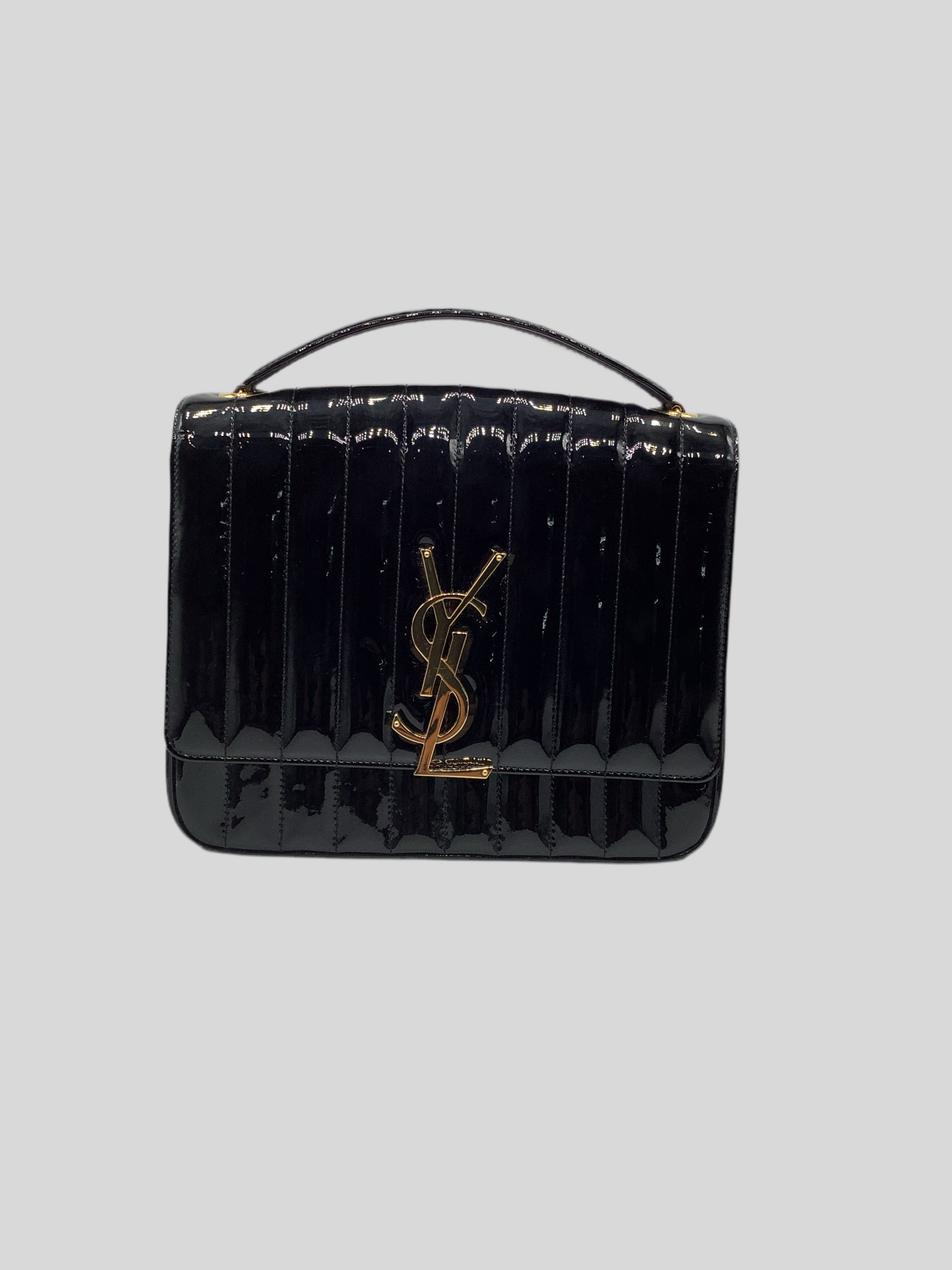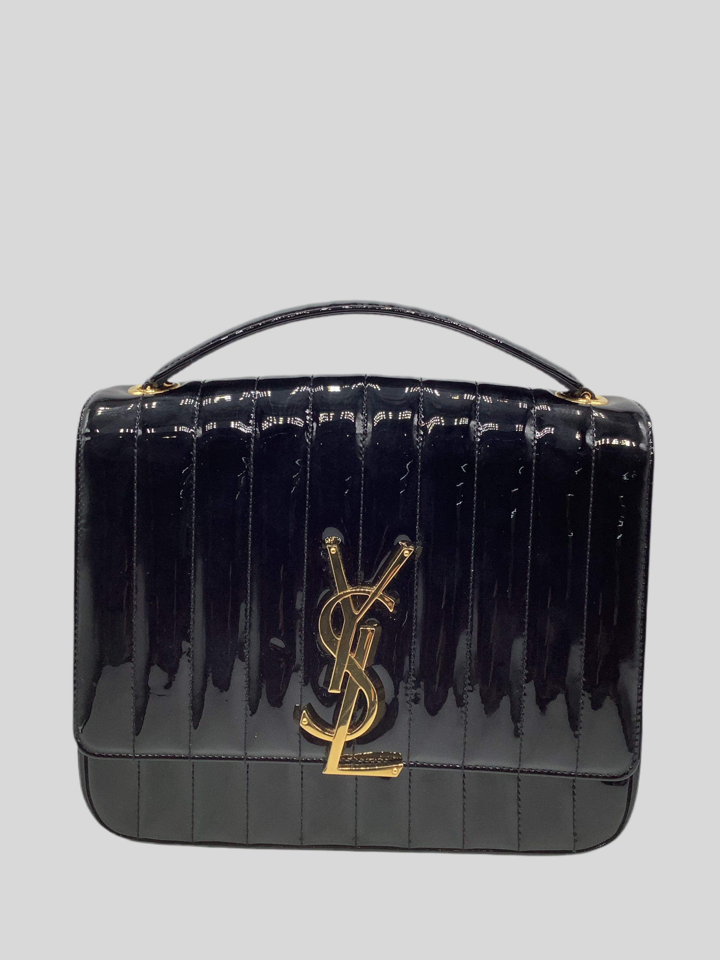 Materials & Design: The Yves Saint Laurent Patent Matelassé Monogram Large Vicky Chain Bag in black is meticulously crafted from high-quality patent leather, featuring a distinctive matelassé quilted pattern that exudes sophistication. The bag's glossy finish enhances its luxurious appeal, making it a standout accessory for both day and evening wear.
