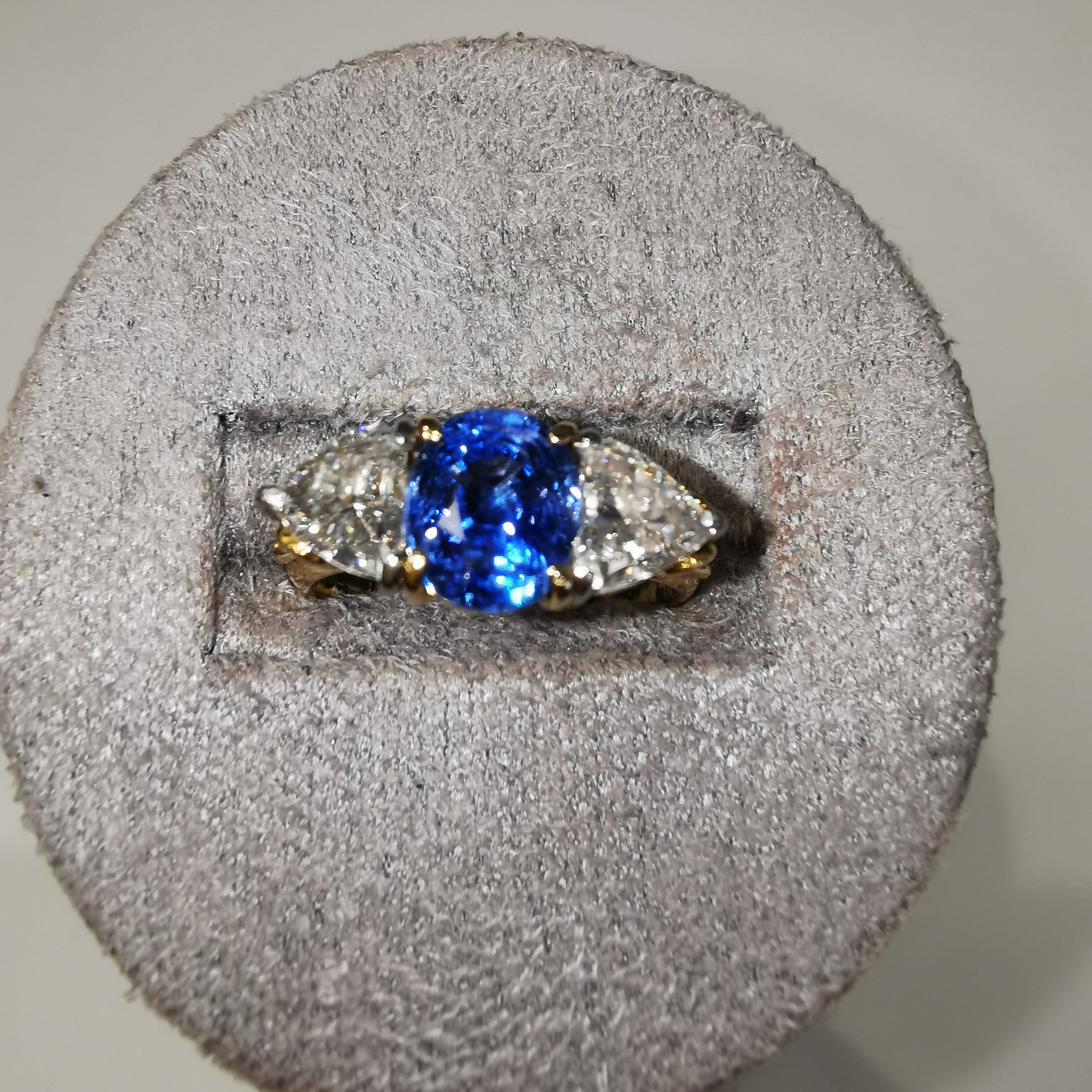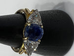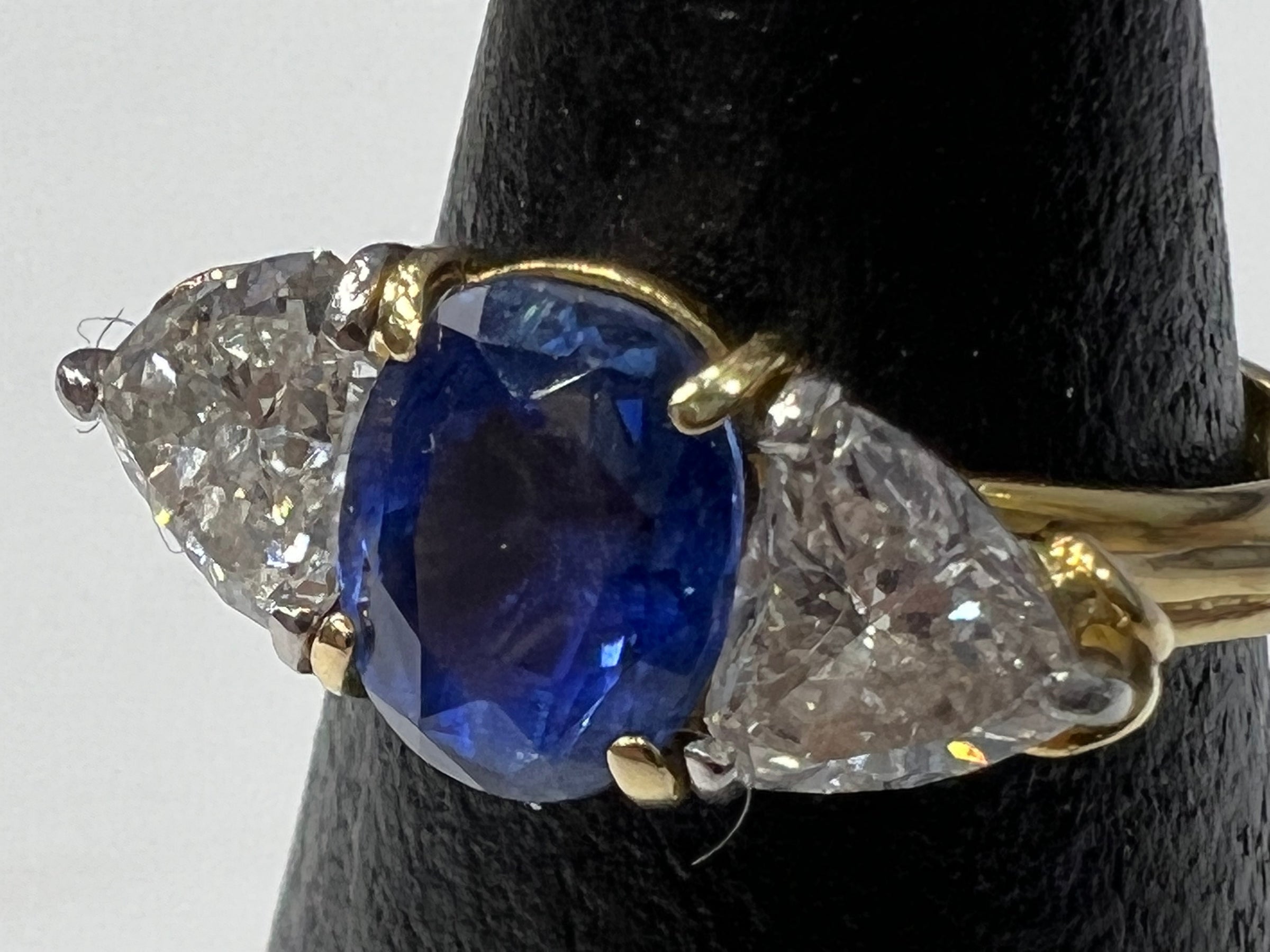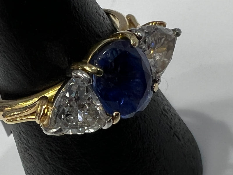 Ladies 18ct Yellow And White Gold Sapphire And Diamond Three Stone Ring. A Stunning Oval Cut Ceylon Sapphire Claw Set With A Trillion Cut Diamond On Each Shoulder, A Beautiful Hand Made Mount