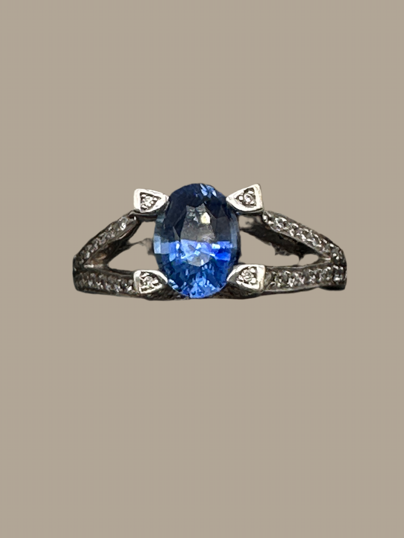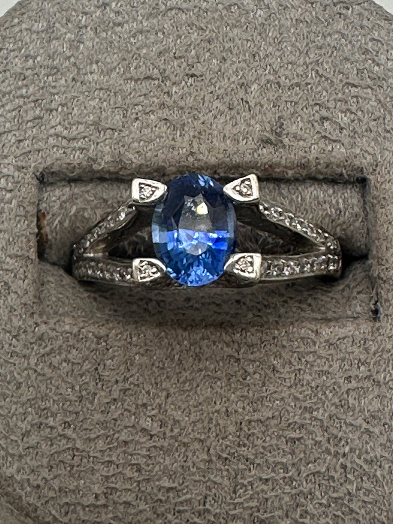 This beautiful Sapphire and Diamond Ring features a striking oval-cut cornflower blue sapphire, known for its vibrant and rich blue hue, set in a stunning split shank band. The band is pavé-set with brilliant-cut diamonds, adding exceptional sparkle and elegance to the design. The combination of the sapphire’s vivid colour and the brilliance of the diamonds creates a captivating contrast, set in luxurious 14ct white gold for a polished and sophisticated finish. -