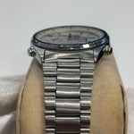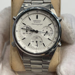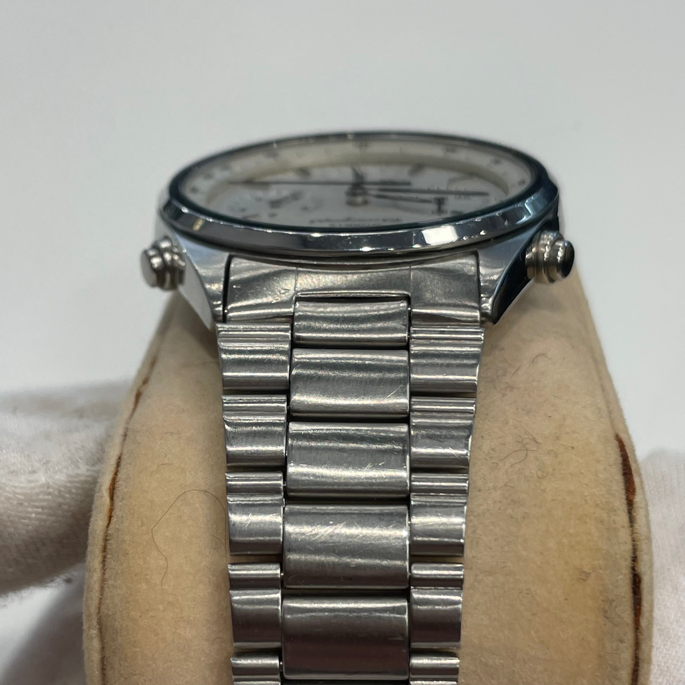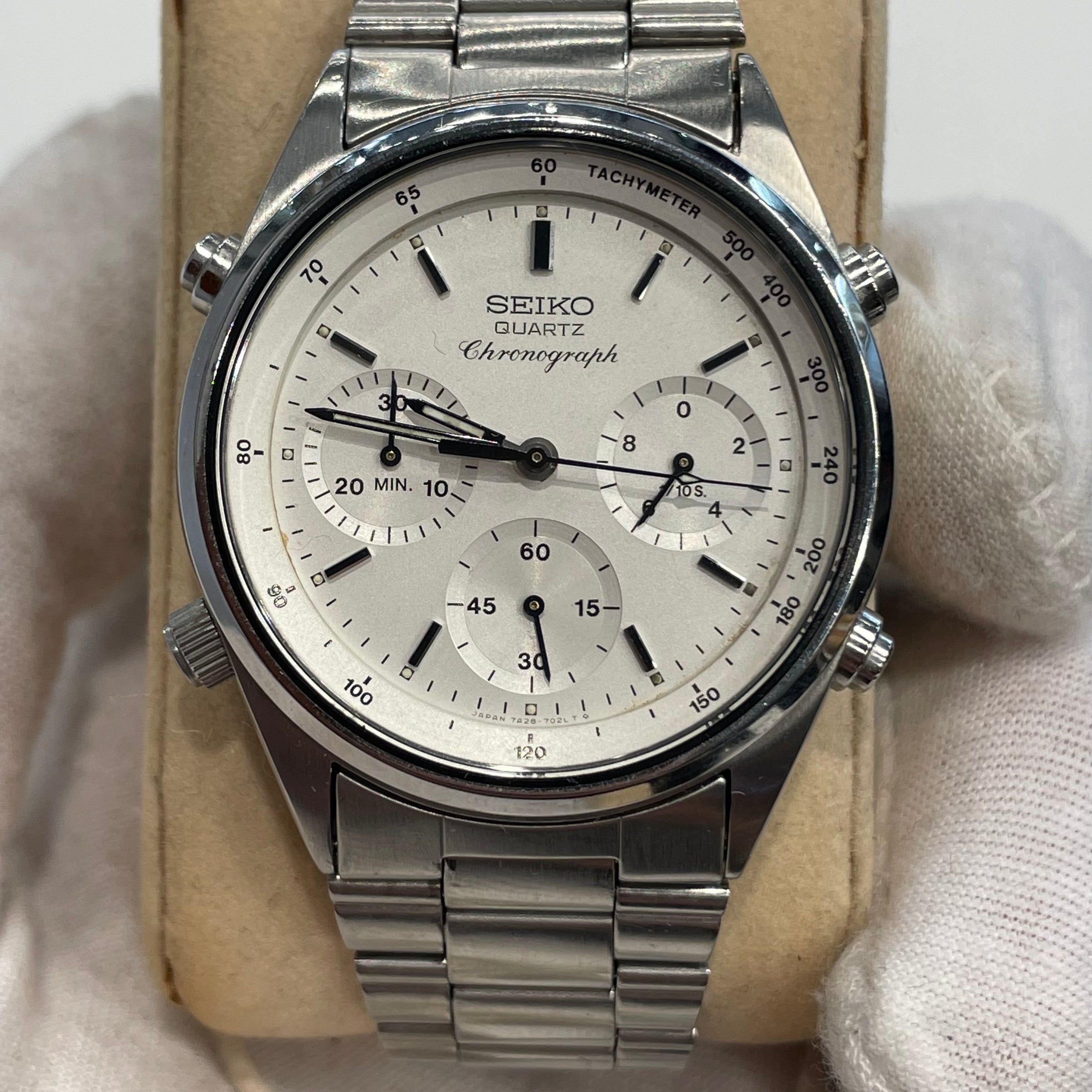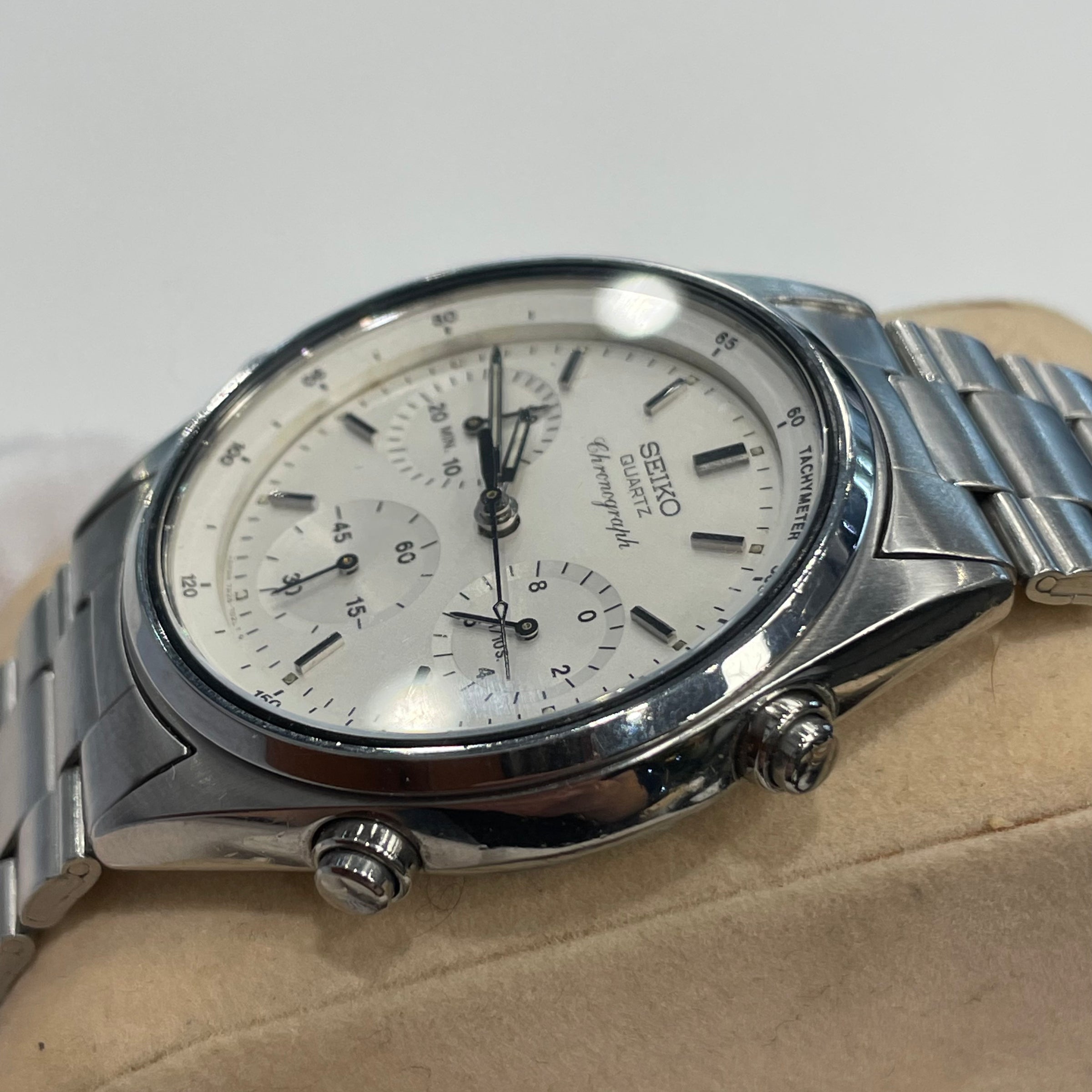 The Seiko 7A28-7020 has a white dial, three subdials and steel case and steel bracelet. Note that a similar model is available with day-date (7A38), but Bond wears the one without the day-date. The same model can still be found, also in gold.